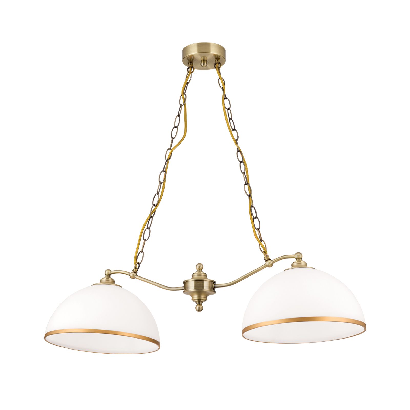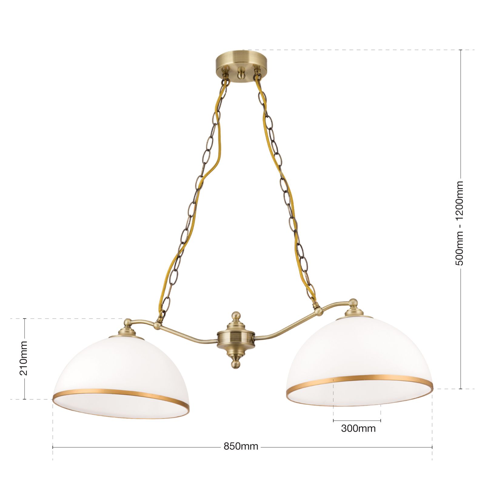 OLD LAMP eignet sich mit ihrer länglichen Form idealerweise für eine Anbringung über einem Esstisch. Den gewünschten Bereich leuchtet sie mit ihren 2 Flammen wunderbar aus, sodass einem gemütlichen Dinner nichts im Wege steht. Sie gibt das Licht nach unten und in den Raum ab, wobei die opal matten Glasschirme für eine homogene und angenehme Lichtverteilung sorgen. Abgerundet wird das die Leuchte mit einem Oberflächenfinish in Patina, wobei ein feines Zierband die Glasschirme schmückt. Die 2 E27-Fassungen werden mit maximal 40 Watt je Fassung betrieben.