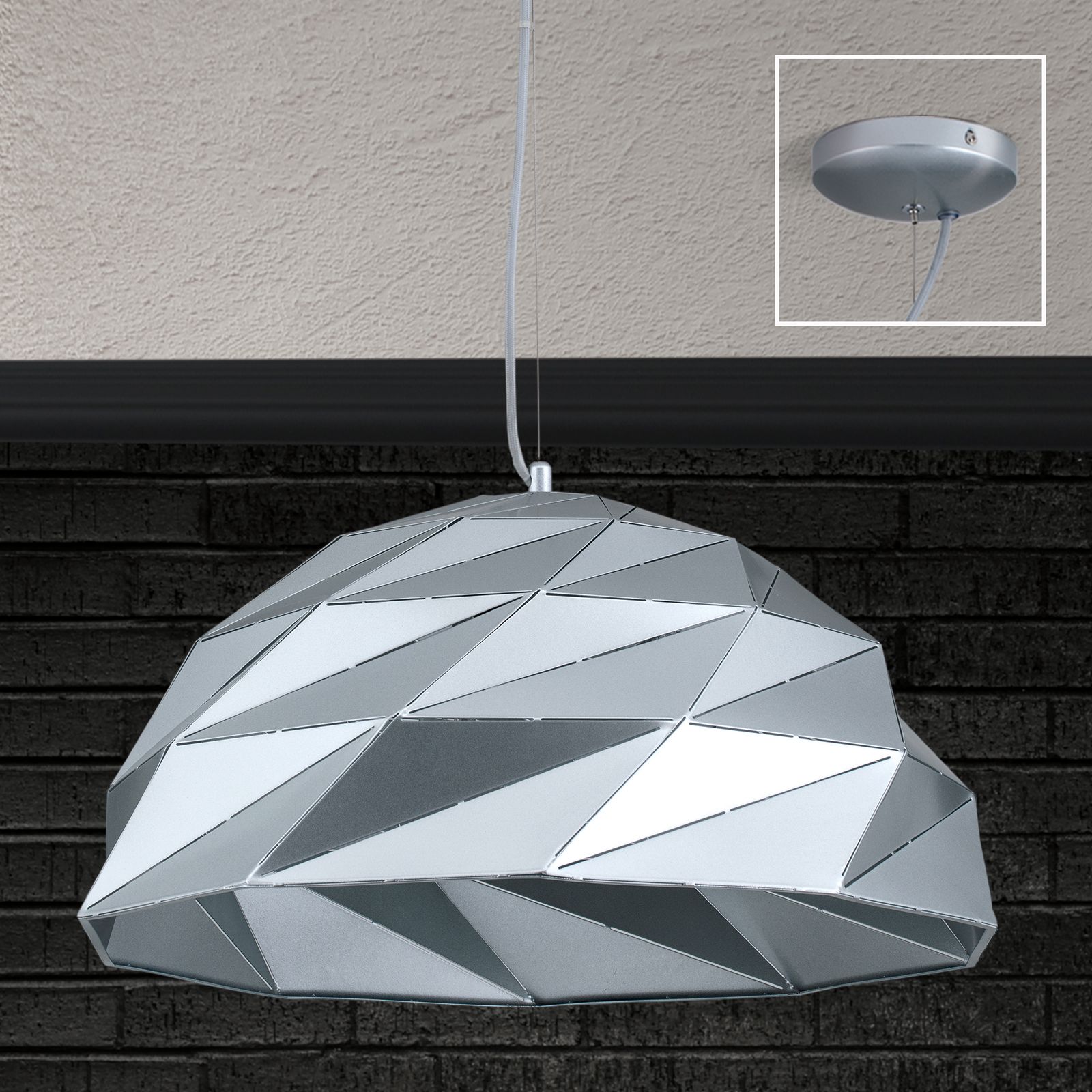 Schlicht und elegant gehaltene Interieurs lassen sich mit der Hängeleuchte namens ORIGAMI aufgrund des modernen Stylings bestens ausstatten. Ein Finish in Silber veredelt den Leuchtenkörper aus Metall. Die Hängeleuchte mit einem bemerkenswerten Durchmesser von 56 Zentimetern ist mit 3 E27-Fassungen ausgestattet und kann mit maximal 60 Watt je Fassung ausgestattet werden.