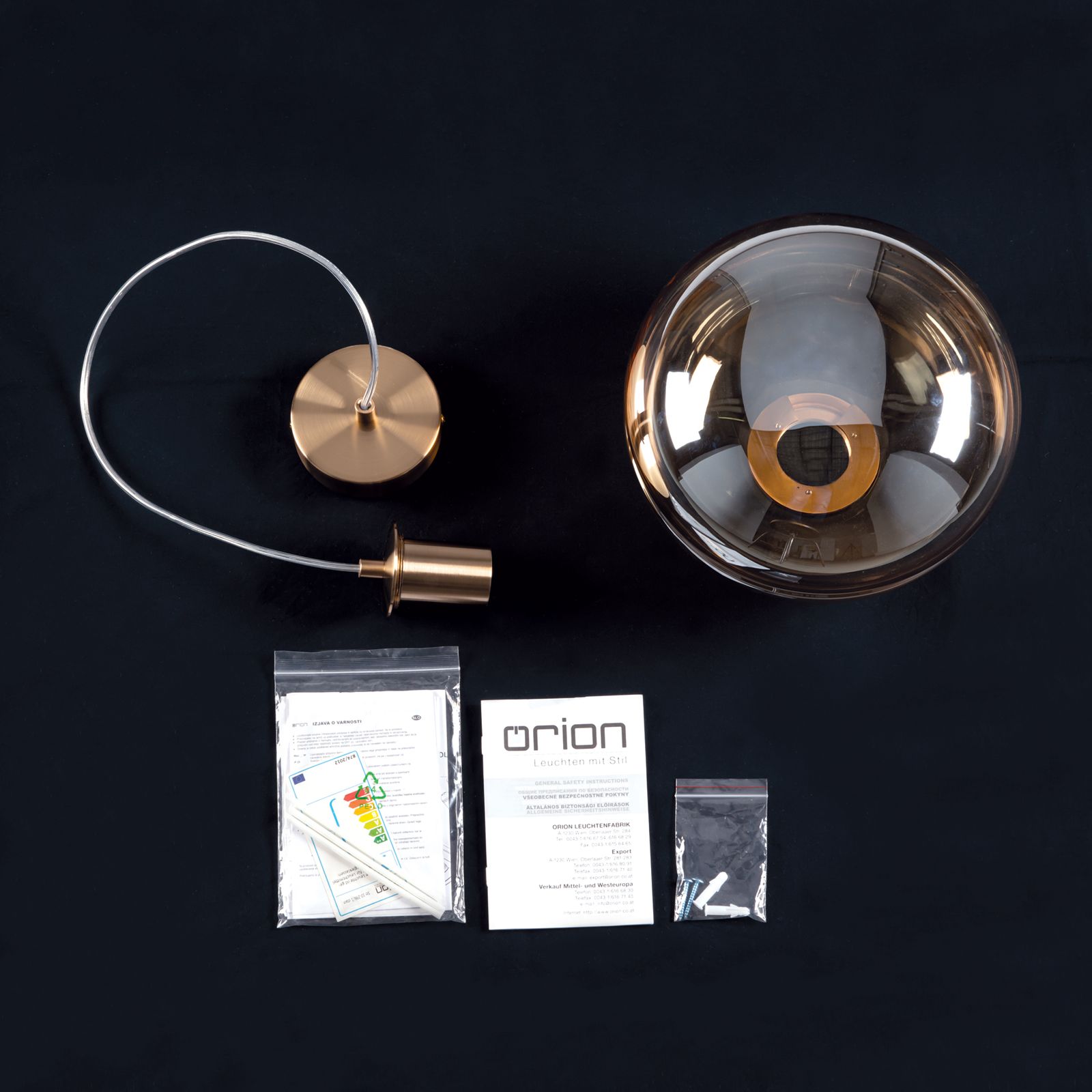 Hängeleuchte RICHARD erinnert aufgrund seiner Form an ein perfektes französisches Macarons und bietet sich daher idealerweise zur Beleuchtung eines Esstisches an. Natürlich kann die Leuchte in jedem anderen Wohnraum alleine oder in Gruppen angeordnet ihren Charme spielen lassen und dort für eine gute Beleuchtung sorgen. Befestigt an einem runden messing-matten Sockel hält ein weißes Kabel den formschönen Glasschirm in Amber, welcher für eine äußerst angenehme Lichtfarbe sorgt. Ausgestattet mit 1 E27-Fassung wirkt die Leuchte am besten mit einer sparsamen LED-Vintage-Glühbirne, die mit maximal 8 Watt betrieben wird und für eine energieeffiziente Beleuchtung sorgt.