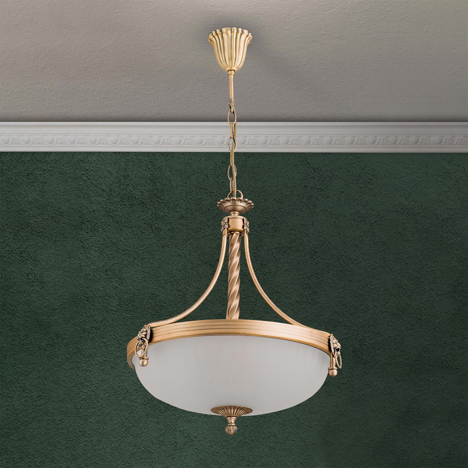 Die imposante Hängeleuchte ROCCA wirkt sehr elegant und repräsentativ in klassisch eingerichteteten Umgebungen wie etwa im Wohn- oder Esszimmer. Sie besteht aus einem verzierten Metallgestell und einem gewölbten Schirm, der aus opal-mattem Glas besteht und garantiert für eine blendfreie und homogene Lichtverteilung sorgt. Dabei strahlt das Licht nach unten hin sanft und nach oben hin heller, wodurch eine indirekte und zugleich stimmungsvolles Beleuchtung erzielt wird. Besonders beeindruckend sind die am Metallgestell montierten Löwenköpfe, die das Gesamtbild der Leuchte abrunden. Die Hängeleuchte mit einem Durchmesser von 42 cm lässt sich mittels Dimmfunktion in seiner Helligkeit regulieren. Sie ist mit 3 E27-Fassungen versehen und kann mit maximal 60 Watt bestückt werden. Werden sparsame LEDs verwendet, eignet sich diese Leuchte sehr gut für eine energiesparende Beleuchtung.