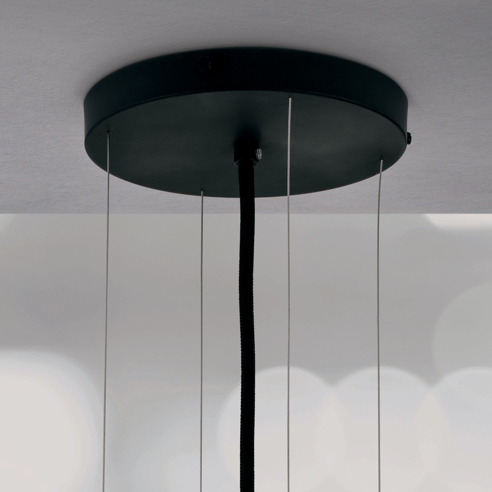 An vier Stahlseilen und einem farblich abgestimmten Textilkabel, die in einem zylindrischen Baldachin münden, ist der Schirm befestigt.