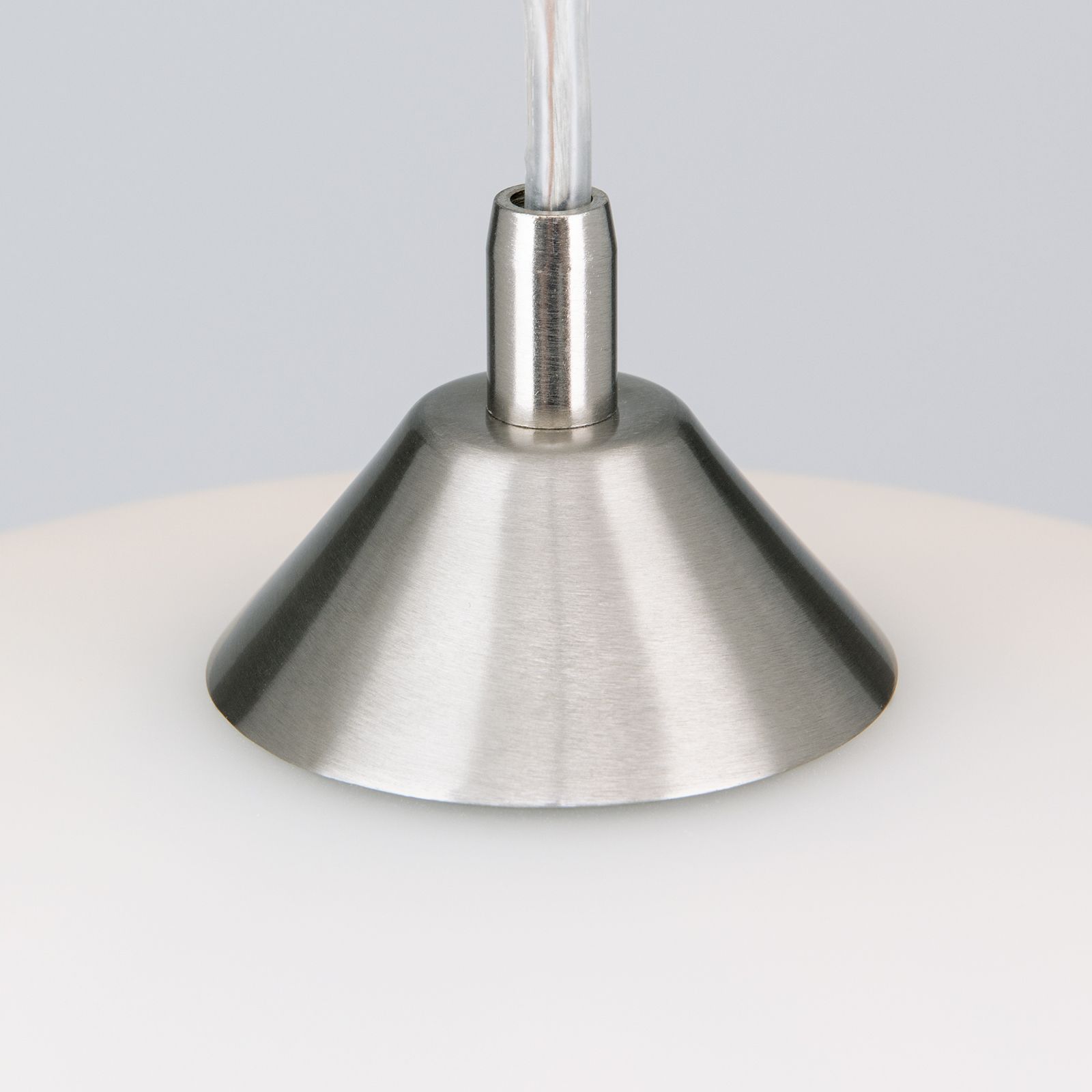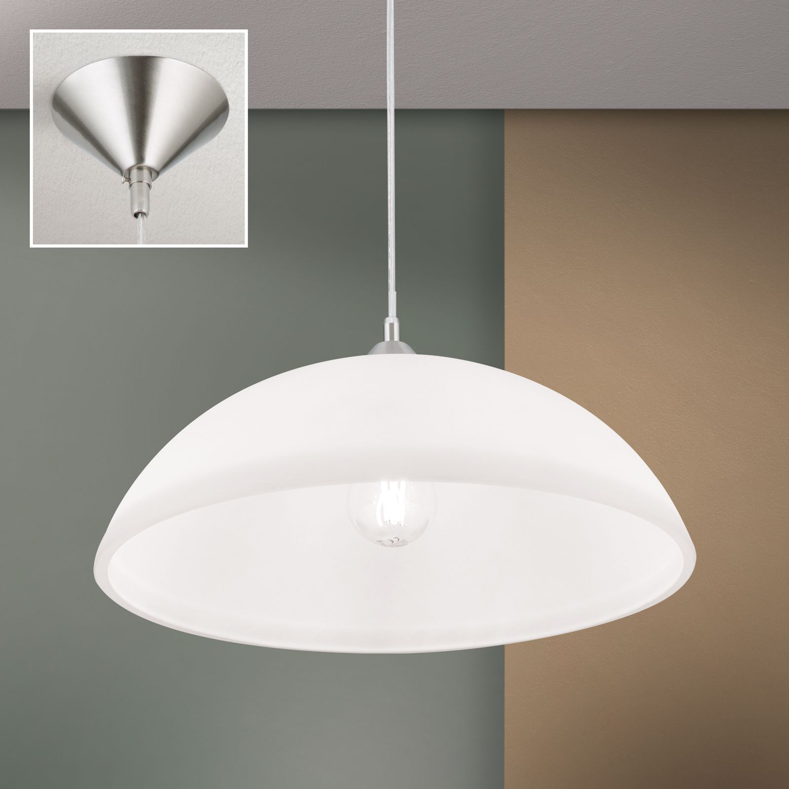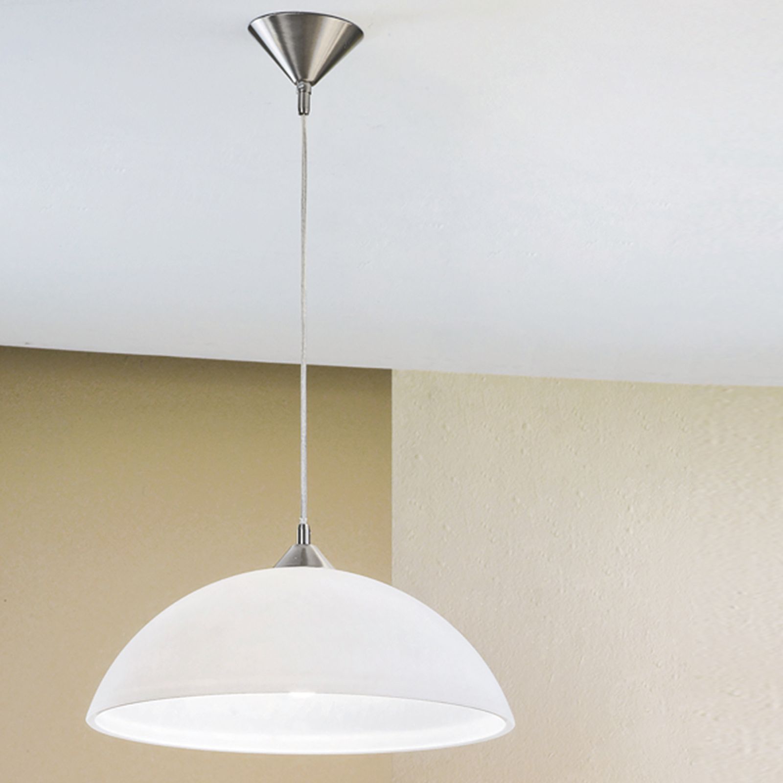 Die Hängeleuchte SUSAN besticht durch ihre schlichte, aufgeräumte Form. Ein klassischer halbkreisförmiger Lampenschirm aus Glas streut das Licht gleichmäßig in den Raum und sorgt über einem Ess- oder Küchentisch für eine gemütliche Wohnsituation. Das Kabel in aktueller Transparentoptik führt von einem Kegel an der Schirmoberseite zu einer kegelförmigen Rosette am Plafond. Die Oberfläche des Stahlgestells spiegelt die wertige Ausführung wider. Für die E27-Fassung für höchstens 60 Watt empfiehlt sich eine matte, runde Globe-Lampe. Wird eine LED-Lampe eingesetzt, werden Strom und Geld gespart.