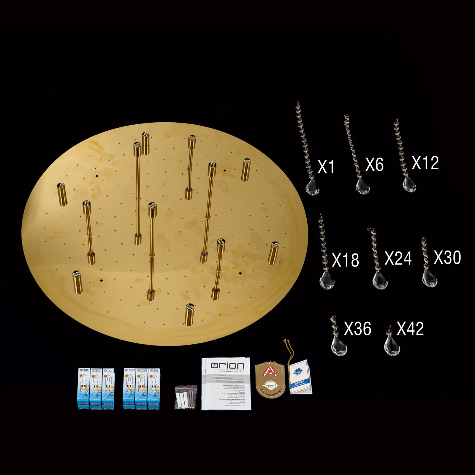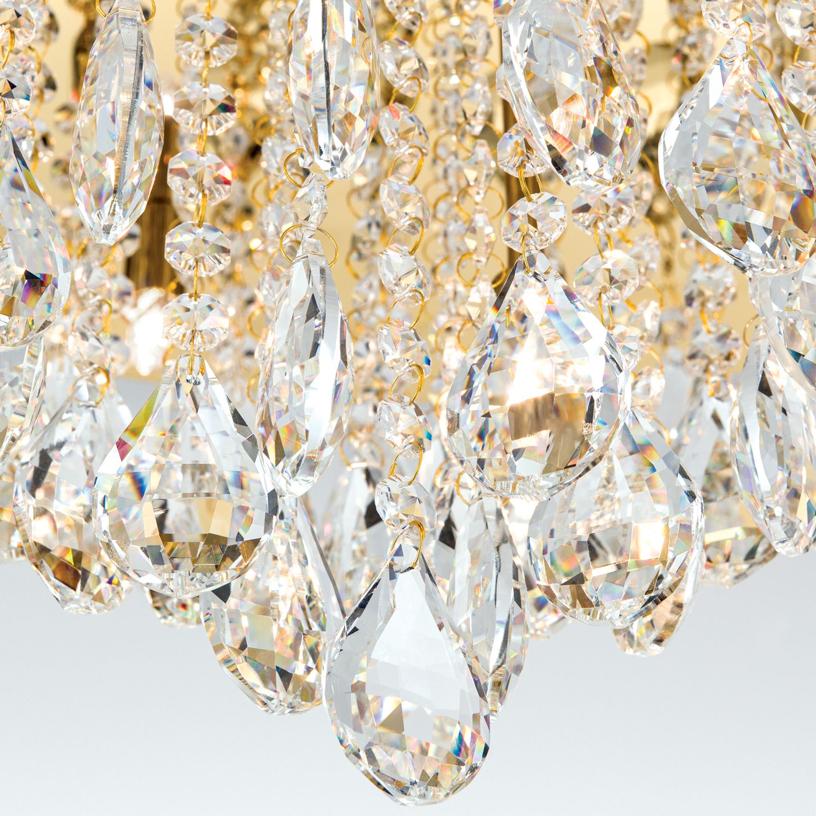 Der Lüsterbehang aus hochwertigem K9-Kristall setzt sich aus zahlreichen Kristallketten zusammen, die konzentrisch auf einer vergoldeten, runden Zierplatte angebracht sind und sich zum Rand hin verjüngen. In dieser Zierplatte spiegelt sich der opulente Kristallbehang und steigert funkelnde Prachtentfaltung.