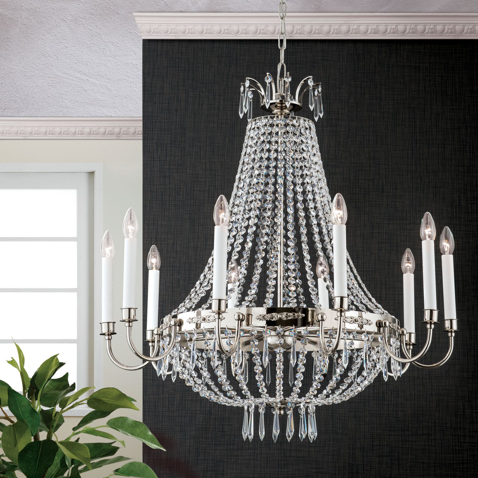 Der Kronleuchter EMPIRE CRYSTAL ist wahrlich ein schickes Schmuckstück für klassisch eingerichtete Wohn- oder Objekträume. Aufgrund seiner Gesamthöhe von 156 cm eignet er sich idealerweise für Räumlichkeiten mit großer Deckenhöhe.