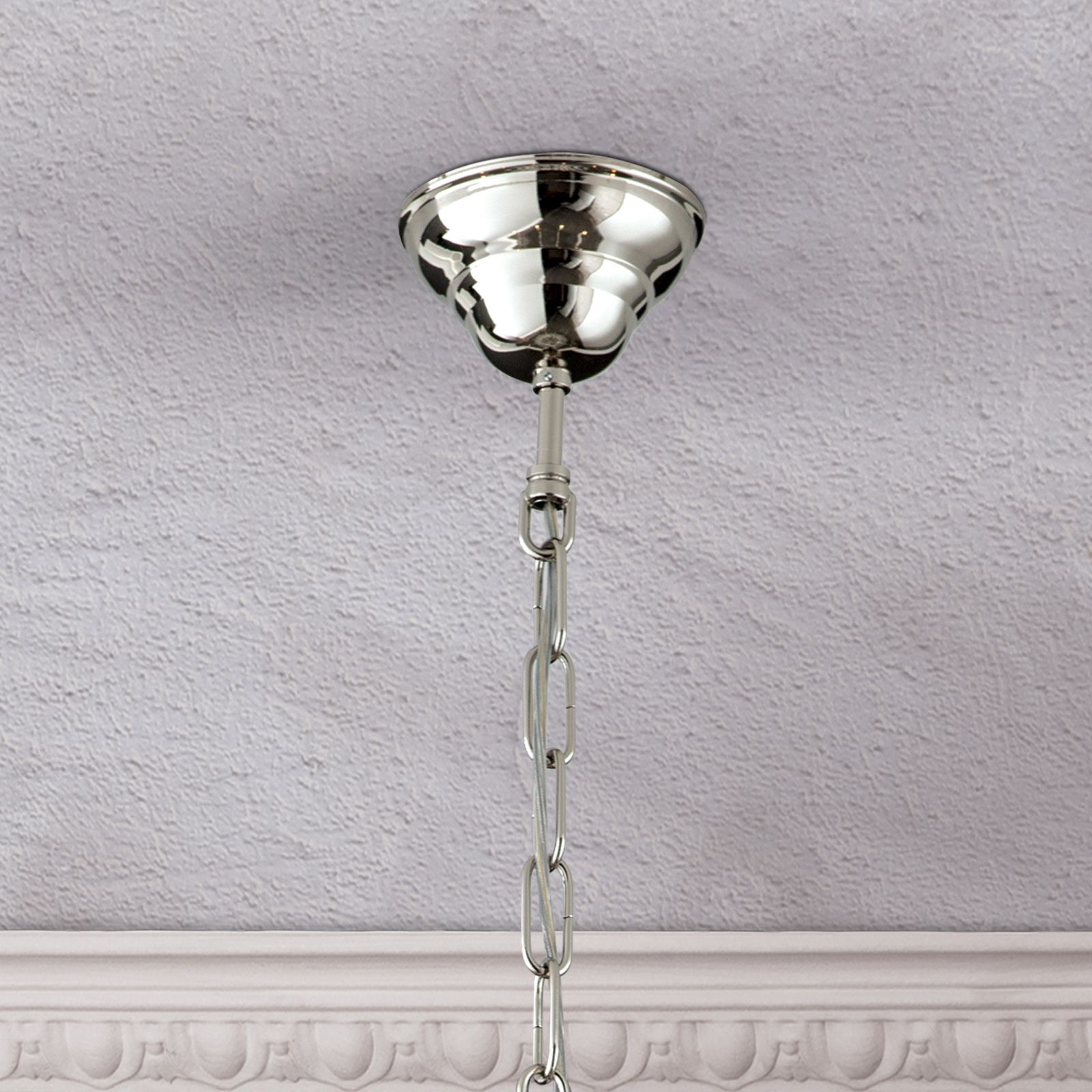 In der klassischen Form eines Korblüsters besteht das Gestell aus Vollmessing mit einem schön geprägten Zierband, an dem die Leuchtarme befestigt sind. Zu Ketten verbundene Kristalle aus dem Hause Asfour in Koppenform formen den Schirm des Gestells, das mit zusätzlichen mit Kristallen in Tropfenform an der oberen sowie unteren Schale und unterhalb des Zierbandes geschmückt ist. Die 10 E14-Fassungen, die sich hinter der Fassungsverkleidung der Kerzen verstecken, werden mit maximal je 40 Watt betrieben. Um für die perfekte Stimmung zu sorgen, kann mithilfe einer Dimmers die Helligkeit reguliert werden.