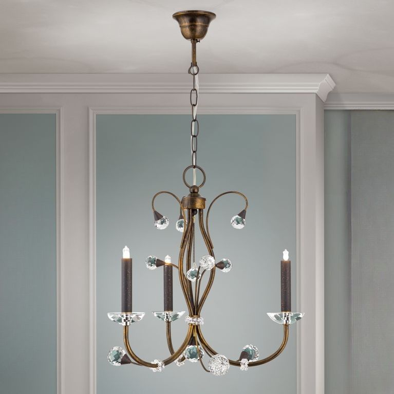 Für Unbeschwertheit sorgt der Kronleuchter EREMITAGE mit seinem luftig leichten Design und fügt sich gekonnt in klassisch eingerichtete Wohn- und Objekträume ein. Die klassische Linienform eines Lusters trifft auf moderne Formen in einer schlanken Interpretation. Als Einzelleuchte oder in Gruppen angeordnet erhellt er den Raum und sorgt für eine behagliche Stimmung. Sein geschwungenes Gestänge mit der Oberfläche im Antik-Finish trägt den hochwertigen Kristallbehang aus dem Hause Swarovski. An den 3 Armen befinden sich die G9-Fassungen, die mit maximal je 40 Watt betrieben werden können und durch Kerzenschalen aus Kristallglas geziert werden. Das perfekte Licht für das beabsichtigte Ambiente erzielen Sie mithilfe eines Dimmers.