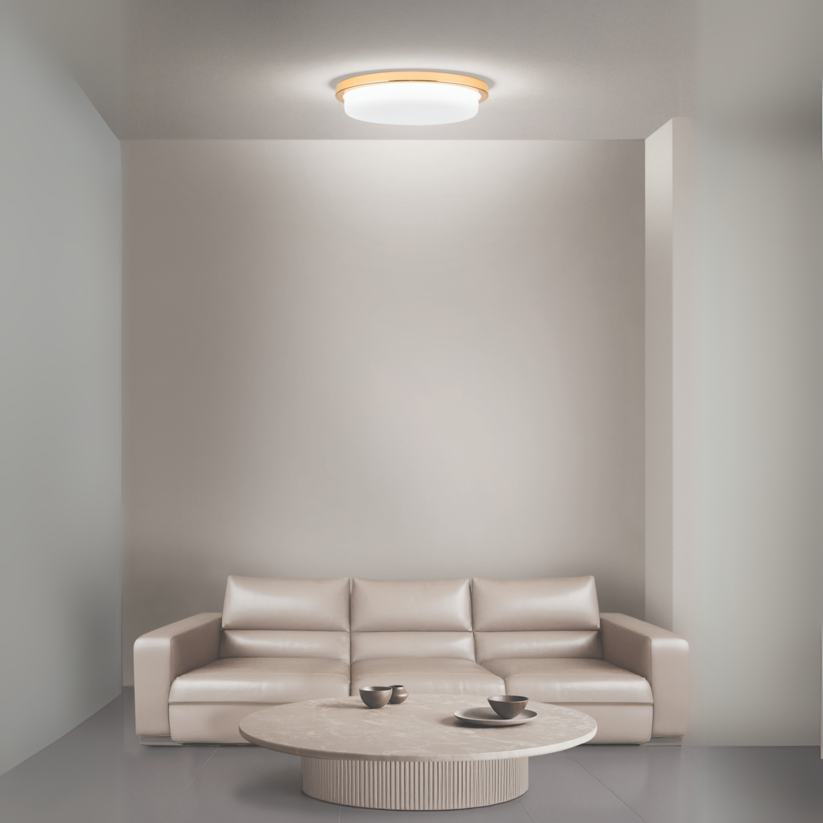 Das warmweiße, dimmbare Licht der verbauten LED und die geringe Höhe des Lichtkörpers von nur 5,4 Zentimetern erlauben den Einsatz in Räumen beliebiger Höhe.