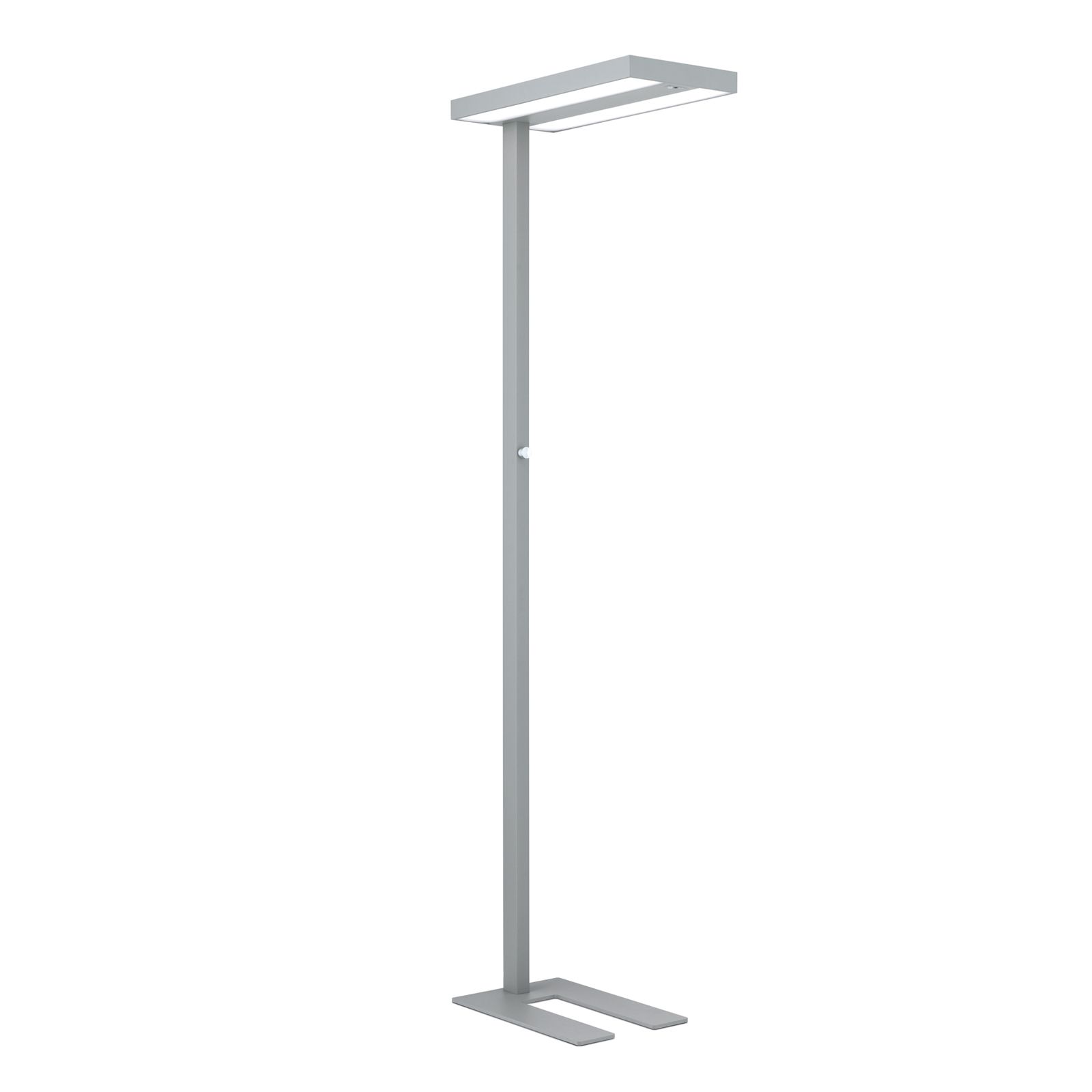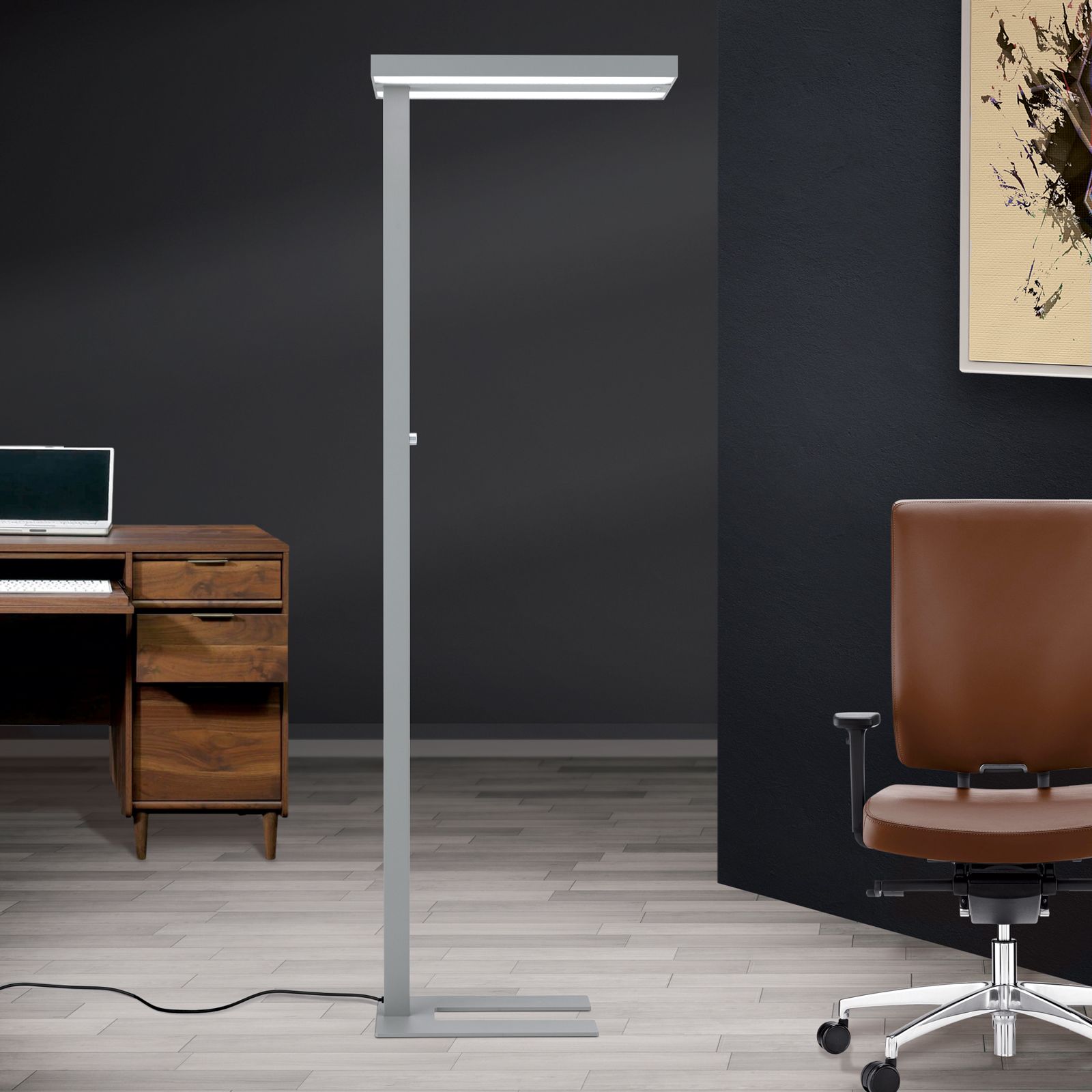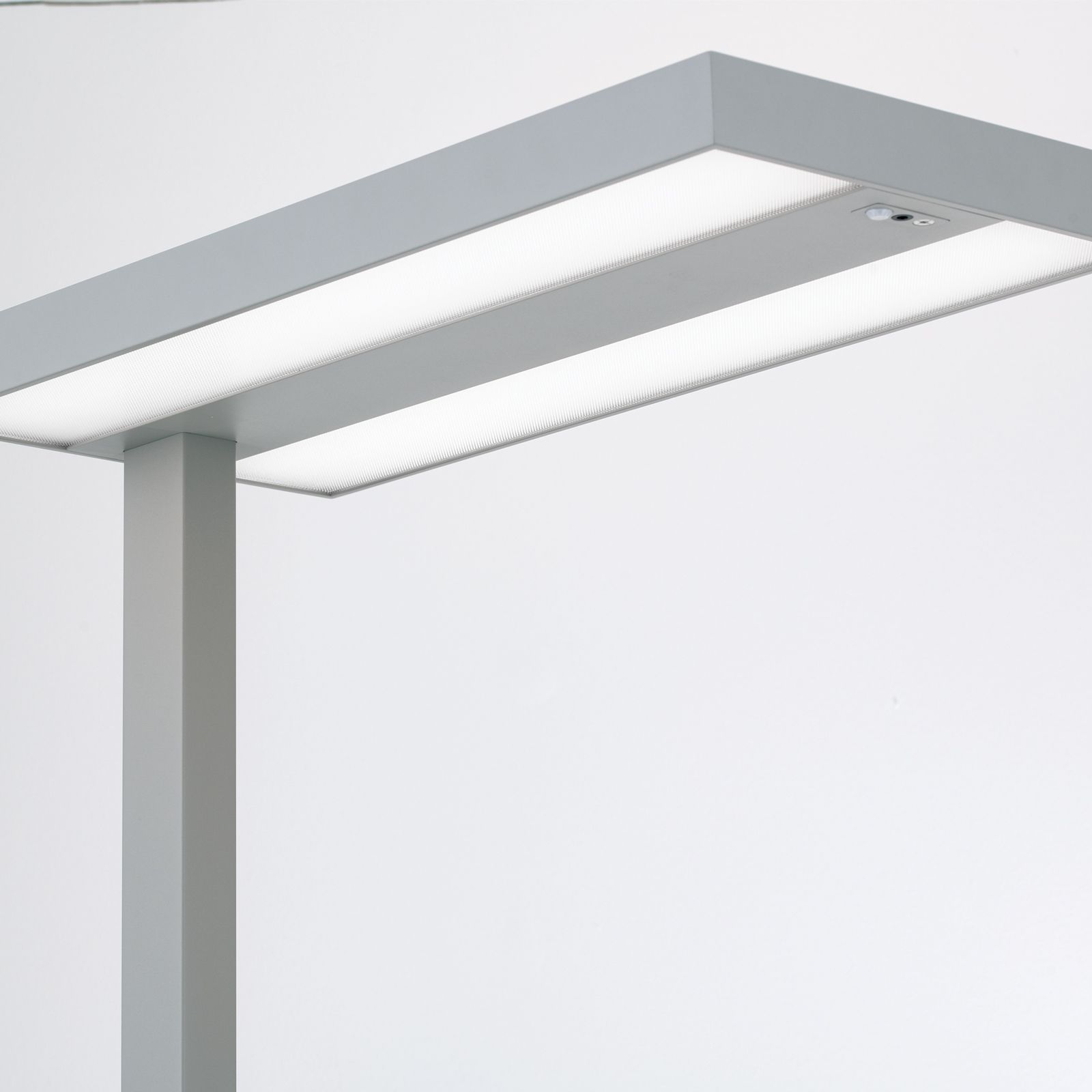 Die flache, U-förmige Bodenplatte gibt der Stehlampe eine große Standfestigkeit und ermöglicht es die Leuchte auch direkt an das Tischbein des Schreibtischs zu rücken. Die Büroleuchte ist mit einem Drehdimmer ausgestattet, durch den die Lichtstärke stufenlos variiert werden kann. Ein praktischer Tageslicht- und Bewegungssensor sorgen zudem für komfortables Lichtmanagement.