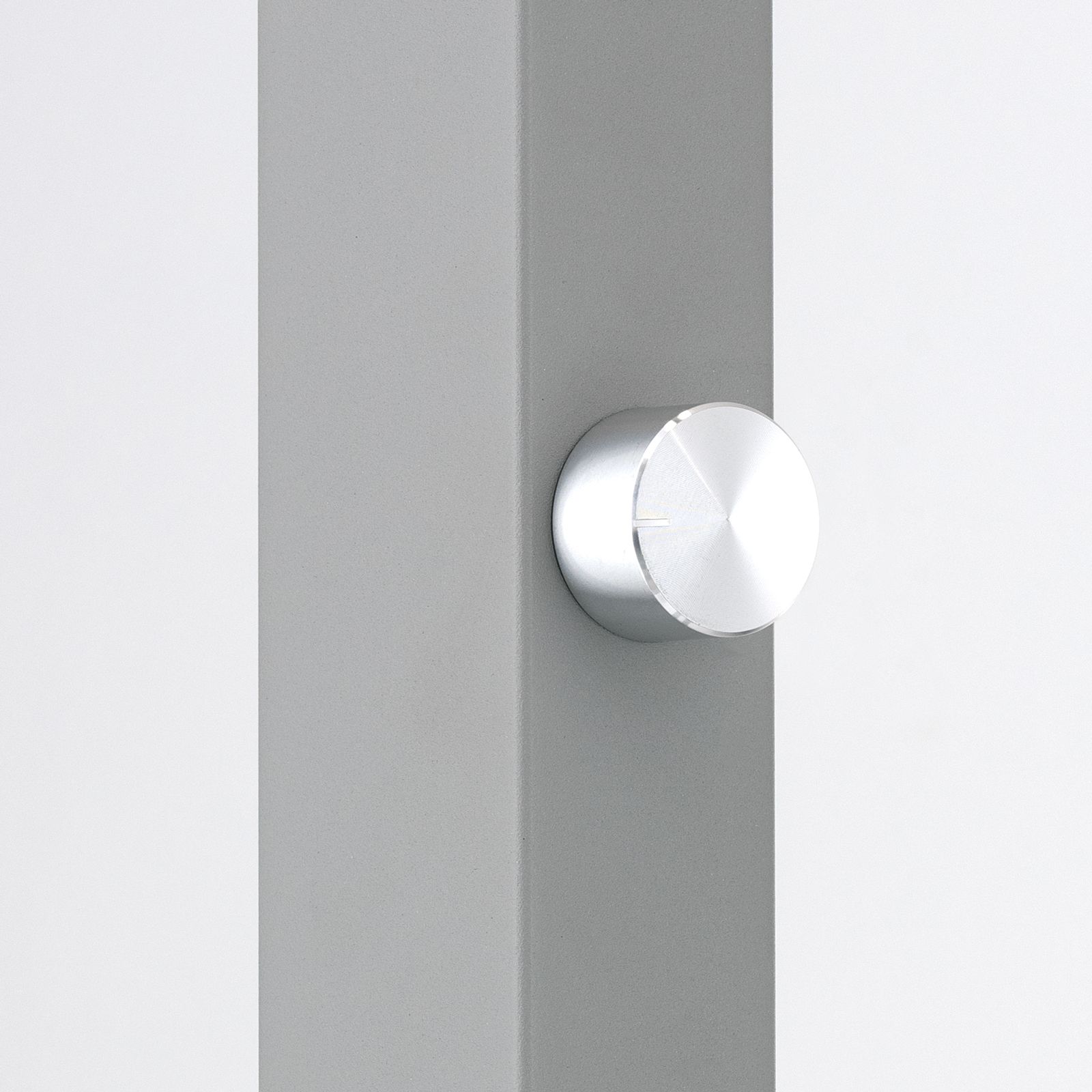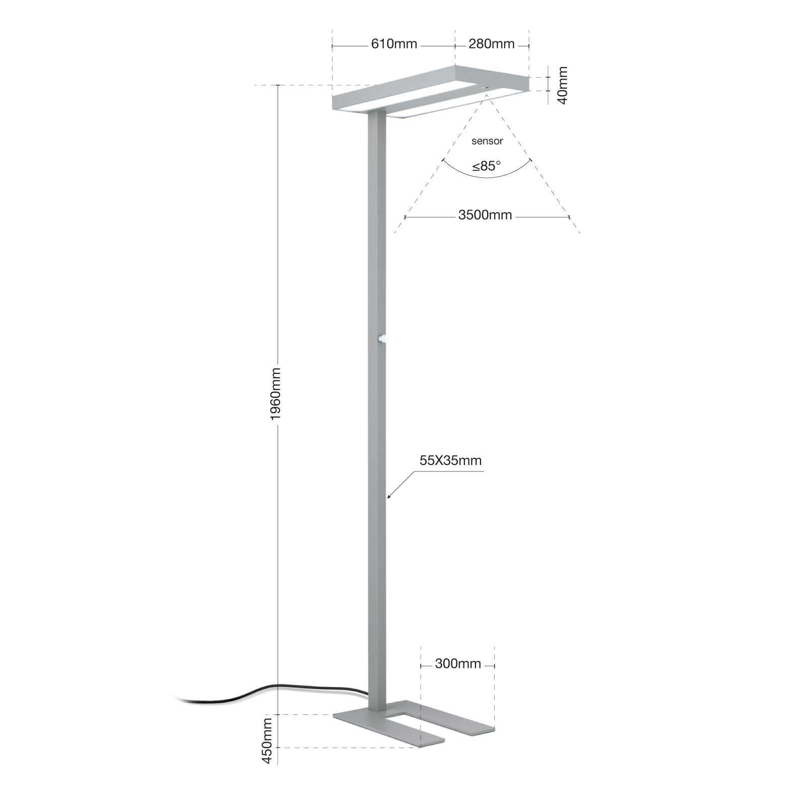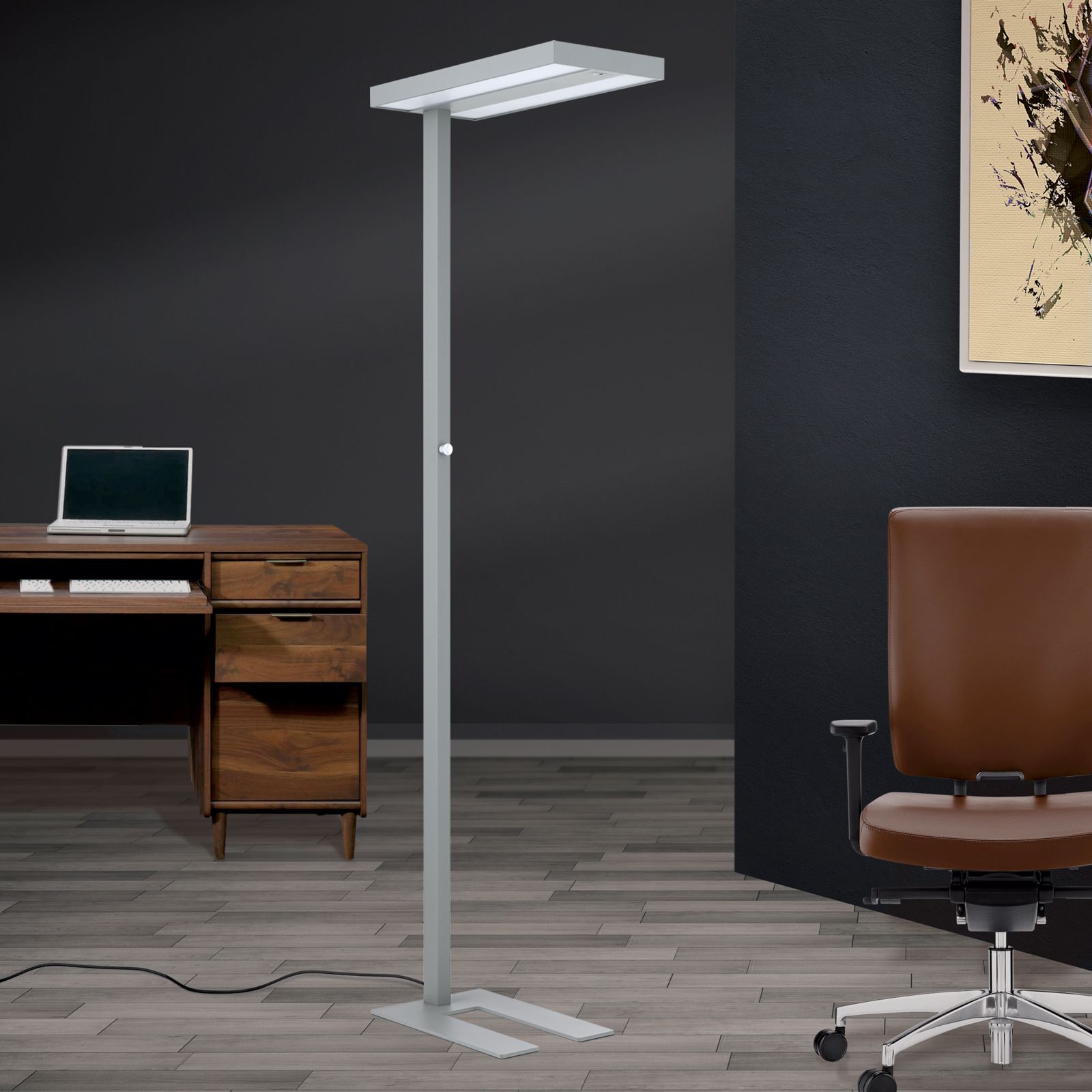 Die flache, U-förmige Bodenplatte gibt der Stehlampe eine große Standfestigkeit und ermöglicht es die Leuchte auch direkt an das Tischbein des Schreibtischs zu rücken. Die Büroleuchte ist mit einem Drehdimmer ausgestattet, durch den die Lichtstärke stufenlos variiert werden kann. Ein praktischer Tageslicht- und Bewegungssensor sorgen zudem für komfortables Lichtmanagement.