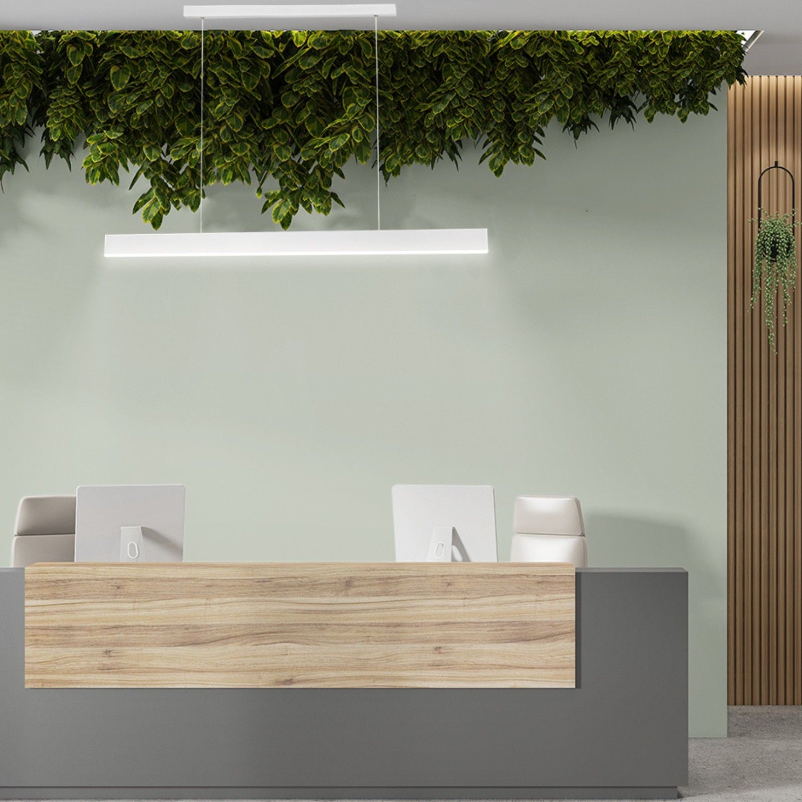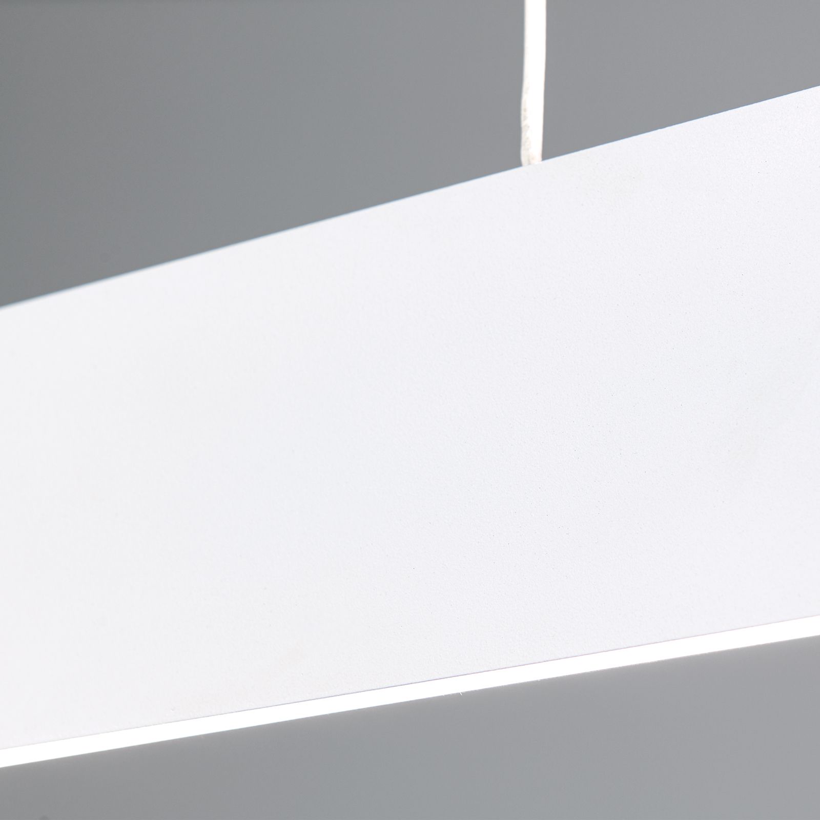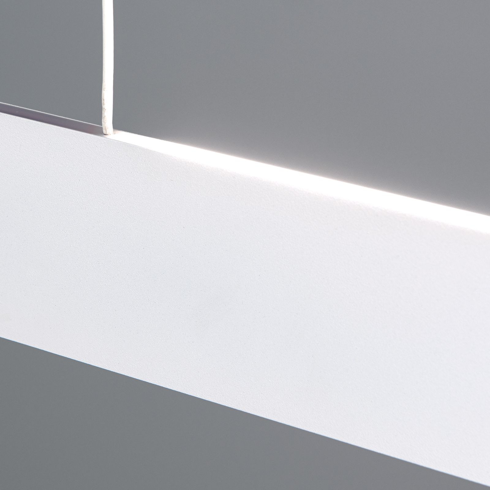 Das Zusammenspiel aus klaren Linien und Flächen bestimmt das Design der modernen LED Hängeleuchte GIDEON. Eine wahlweise mattschwarze- oder weiße Lackierung veredelt den schlanken, eineinhalb Meter langen Metallkörper der Leuchte.