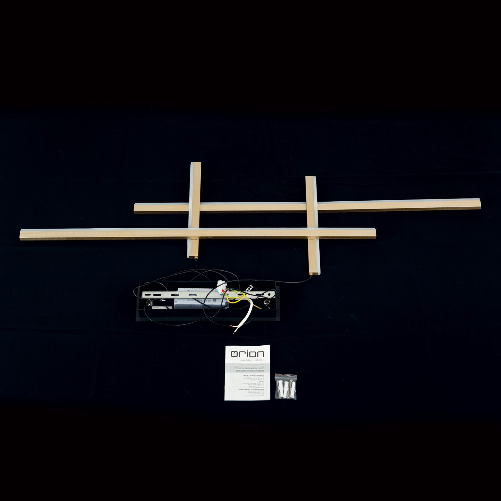 Die LED-Hängeleuchte STARTGATE überzeugt durch ihr auffälliges, lineares Erscheinungsbild. Vier über Kreuz angebrachte linienförmige LED-Element mit einem goldmatten Finish bilden den außergewöhnlichen Leuchtenkorpus. Die waagrechten Elemente geben ihr Licht nach unten ab, die senkrechten Element strahlen in den Raum. Sie sind mit schwarzen Kabeln ausgestattet, die in einem schlichten schwarzen Baldachin enden.
