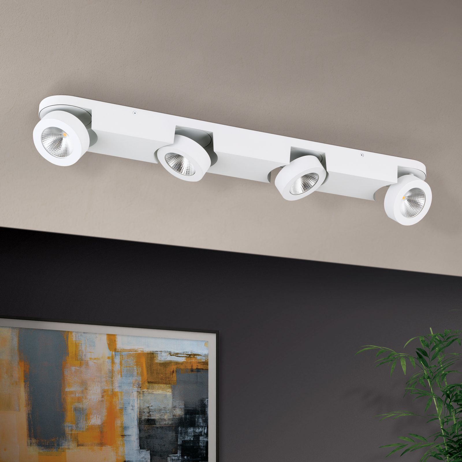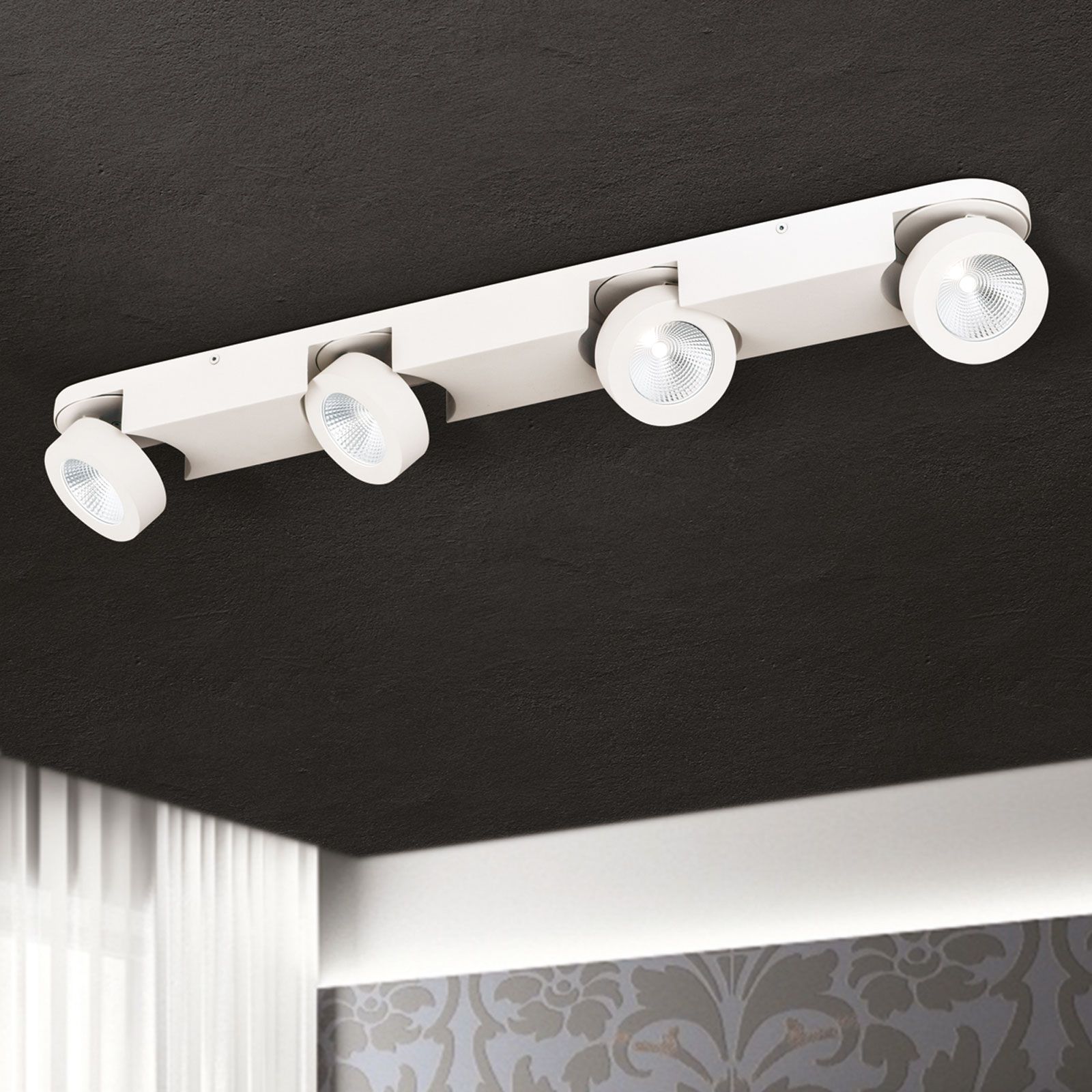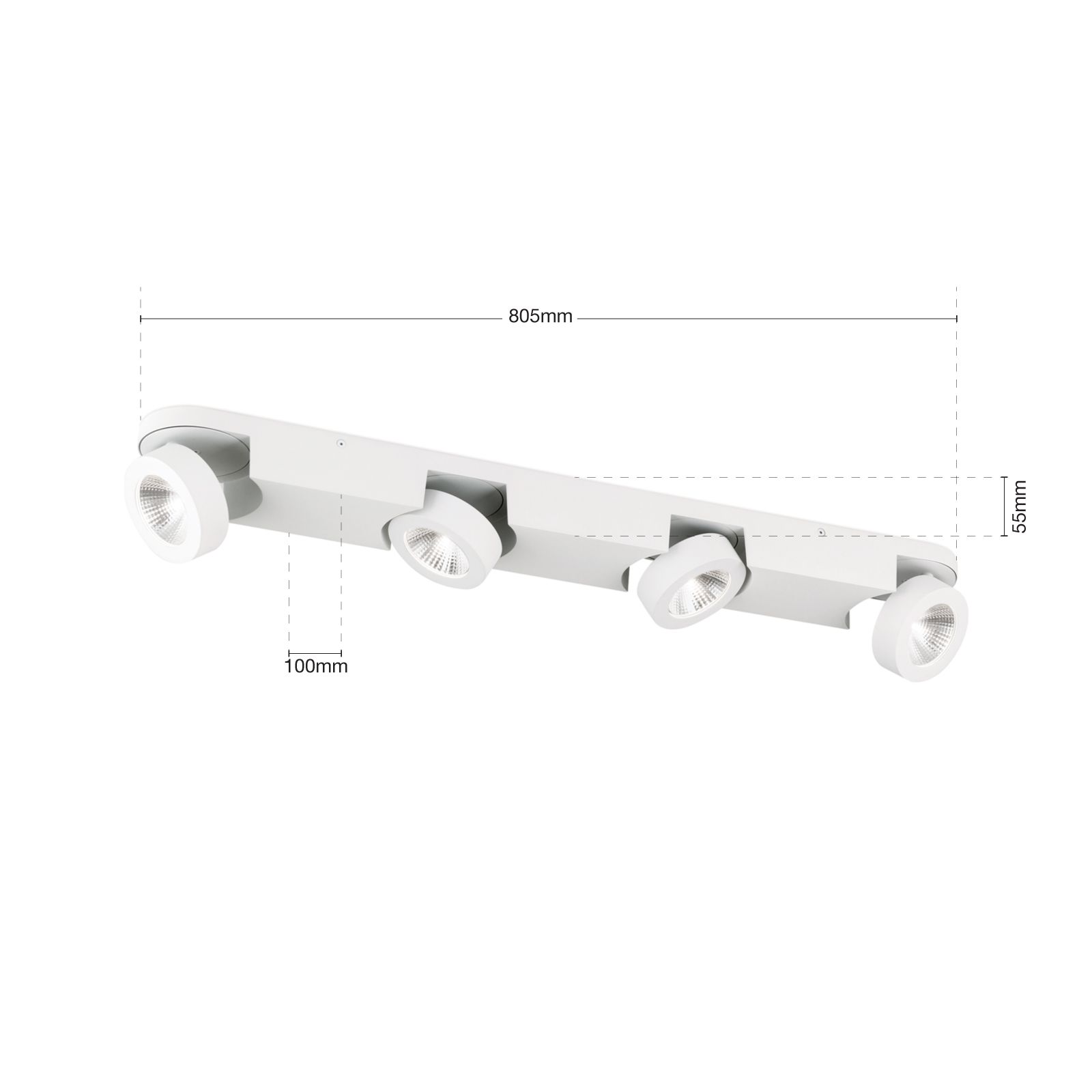 Mit dem weißen LED-Strahler MENO lassen sich Lichtakzente in Haus und Wohnung setzen, die eine optimale Beleuchtung von bestimmten Wohnbereichen garantieren. Vier LED-Strahler mit einem breiten Abstrahlwinkel von 60° erzeugen einen großen Lichtkegel, der zur punktuellen Beleuchtung von Tisch- und Arbeitsflächen ebenso genutzt werden kann wie von Schränken, Regalwänden oder größeren Gemälden. Das weiß pulverbeschichtete Gestell verfügt über vier Spots, die sich schwenken und drehen lassen, um das Licht in die gewünschte Richtung zu lenken. Der technisch puristisch anmutende Aufbaustrahler ist mit warmweißen LEDs und einer Lichtleistung von 1800 Lumen ausgestattet.