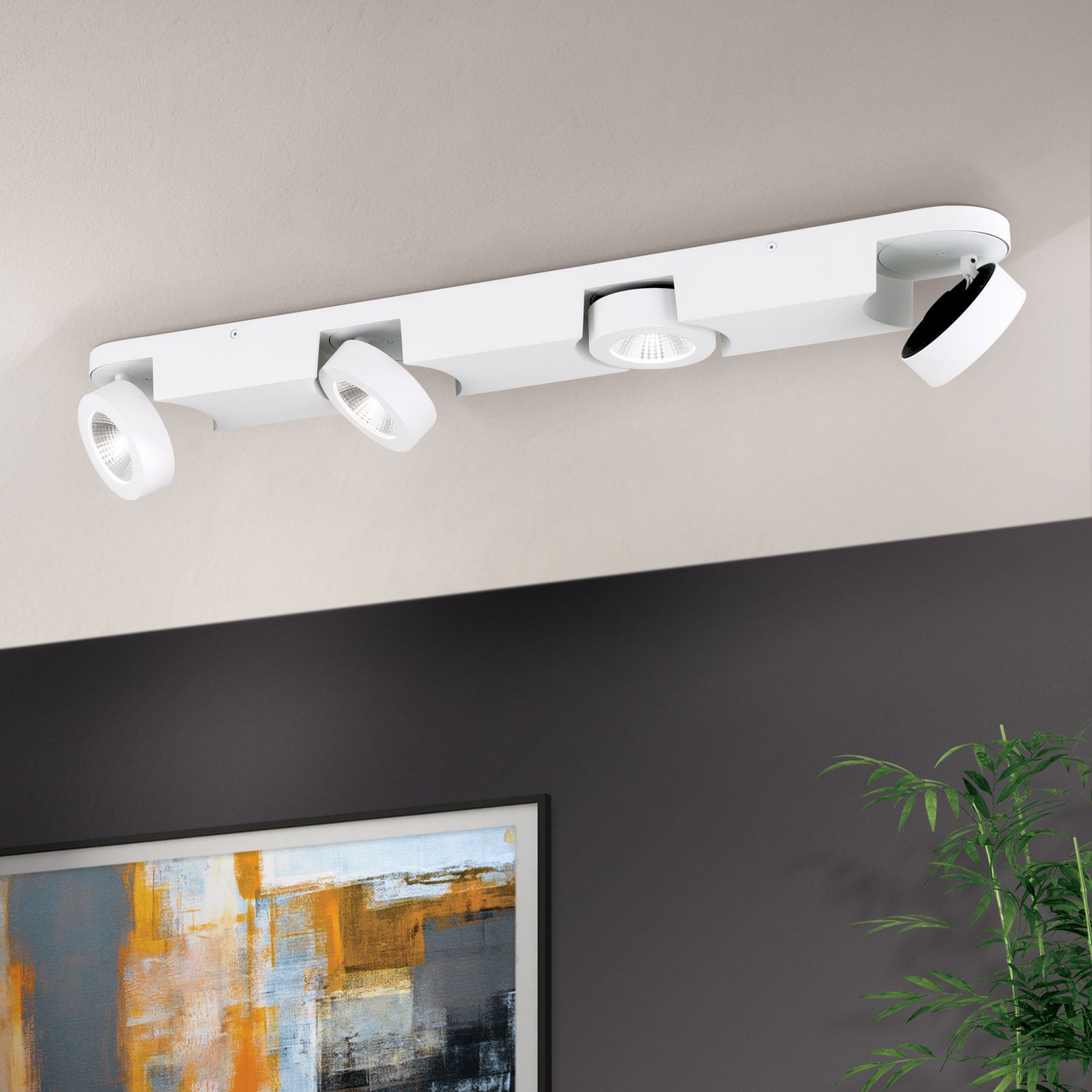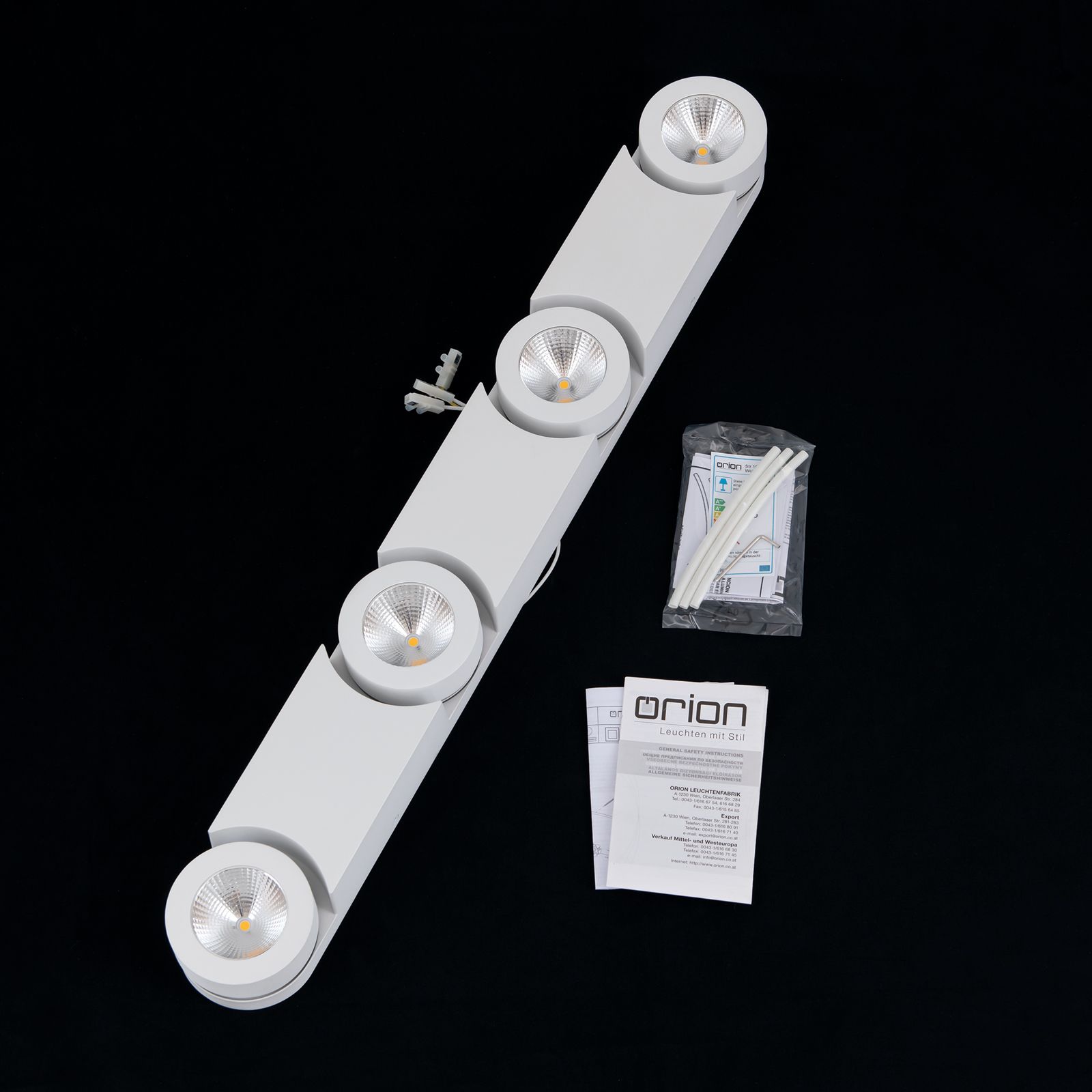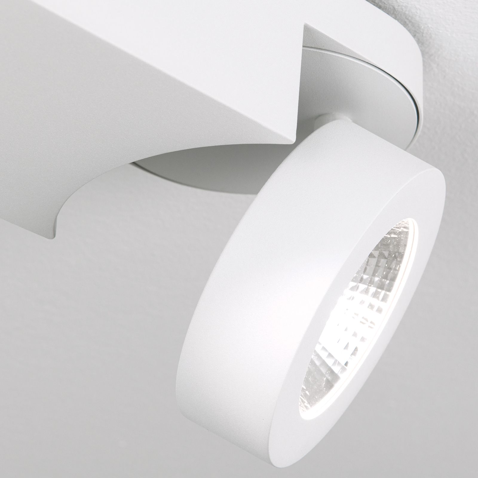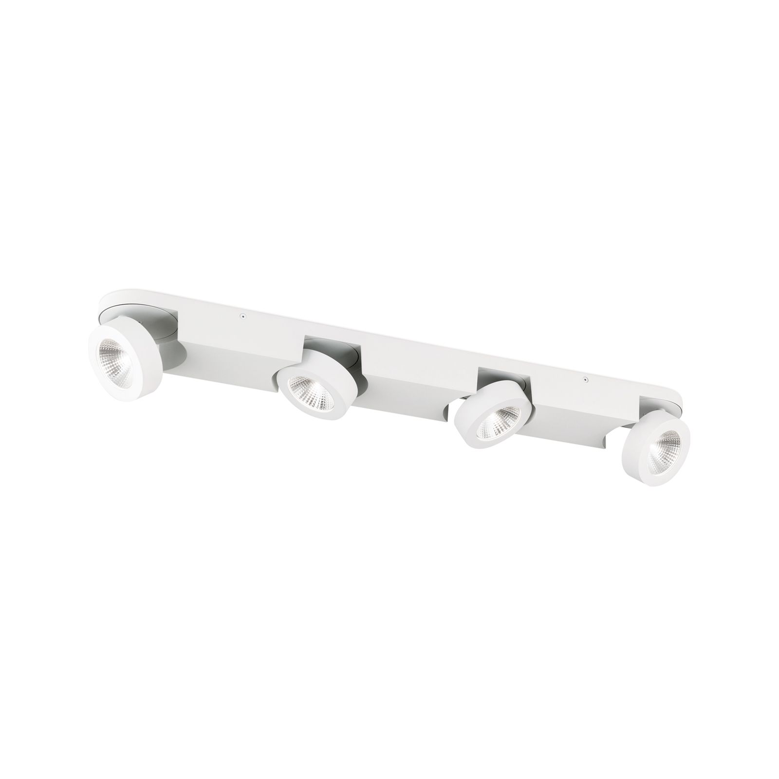 Mit dem weißen LED-Strahler MENO lassen sich Lichtakzente in Haus und Wohnung setzen, die eine optimale Beleuchtung von bestimmten Wohnbereichen garantieren. Vier LED-Strahler mit einem breiten Abstrahlwinkel von 60° erzeugen einen großen Lichtkegel, der zur punktuellen Beleuchtung von Tisch- und Arbeitsflächen ebenso genutzt werden kann wie von Schränken, Regalwänden oder größeren Gemälden. Das weiß pulverbeschichtete Gestell verfügt über vier Spots, die sich schwenken und drehen lassen, um das Licht in die gewünschte Richtung zu lenken. Der technisch puristisch anmutende Aufbaustrahler ist mit warmweißen LEDs und einer Lichtleistung von 1800 Lumen ausgestattet.