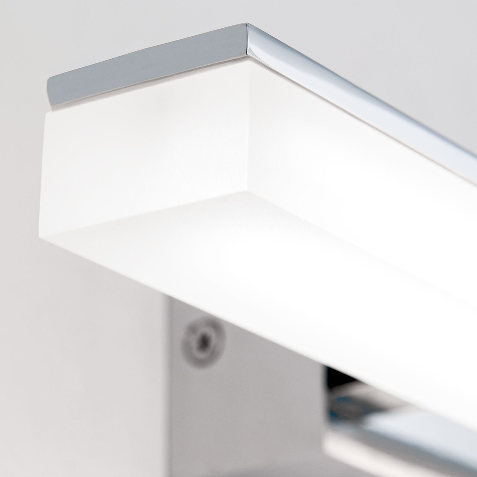 Die Spiegel- und Bilderleuchte LEDINA lässt sich aufgrund ihres ausgewogenen Aussehens leicht in puristisch elegante Interieurs integrieren. Der Schirm ist aus beständigem, satinierten Acrylglas, das Leuchtengestell aus Metall mit einem Oberflächenfinish in glänzendem Chrom. Mit einer Höhe von nur 5,2 Zentimetern und eine Tiefe von nur 10 Zentimetern nimmt sie wenig Platz ein und kann so auch in kleinen Badezimmern und WCs untergebracht werden.