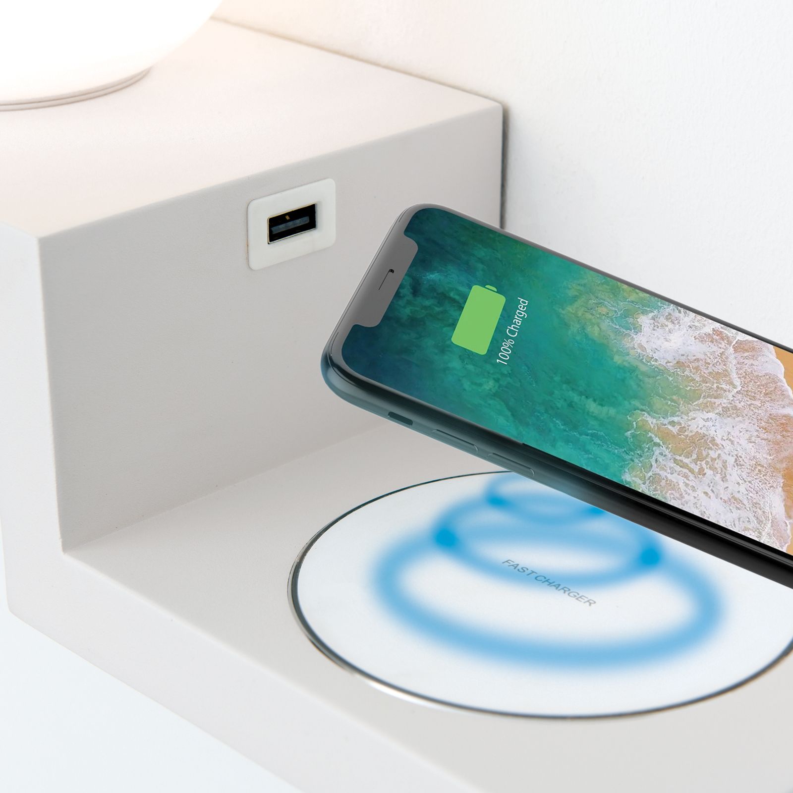 Die innovative 2-in-1-Wandleuchte SNOWBALL gibt nicht nur angenehmes, gleichmäßiges Licht, sie dient gleichzeitig als Ladestation für Ihr Handy oder Tablet. Diese können sowohl induktiv als auch über den USB-Port aufgeladen werden.