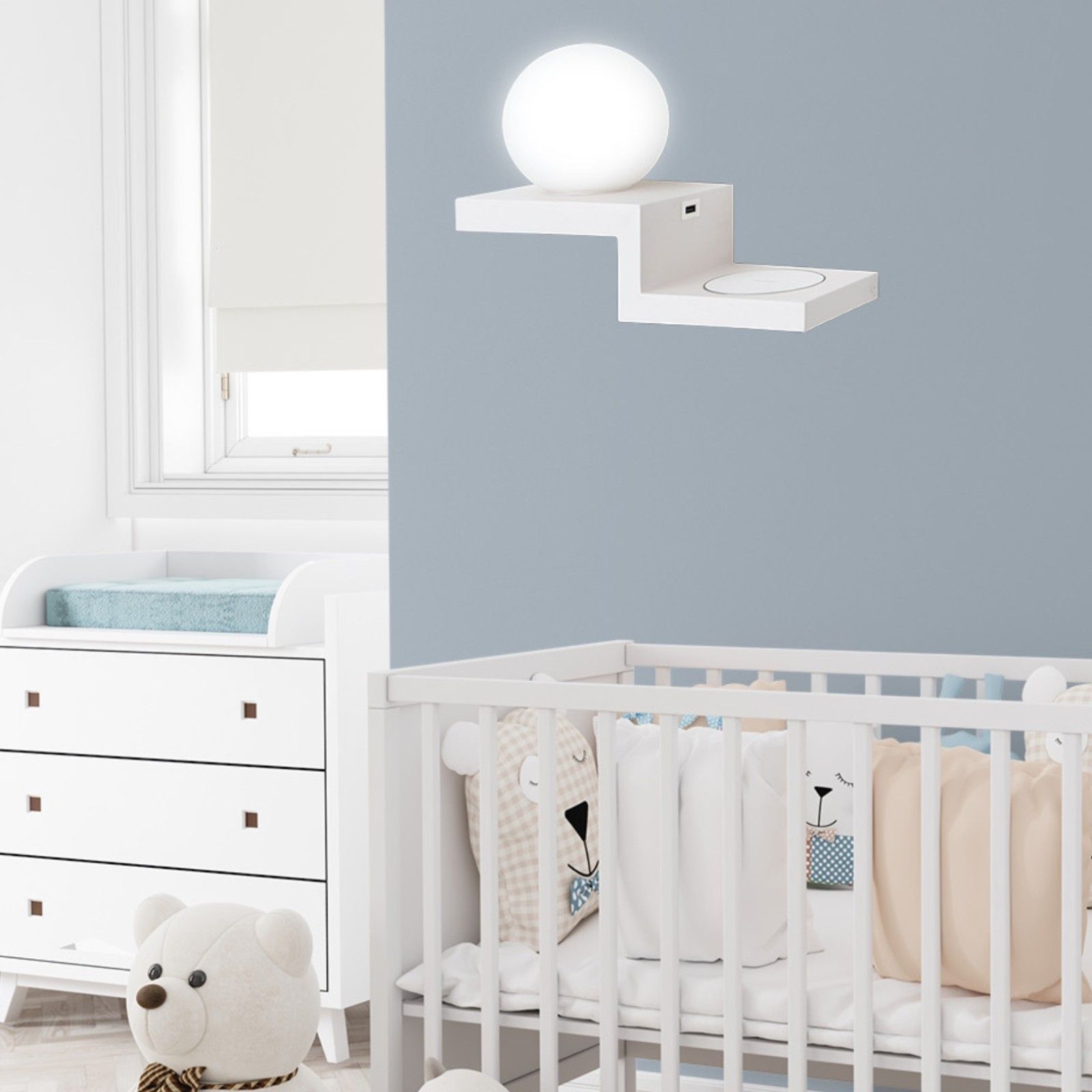 Die praktische Wandleuchte SNOWBALL ist Leuchte, Wandregal und Ladestation zugleich. Sie schafft Ordnung und fügt sich harmonisch in ein modernes Interieur. Durch ihre cleanes Design und ihre Multifunktionalität wird sie den Ansprüchen modernen Wohnens perfekt gerecht.
