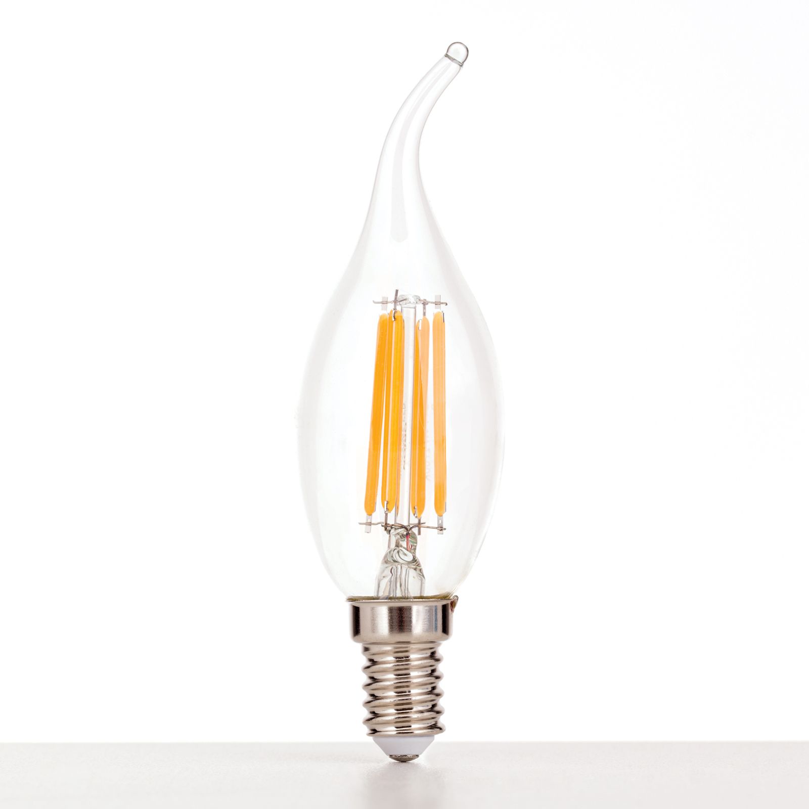 Die Lampe verfügt über einen E-14 Schraubsockel und erzeugt eine stimmungsvolle Lichtqualität. Das formschöne klare LED Leuchtmittel in Windstoß-Kerzenform strahlt in warmweiß mit einer Lichtfarbe von (2700 K) und überzeugt durch hohe Energieeffizienz.