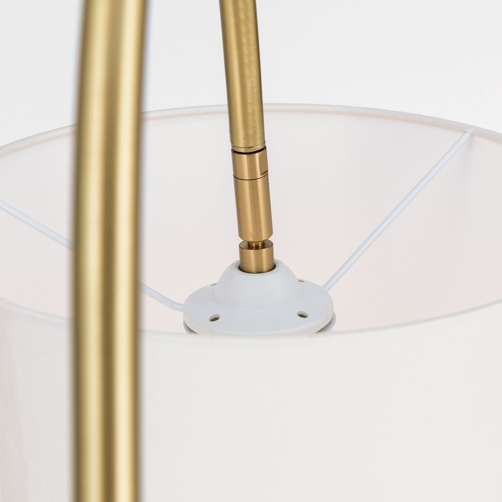 Hochwertige Materialien wie eine Montur aus Messing, ein matt glänzender weißer Textilschirm und ein farblich abgestimmtes Textilkabel mit Wippschalter verleihen der Leuchte eine schlichte Eleganz.