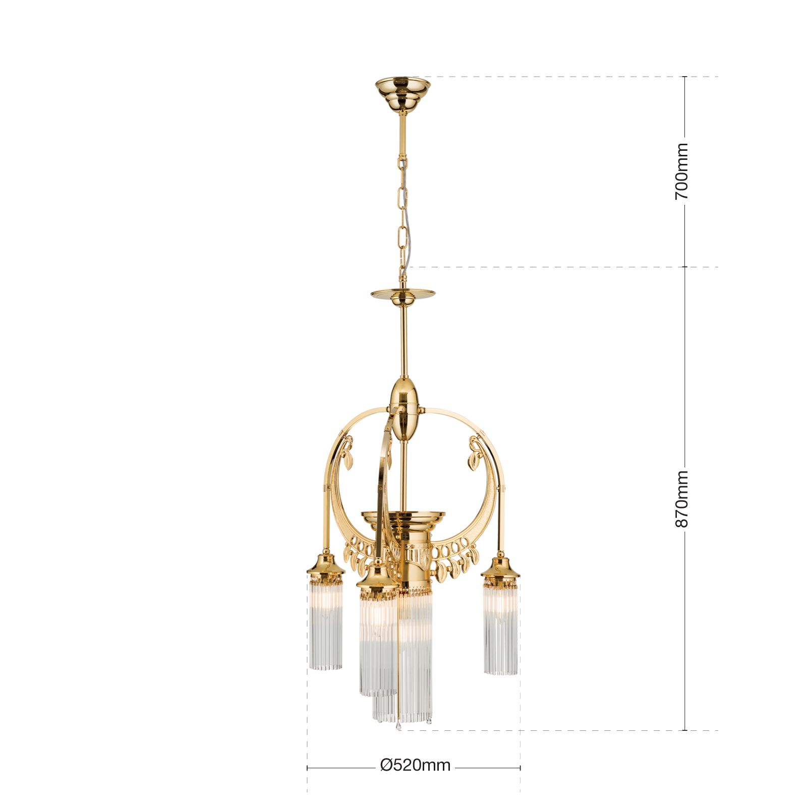 Der 4-flammige Luster aus der ADELE-Reihe ist ein Gesamtkunstwerk. Die drei Arme wirken wie blumenverzierte Französisch Hörner, die Bacchus zu Ehren erklingen. Messingenes Blattwerk umrankt stützend die Lampenbögen wie wilder Wein, der eine Laube liebevoll umfängt. Der mittlere Zylinder ist ein Quell, aus dem Licht sprudelt. Als Luster in einer Wohnzimmermitte oder über einem Esstisch erfährt man das erhabene Gefühl von Edlem umgeben zu sein. Auch einem Schlafzimmer wird ein besonderer Charakter von zeitloser Schönheit verliehen. Die Leuchte ist mit vier E14-Fassungen für je bis zu 40 Watt ausgestattet.