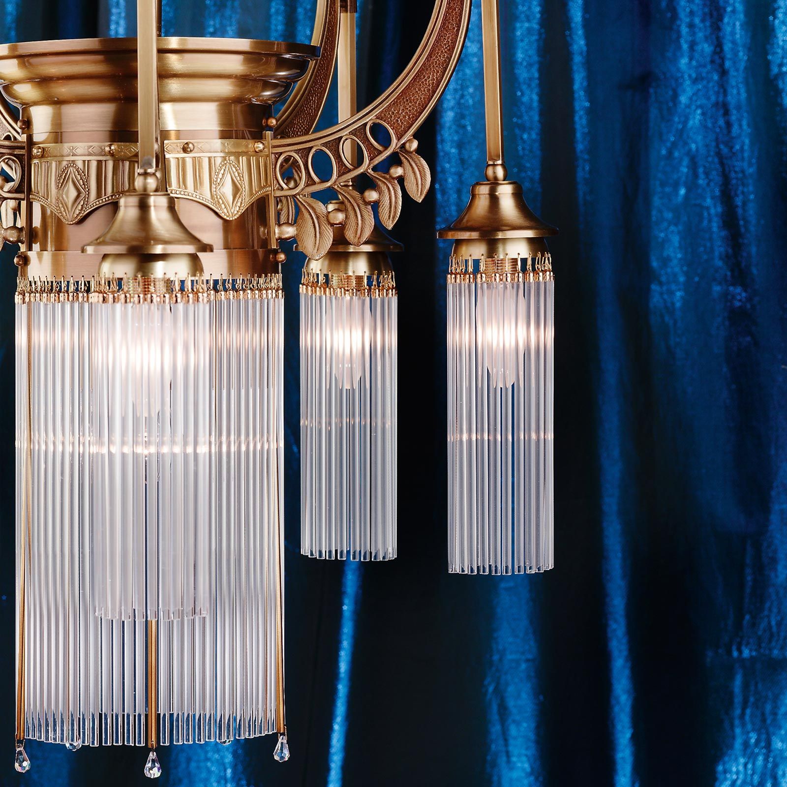 Ganz in der Tradition des Jugendstils präsentiert sich der Kronleuchter ADELE. Ein Finish in Altmessing veredelt das Leuchtengestell aus Messing und wird mit den für die Serie charakteristischen Glasstäbchen kombiniert. Die von den Stäbchen umhüllten Leuchtmittel sorgen für geometrische Lichtspiele, die einen ansprechenden Kontrast zum floralen Aufbau des Kronleuchters bilden. Der Luster mit einem beträchtlichen Durchmesser von 88 Zentimetern ist mit zehn E14-Fassungen versehen und kann mit maximal 40 Watt je Fassung betrieben werden. Die Gesamthöhe beträgt 140 Zentimeter, weshalb sich bei einer freien Hängung frei eine Deckenhöhe von etwa 3,5 Metern empfiehlt. Aufgrund seines repräsentativen Charakters und authentischen Jugendstil-Flairs eignet er sich für den Einsatz in Entrees, Empfangsräumen und Salons.