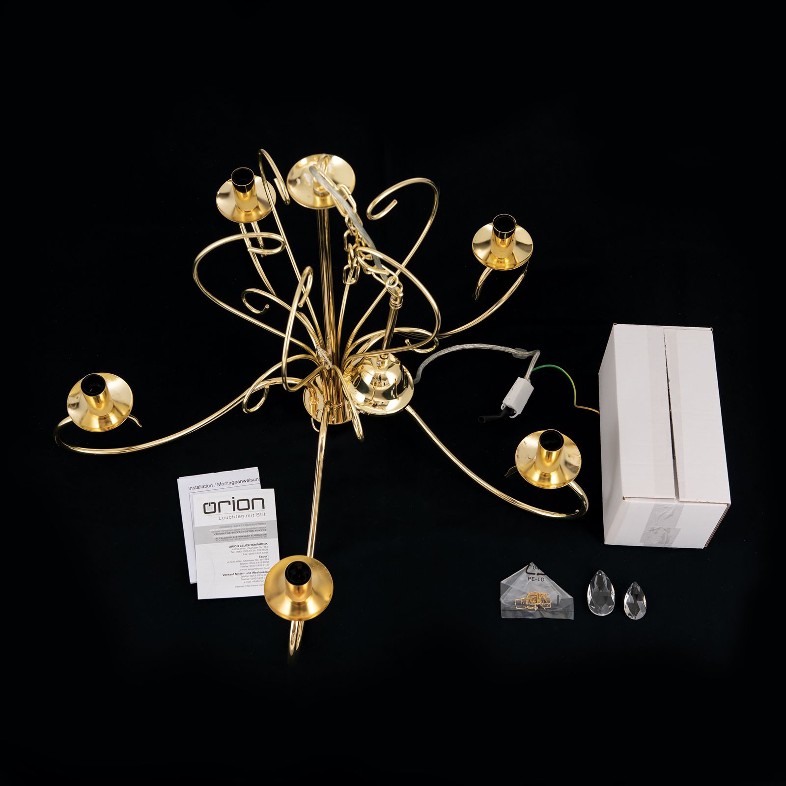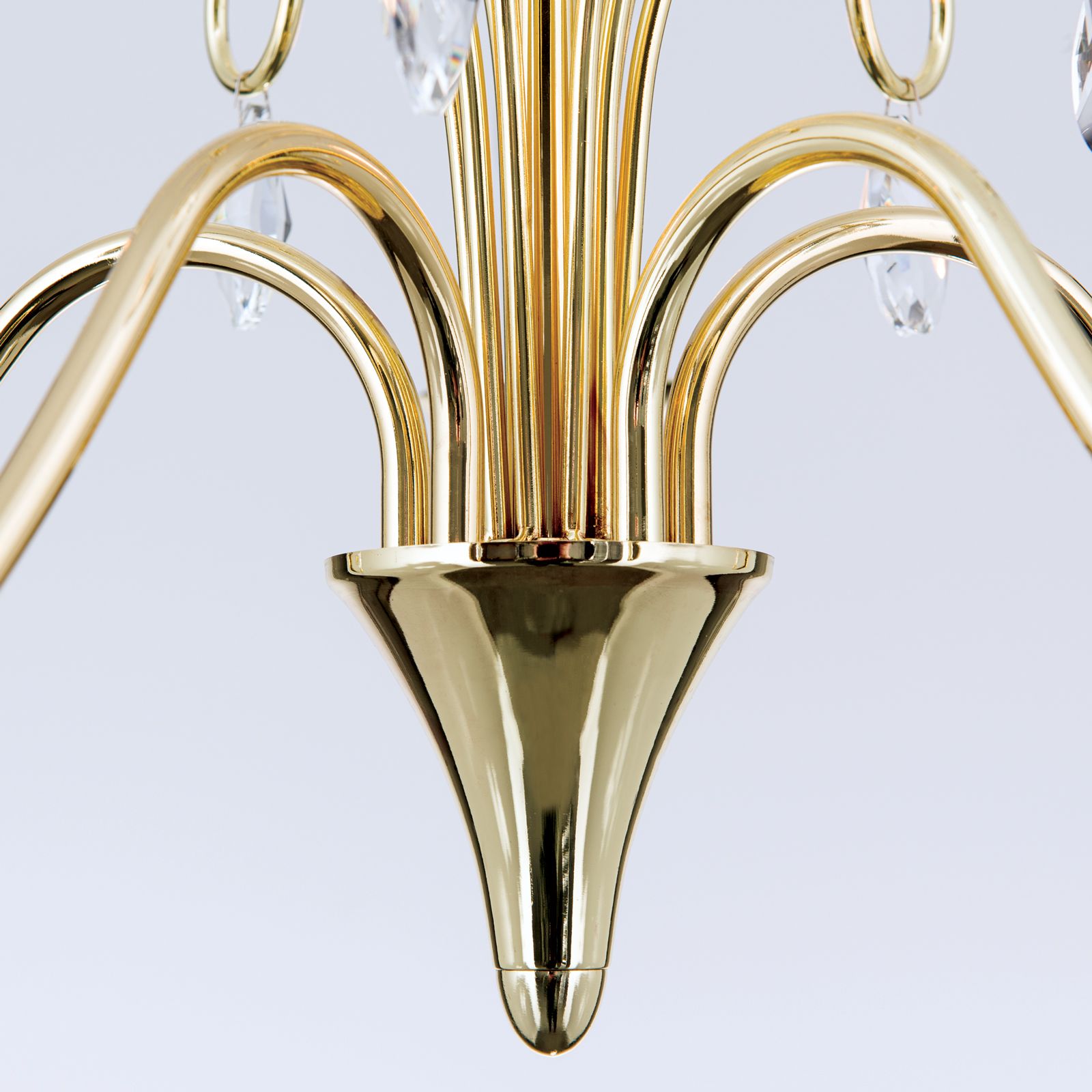 Kombiniert man den Kronleuchter mit matten E14-Windstoßkerzen, schafft man einen gelungenen Kontrast zum Glanz und Funkeln des Leuchtenkörpers und verhindert zudem eine Blendung.