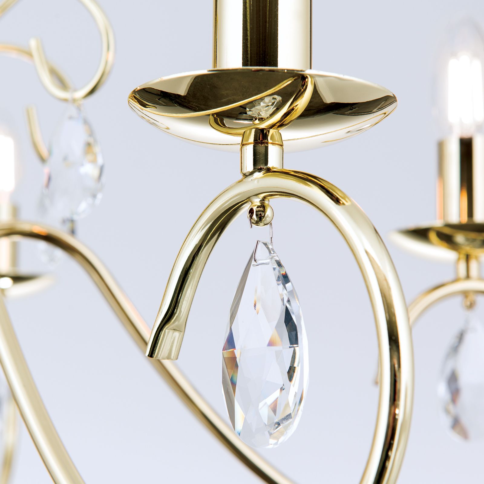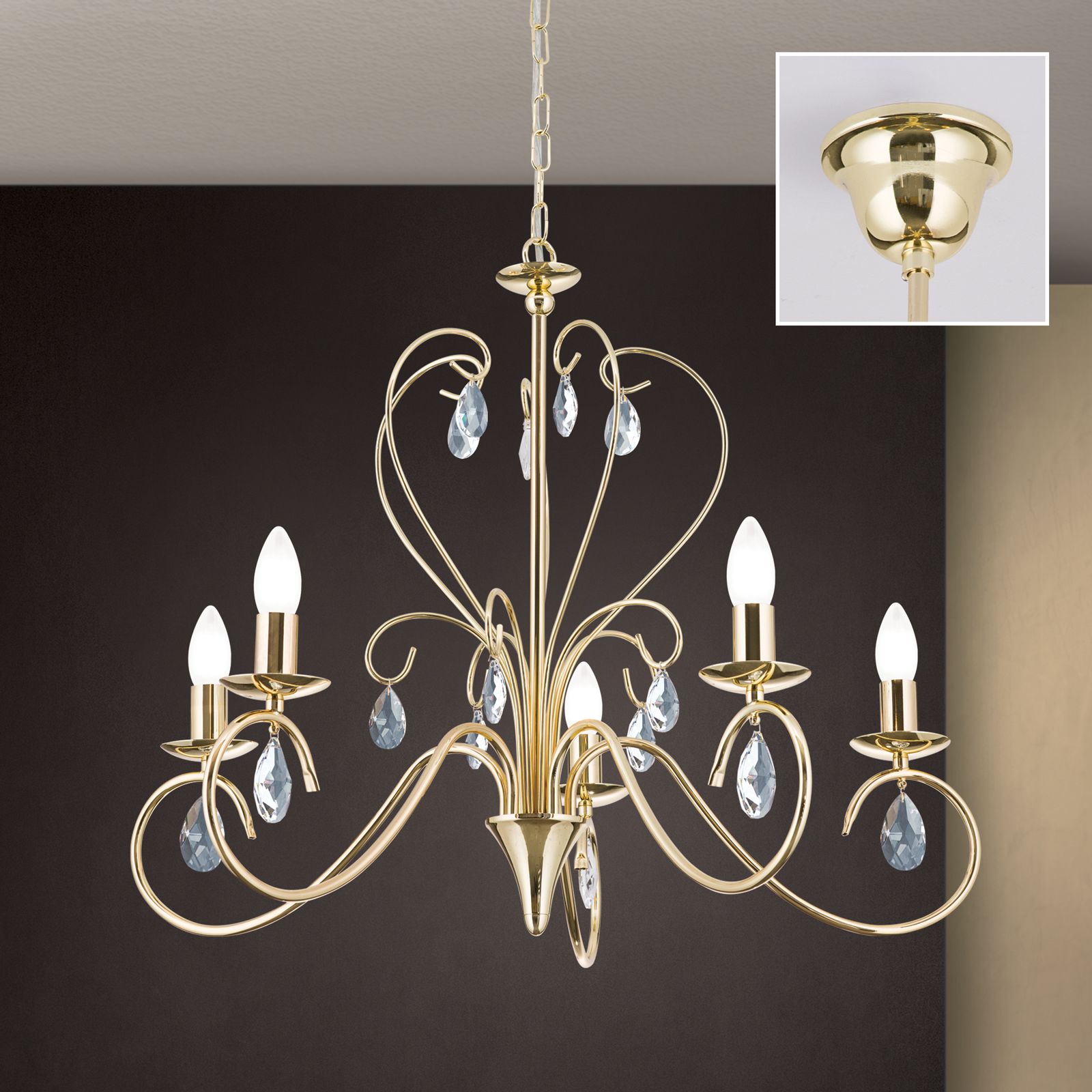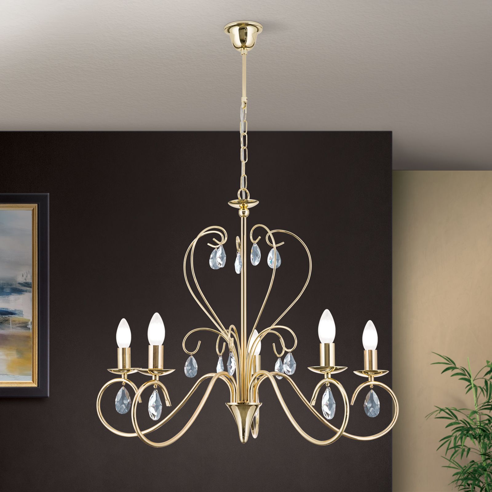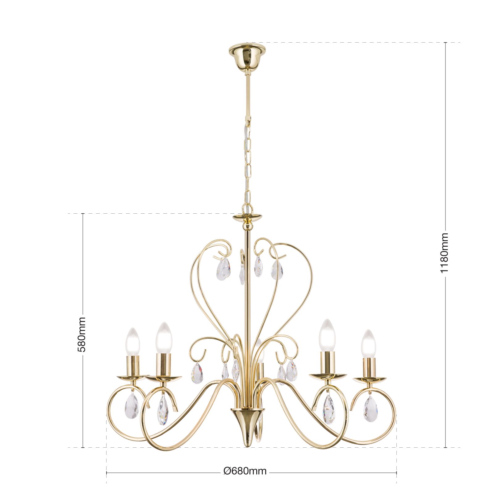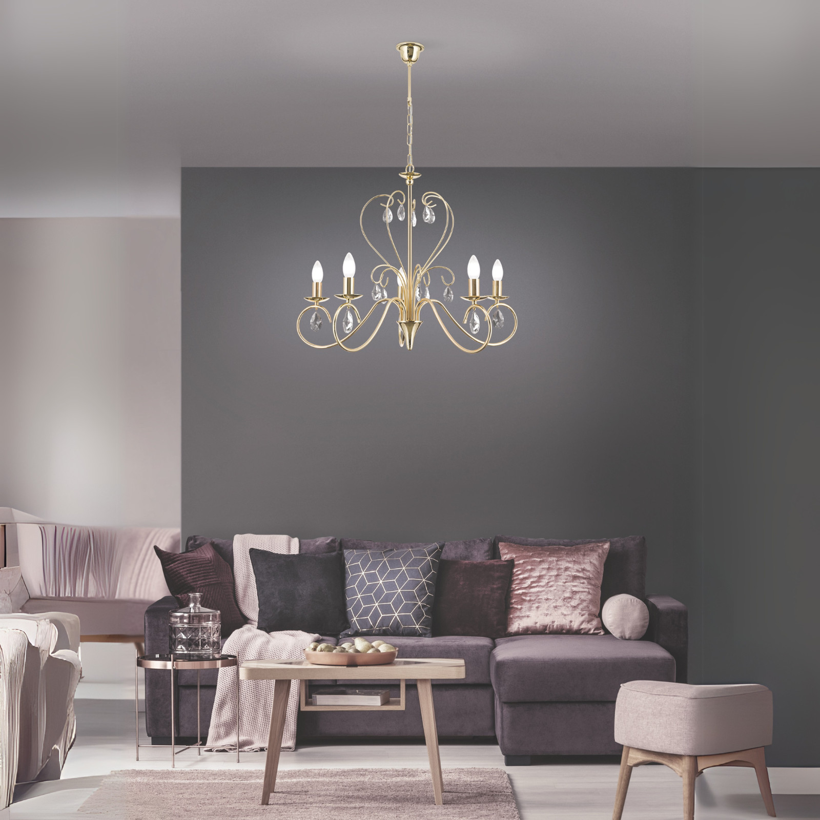 Der verspielte fünfflammige Kronleuchter ALESSIA wird geprägt durch seine organisch geformten Ranken und ihre glitzernden, tropfenförmigen Kristalle, die von Ihnen eingerahmt werden.