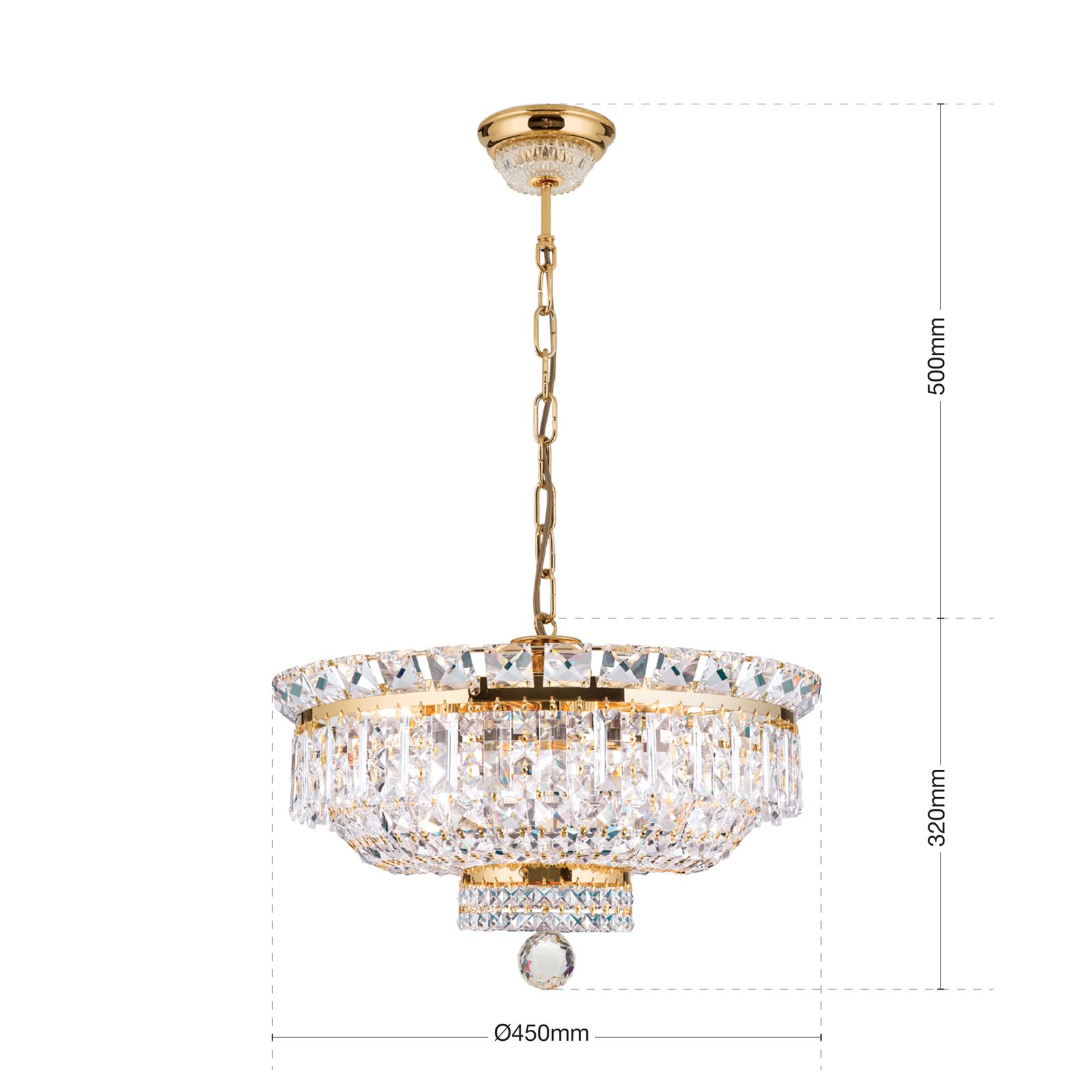 Kristallprismen und Quadratsteine zieren das glänzende Gestell auf verschiedenen Ebenen und erzeugen durch den Lichteinfall wunderschöne Reflexionen, die zum Bestaunen einladen. Die verchromte Oberfläche intensiviert das Funkeln und rundet das Erscheinungsbild perfekt ab. Den Abschluss des imposanten Kristallkronleuchters bildet eine große Kristallkugel, die für das gewisse Etwas sorgt. Je nach Stimmung und Laune kann die Leuchte auf Wunsch und mithilfe eines Dimmers in ihrer Helligkeit eingestellt werden, um so für das perfekte Ambiente zu sorgen. Hinter den vielen Kristallketten sitzen verborgen die 9 E14-Fassungen, die mit maximal je 40 Watt bestückt werden können.