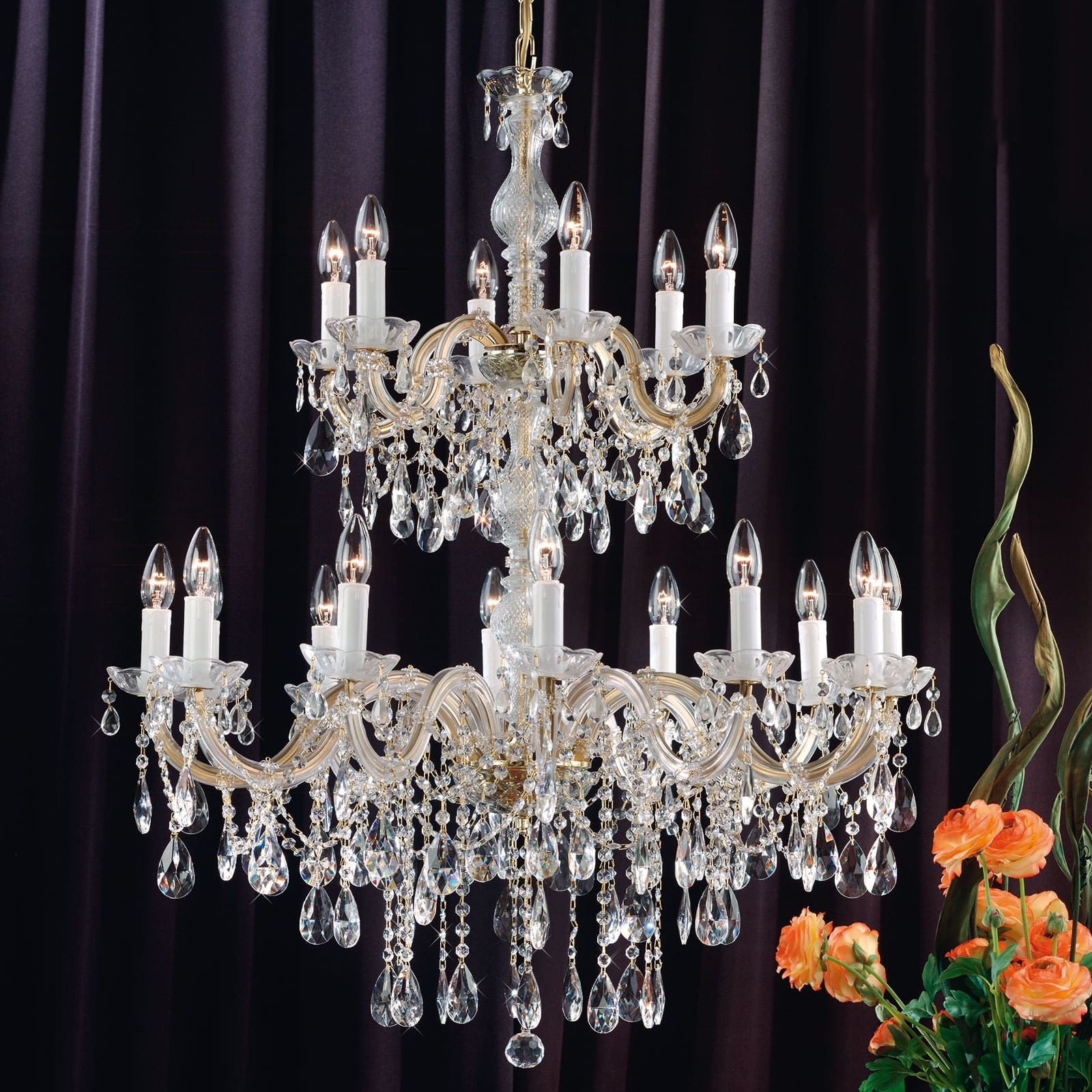 Der 24-flammige Kristallluster aus der umfangreichen BALLROOM-Produktreihe lässt die Herzen jedes Antikdekorfans höher schlagen: die Wachsfänger werden über Louis XIV-S-Bogen mit dem Armansatz verbunden. Dabei sind die Arme reichhaltig mit wachtelfömigem Behang versehen. Der Schaft ist in Form eines gläsernen Balusters ausgebildet, der von einer Schale gekrönt wird. Eine goldene, 60 Zentimeter lange Röhre geht in eine glockenförmige Rosette am Plafond über. Dieser Kristallluster verbreitet Glanz und Festlichkeit eines Rokokoballsaales. Der teilmontierte dimmbare Kronleuchter verfügt über 24 E14-Fassungen zu je bis zu 40 Watt.