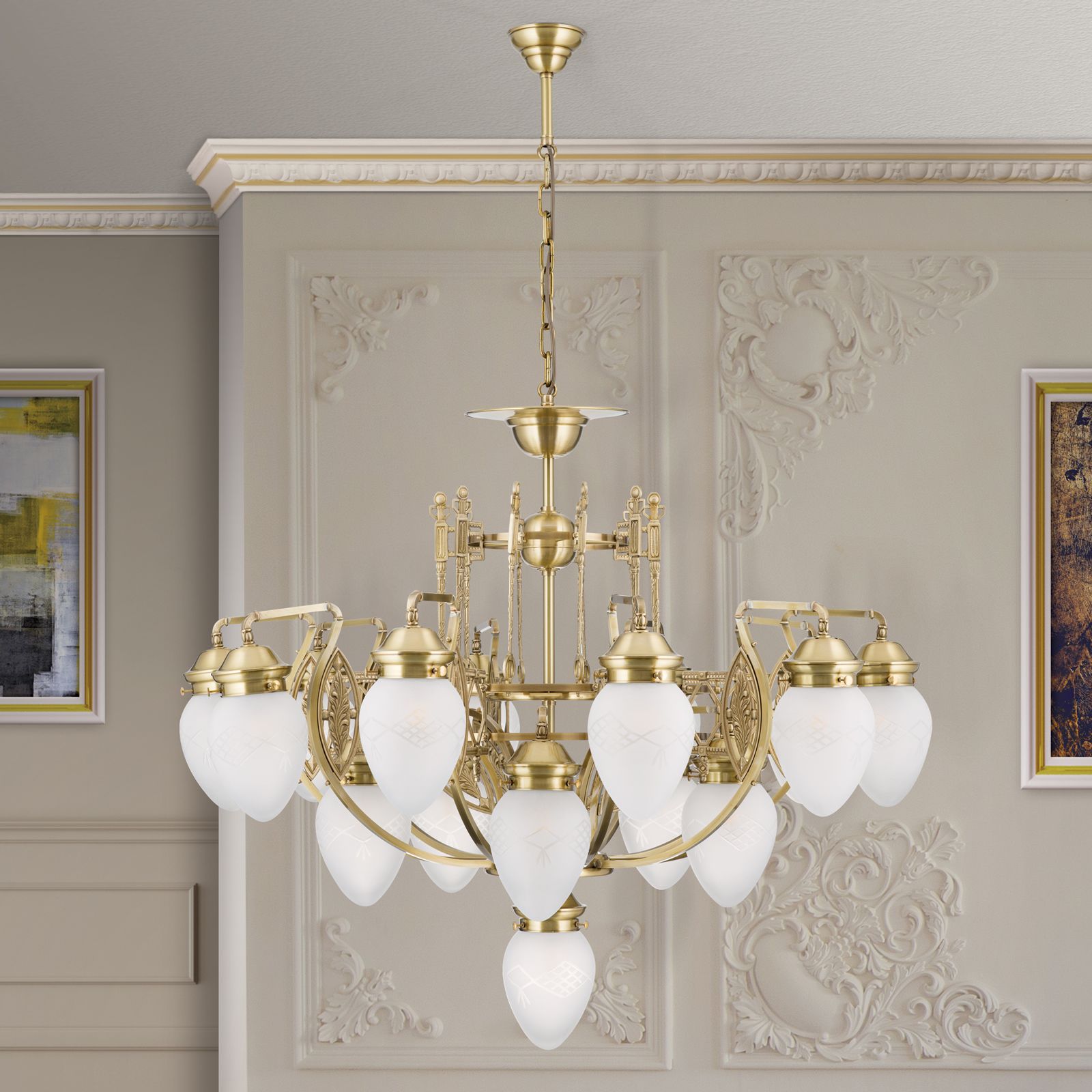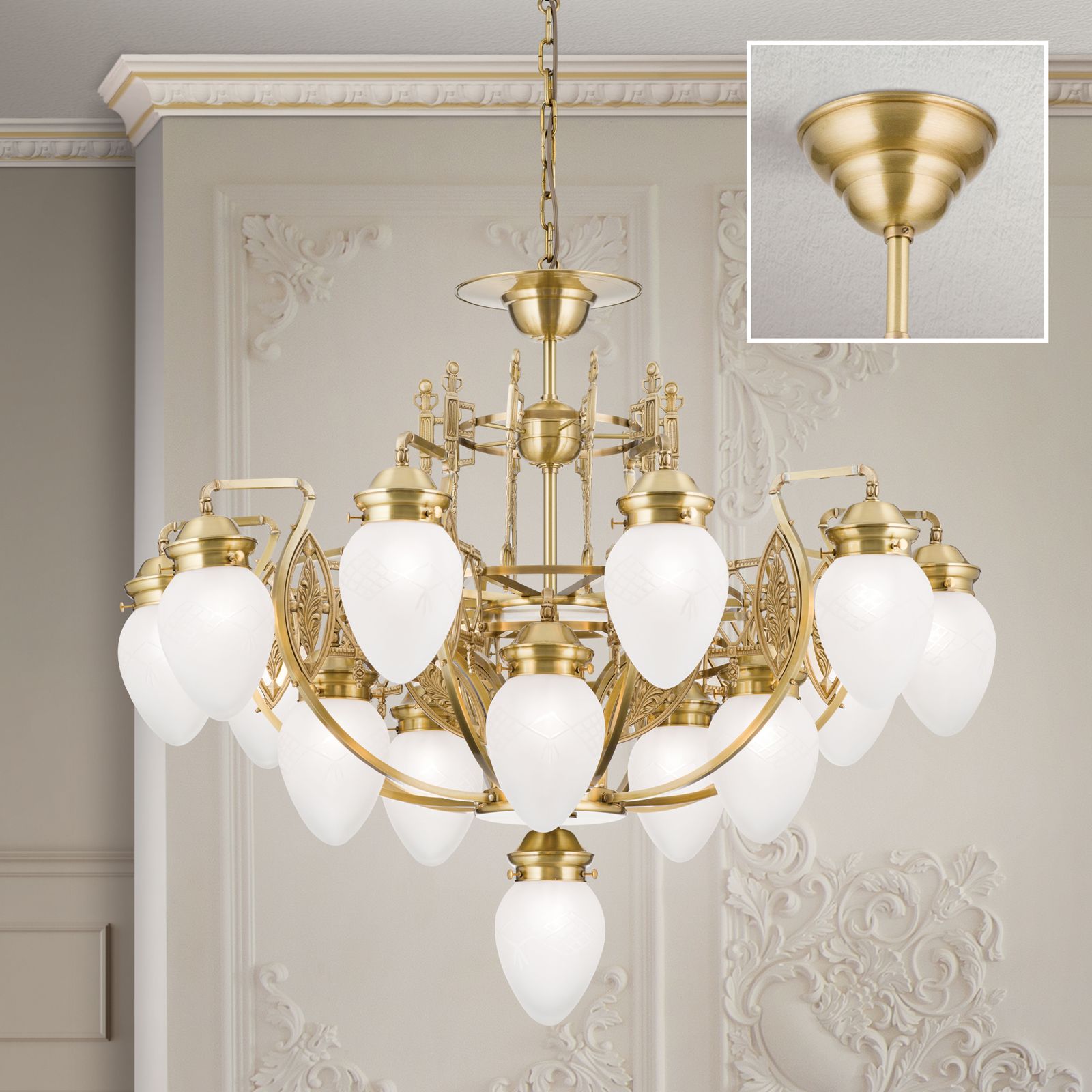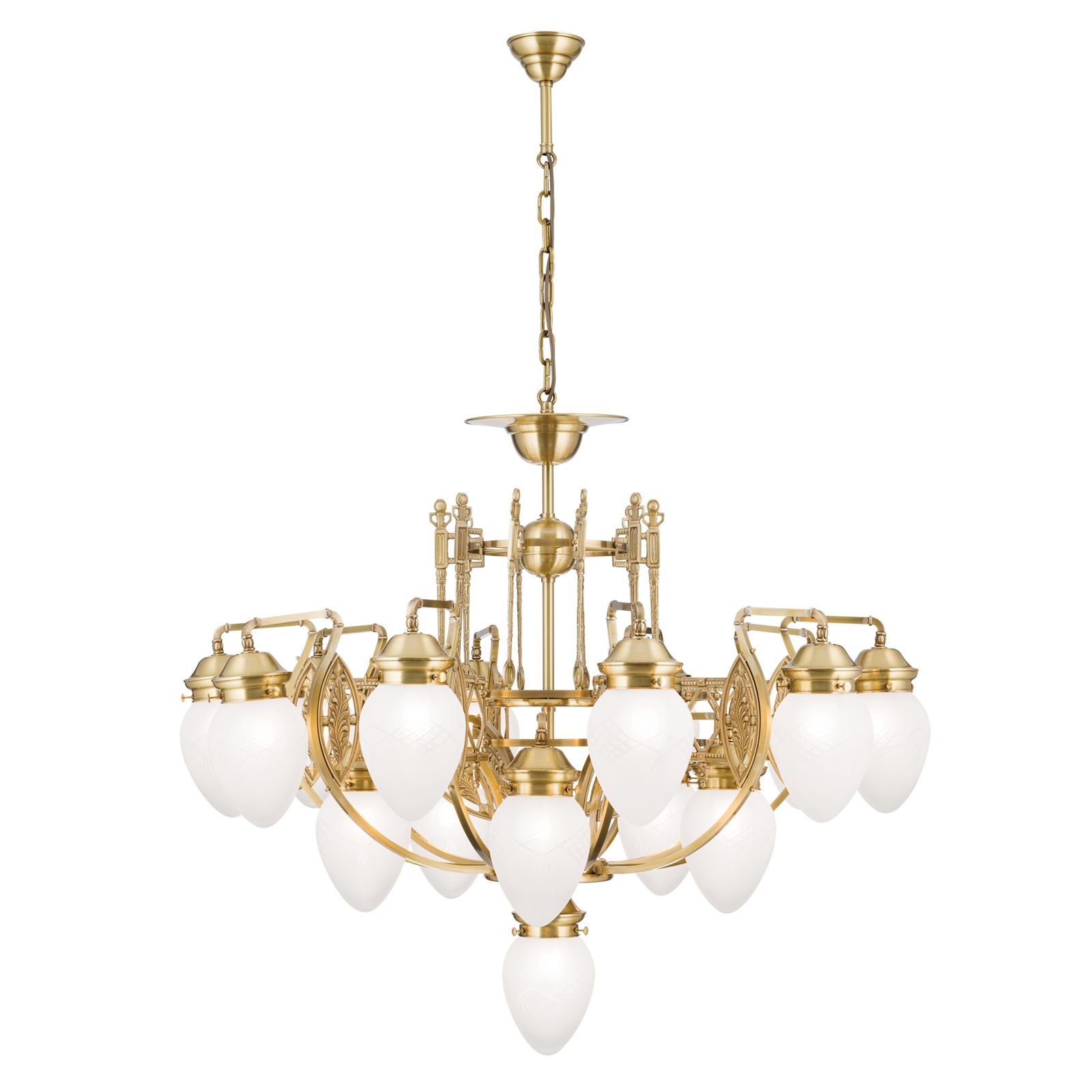 Der Zauber ungarischen Art nouveaus besteht im Zitatenreichtum. Der 16-flammige Luster aus der Kollektion BUDAPEST zeigt deutlich, wie hier unterschiedliche Einflüsse zu einem eigenständigen Stil verschmelzen. Der Grundaufbau folgt dem Barockluster, das Zierwerk bedient sich beim Jugendstil, die Gravur ist traditionellen magyarischen Mustern entlehnt. Konferenzräume, Säle, elegante Restaurants oder auch großzügig bemessene Empfangsräume wie Arztpraxen oder Anwaltskanzleien bieten dieser Leuchte genügend Raum zur Entfaltung ihres kraftvollen, warmen Lichtes. Dieser Kronleuchter ist sechzehn E27-Fassungen für je bis zu 60 Watt ausgestattet.