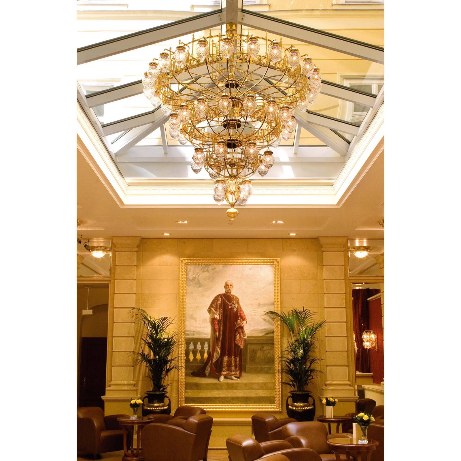 Der imposante Kronleuchter aus der BUDAPEST-Kollektion mit 52 Leuchten taucht großzügige Räume in ein faszinierendes Licht. Vier abwärts gerichtete Lichtreihen verjüngen sich harmonisch nach unten, wodurch eine effektive allgemeine Ausleuchtung und strahlende Beleuchtung im unteren Bereich gewährleistet werden. Die elegante Erscheinung der Messingarbeiten resultiert aus dem experimentellen Geist des ungarischen Jugendstils. Merkmale des Jugendstils verschmelzen dabei mit Rokoko-Motiven und traditionellen ungarischen Mustern.