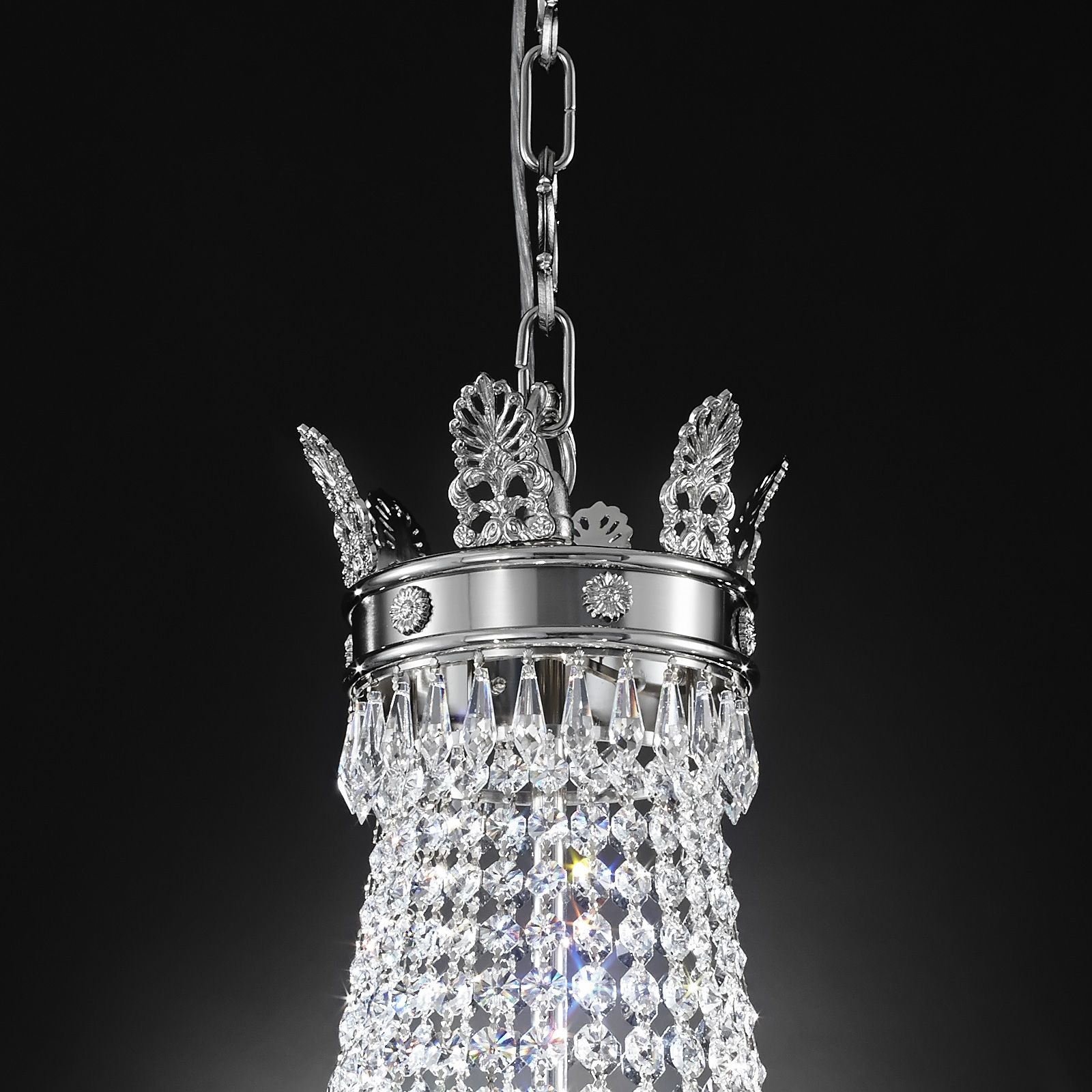 Ob privater Wohnraum oder Objekträume, der Kronleuchter EMPIRE CRYSTAL besticht aufgrund seines üppigen Erscheinungsbildes. Die vielen liebevollen Details beinhalten unter anderem ein geprägtes Zierband, kannelierte Arme, SCHÖLER CRYSTAL®-Kristallkoppen, die Kristallketten bilden sowie eine geschliffene Glasabdeckung. Für einzigartige Lichtverhältnisse sorgen die Kristalle, die bei Lichteinfall wunderschön glitzern und den Raum zum Funkeln bringen. Die Glasabdeckung, hinter der sich die 6 E27-Fassungen verstecken, sorgt für eine homogene Lichtverteilung, ohne den Betrachter zu blenden. Die schön geschwungenen Leuchtarme tragen E14-Fassungen, die mit maximal 40 Watt bestückt werden können. Mithilfe eines Dimmers kann die Helligkeit je nach Stimmung eingestellt werden.