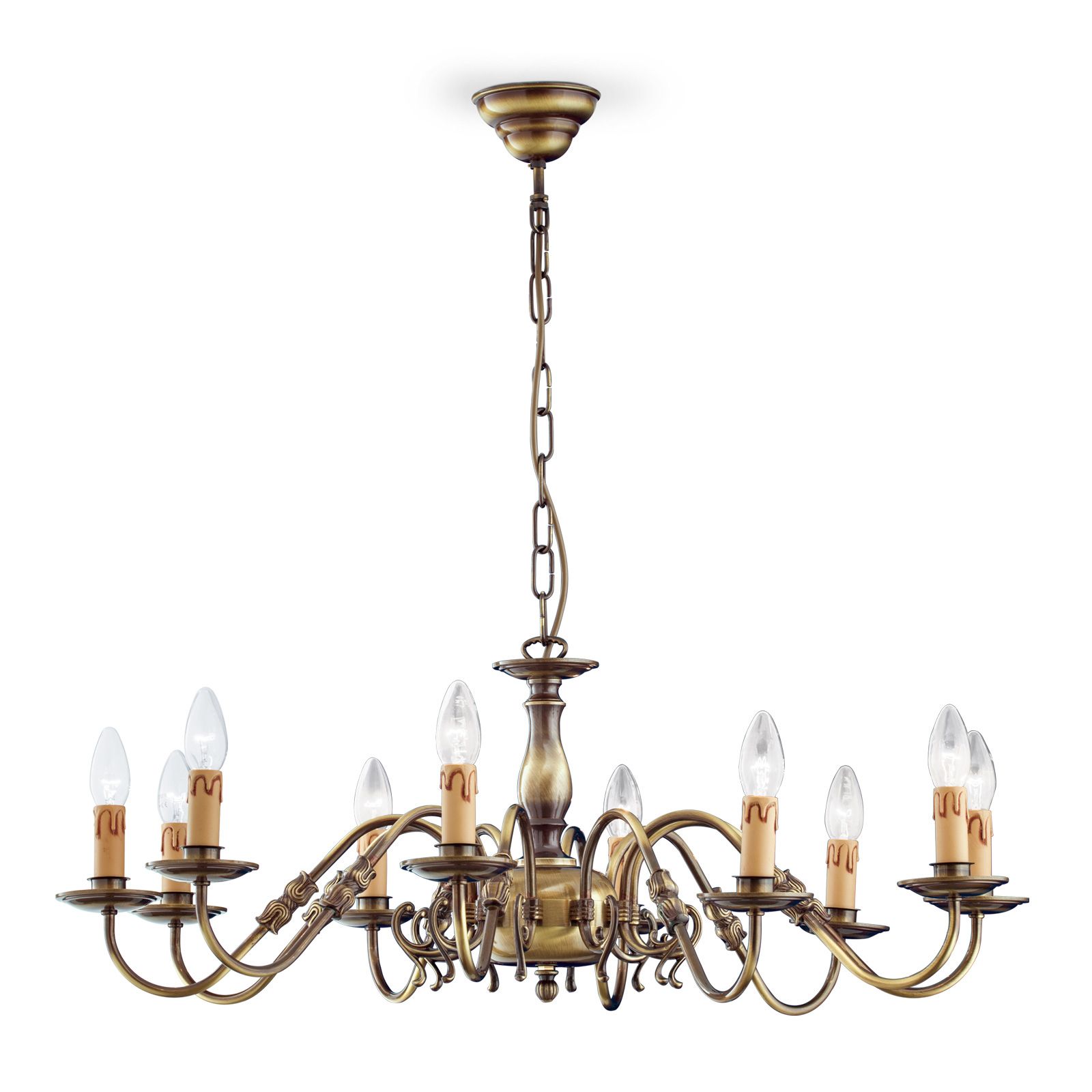 Die ausladenden, dezent mit Zierrat versehenen Arme folgen durch ihre S-Form den klassischen Vorbildern. Die Kerzenoptik der Lampenfassungen und die Patina-Optik vermitteln eine erhebende, feudale Stimmung. Dunkle Wandfarben und elegant-moderne Polstermöbel könnten einen originellen Kontrast ins Wohnzimmer zaubern. Der Luster verfügt über zehn E14-Fassung für je maximal 40 Watt.