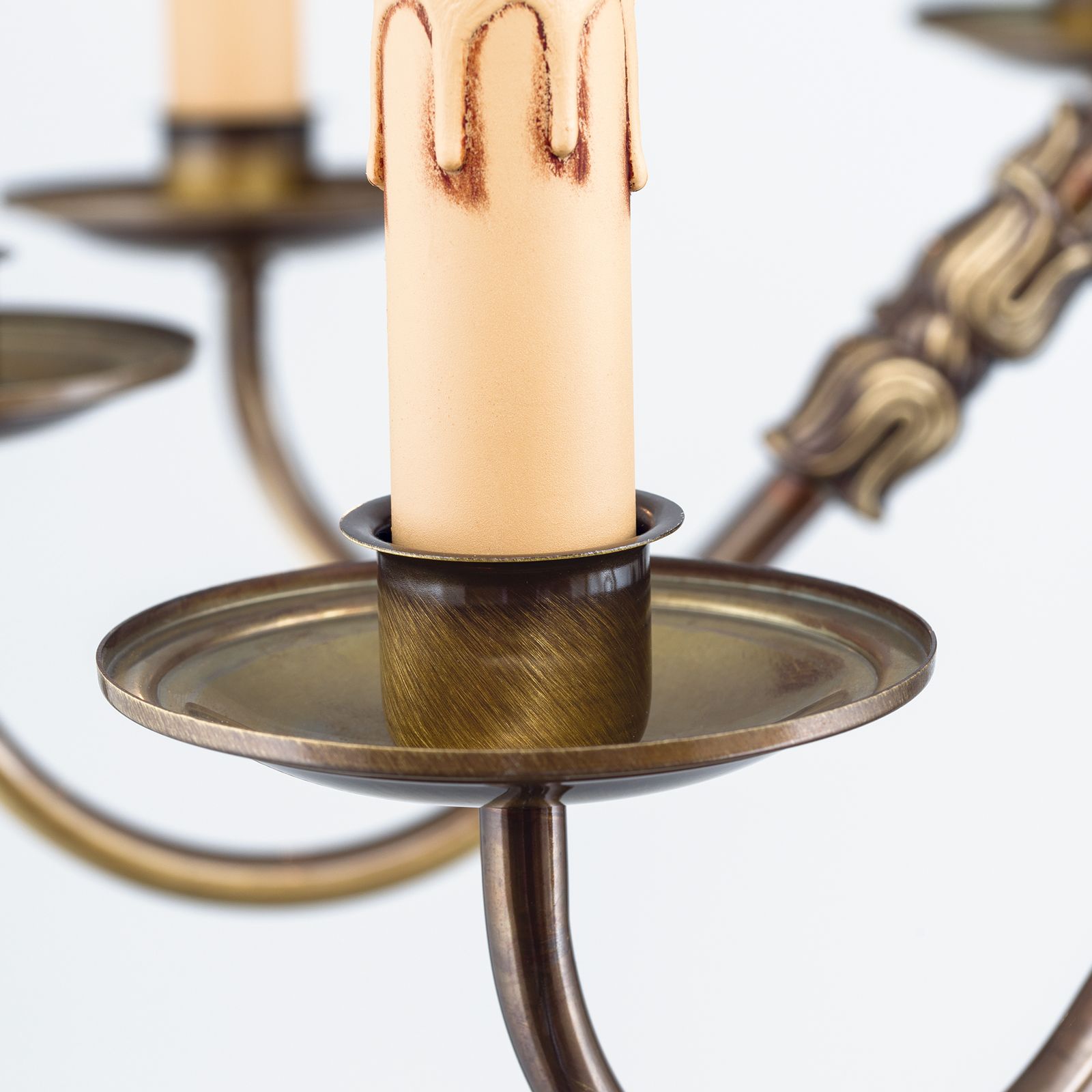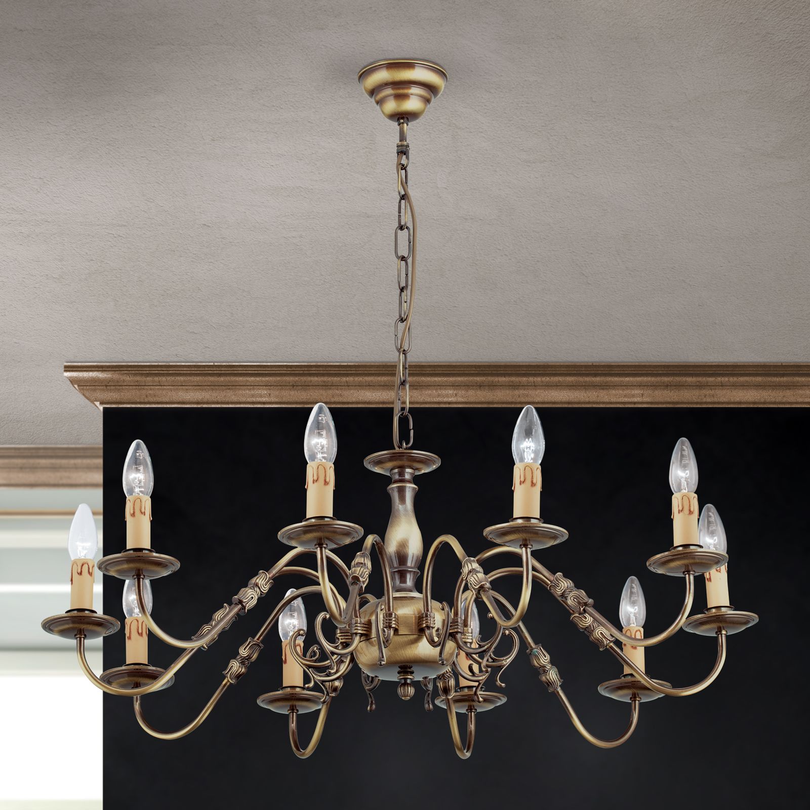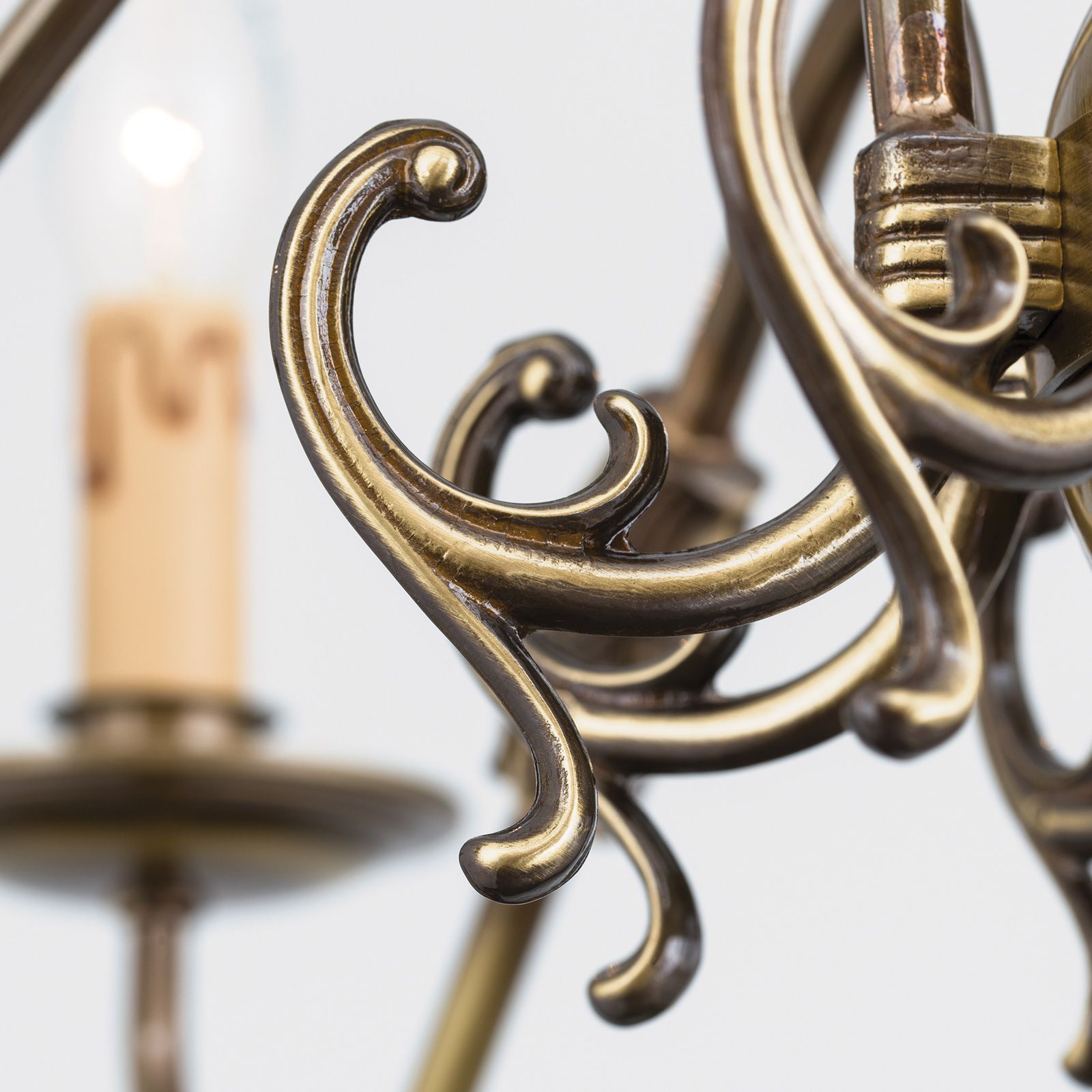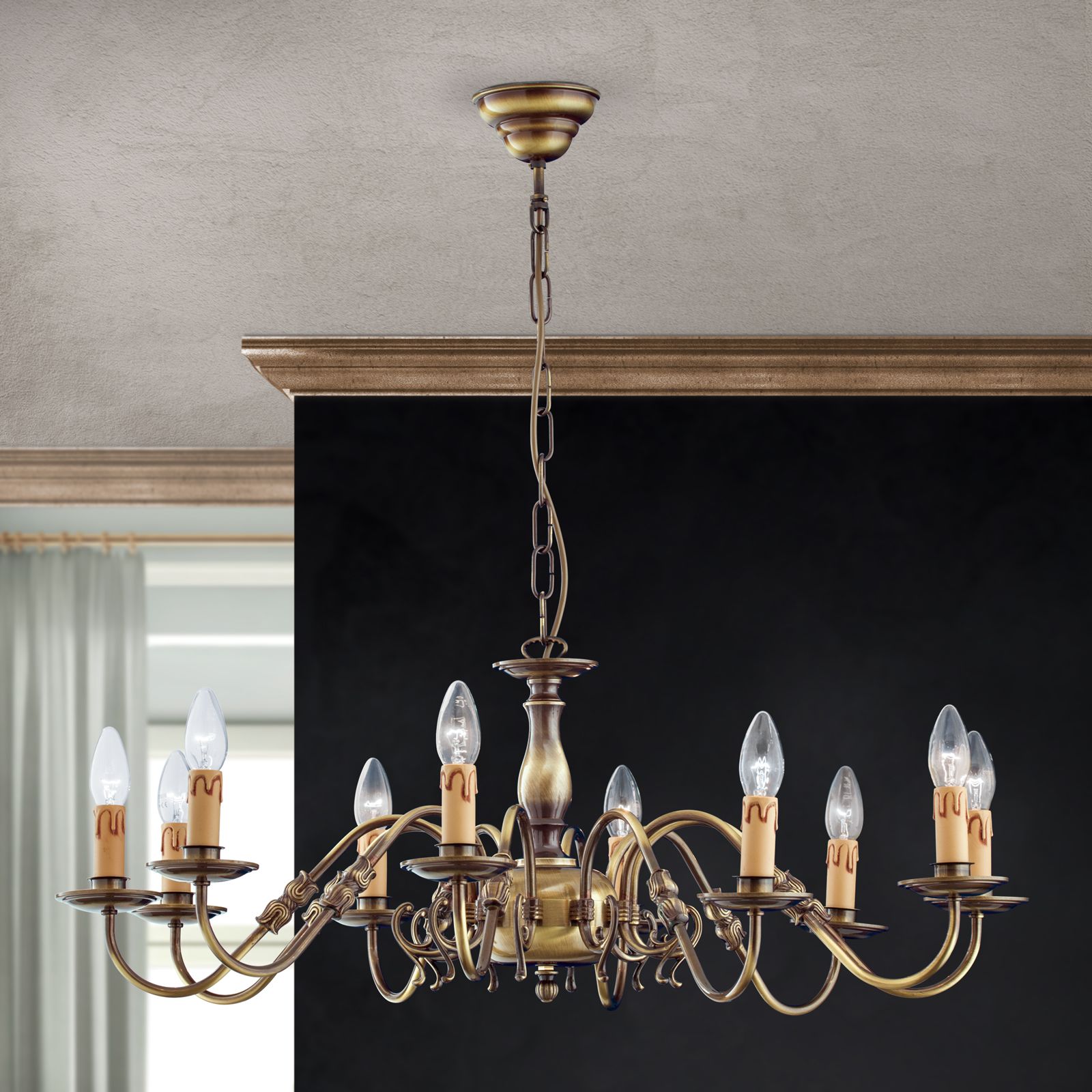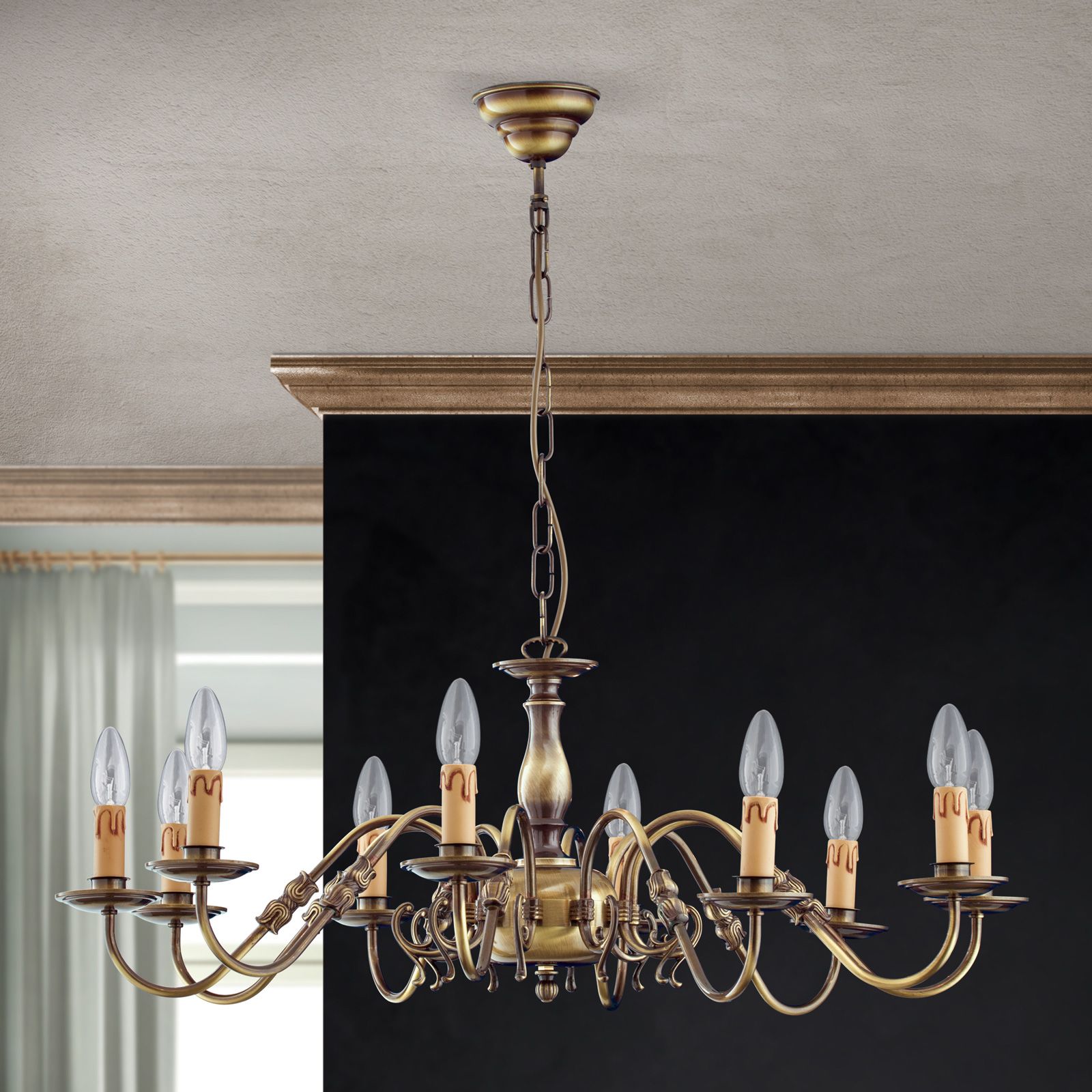 Der 10-flammige flämische Stilluster zeichnet sich durch seine Abmessungen aus: beeindruckende 82 Zentimeter Durchmesser bei einer Höhe von nur 30 Zentimetern. Mit der Abhängung entsteht nur eine Gesamthöhe von einem Meter. Damit eignet sich dieser Kronleuchter auch für Räume mit niedrigerer Deckenhöhe, ohne bei Eleganz und Leuchtstärke Kompromisse zu machen.