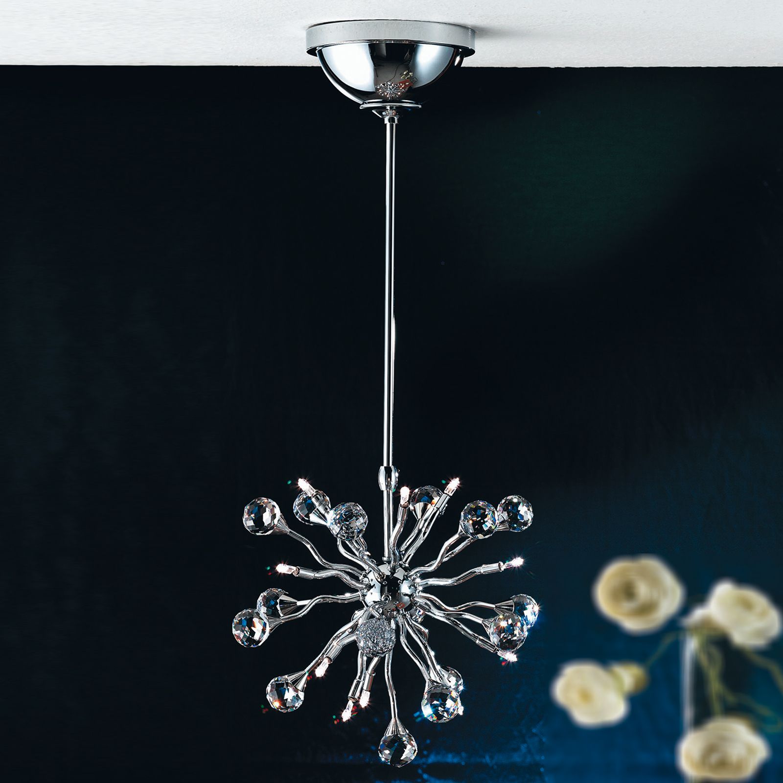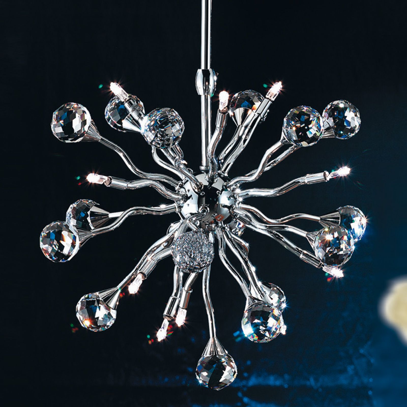 Mit der Serie GALAXY rückt der die Vorstellung der Menschen so anregende Kosmos in den Mittelpunkt. Der 12-flammige Luster aus dieser Kollektion stellt in jedem modernen Einrichtungsensemble einen kraftvollen Designakzent dar. Die dynamische Bewegung der filigranen Arme, an deren Enden hochwertige Kristalle und Leuchtmittel um die Wette strahlen, erzeugt einen kompakten Lichtkörper. In einem Wohnzimmer wird man sich an einem rundum ausgeleuchteten Raum erfreuen. Über einem Esstisch oder Schlafzimmerspiegel erhält man ein kräftiges Licht. Der Luster ist mit zwölf G4-Fassungen zu je maximal 10 Watt versehen, Leuchtmittel inbegriffen.