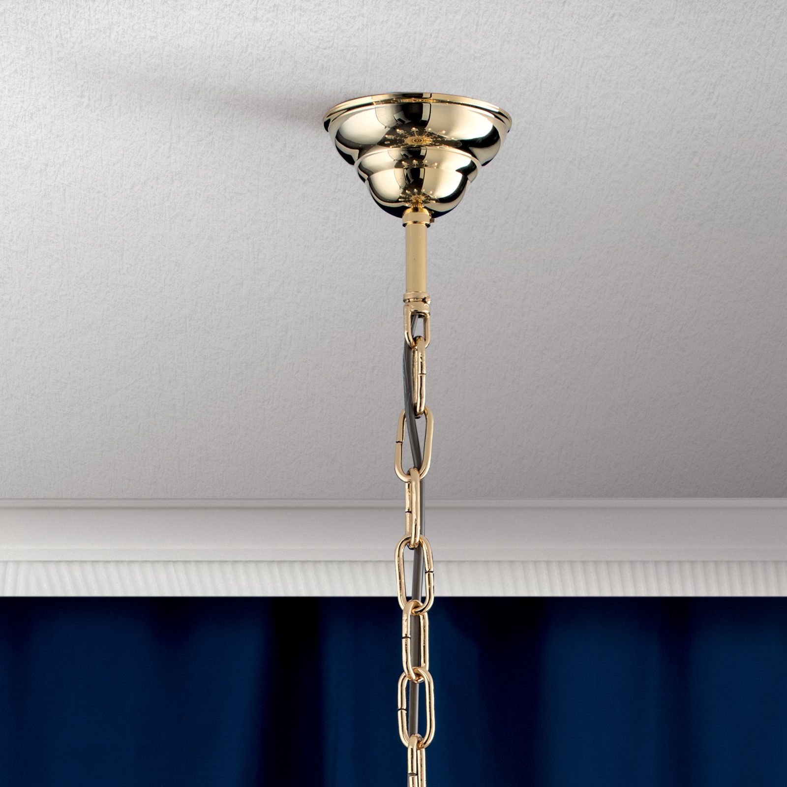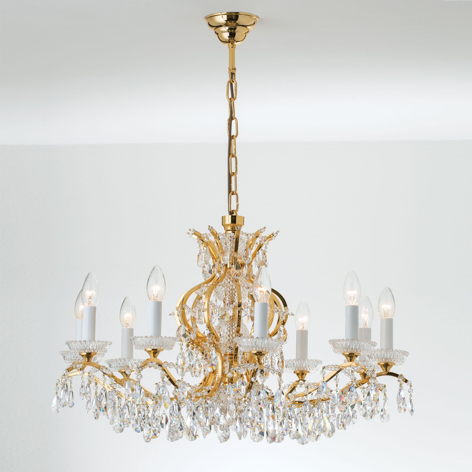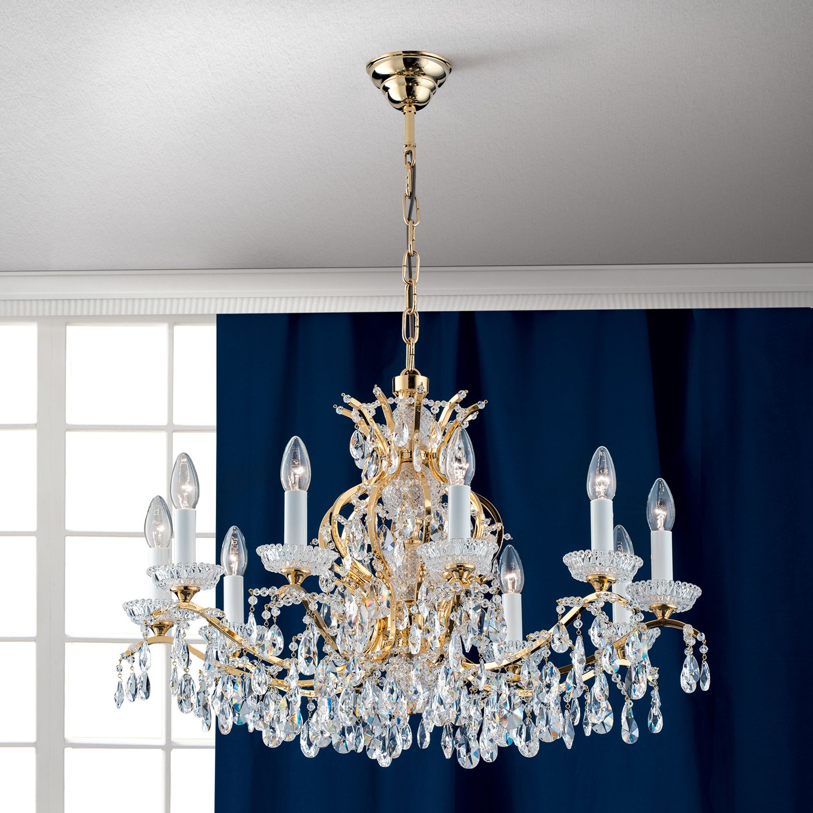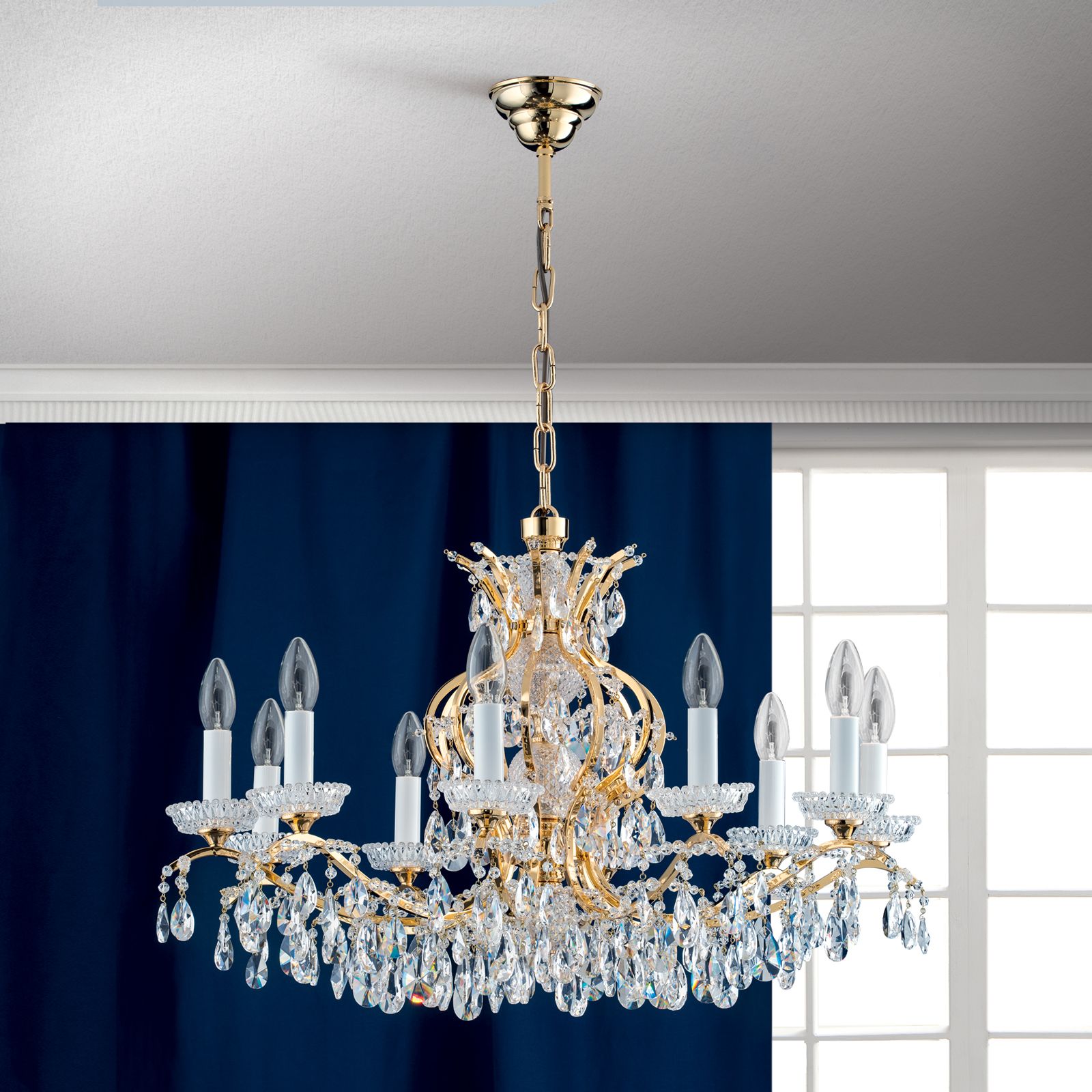 Der 10-flammige Kronleuchter aus der Serie HIROHITO eignet sich für die Montage in gehobenem Ambiente. Vergoldetes Messing, geschliffene Kristalle und die opulente, an eine Krone erinnernde Gestaltung lassen an einen Einsatz in einem geräumigen Salon denken. Große Eingangsbereiche einer Anwaltskanzlei oder Arztpraxis eignen sich ebenso, um Klienten und Patienten ein einladendes Ambiente zu bieten. Auch eine feierliche Tafel wird mit der Beleuchtung durch diesen Luster an Glanz gewinnen. Das Gold und der Kristallbehang erzeugen zudem ein von zehn E14-Fassungen zu je maximal 40 Watt befeuertes Spektakel an Reflexionen und Lichtbrechungen.