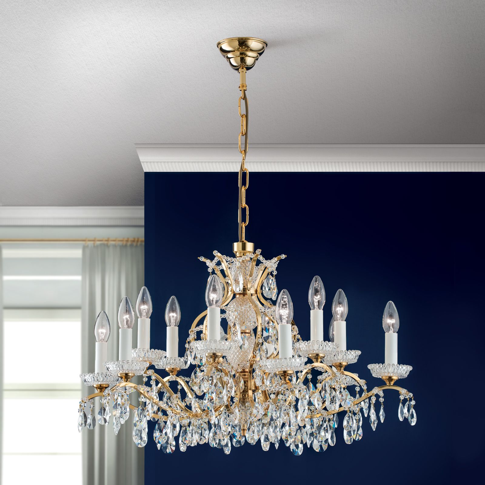 Der 6+6-flammige Luster aus der HIROHITO-Reihe lädt uns auf eine Reise in imperiale Welten ein. Was dem japanischen Tenno zusagt, kann sich auch in den heimischen vier Wänden sehen lassen. Zwei Lichtkränze zu je sechs Flammen umfassen das prunkvolle Zentrum, einen kristallenen balusterförmigen Schaft. Dieser wird umgeben von vergoldeten Spangen, die in kräftig geschwungene, weit ausladende Arme übergehen. Die in Kerzenoptik gehaltenen Lampenfassungen stehen auf Tropfschalen aus Bleikristall. Die Lichtwirkung der zwölf E14-Fassungen zu je maximal 40 Watt gemeinsam mit all den Reflexkörpern – Rosette, Kette, Korpus aus Gold, reicher Kristallbehang - macht jedem Raum mit großzügigen Dimensionen alle Ehre.