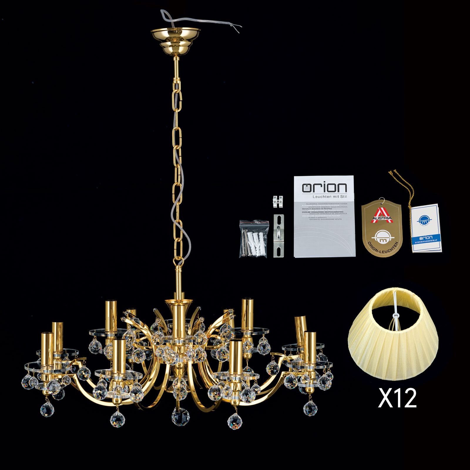 Der Luster mit einer Gesamthöhe von 105 cm und einem Durchmesser von 74 cm ist mit 12 E14-Fassungen versehen und kann mit maximal 40 Watt je Fassung betrieben werden. Erhältlich ist er in den Farben Chrom mit weißen Schirmen und Gold mit champagnerfarbenen Schirmen.