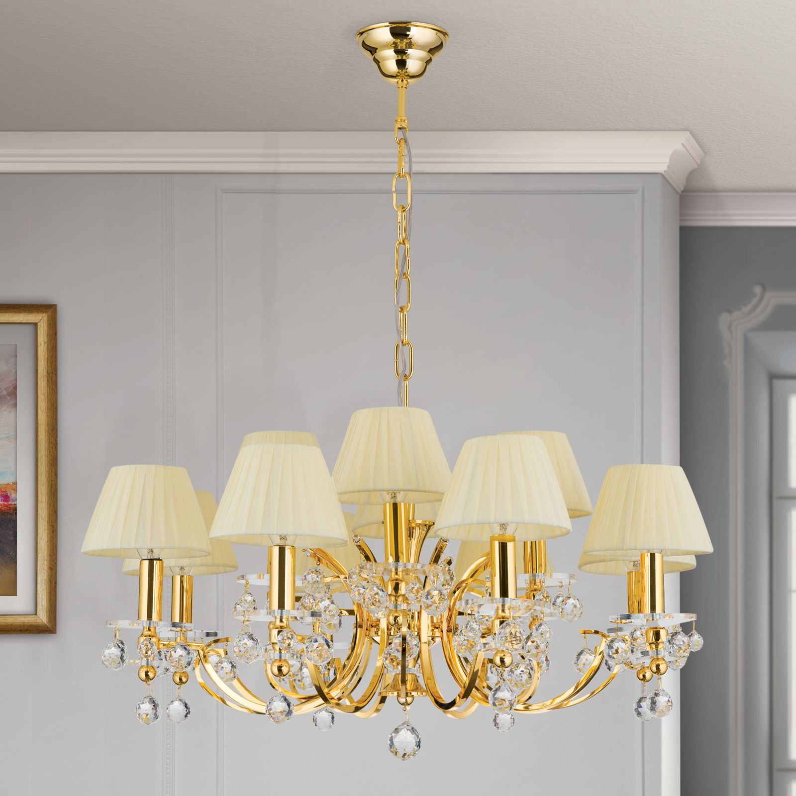 Luster KRISTALLDESIGN, 12-flammig, Gold mit champagnerfarbigen Schirm