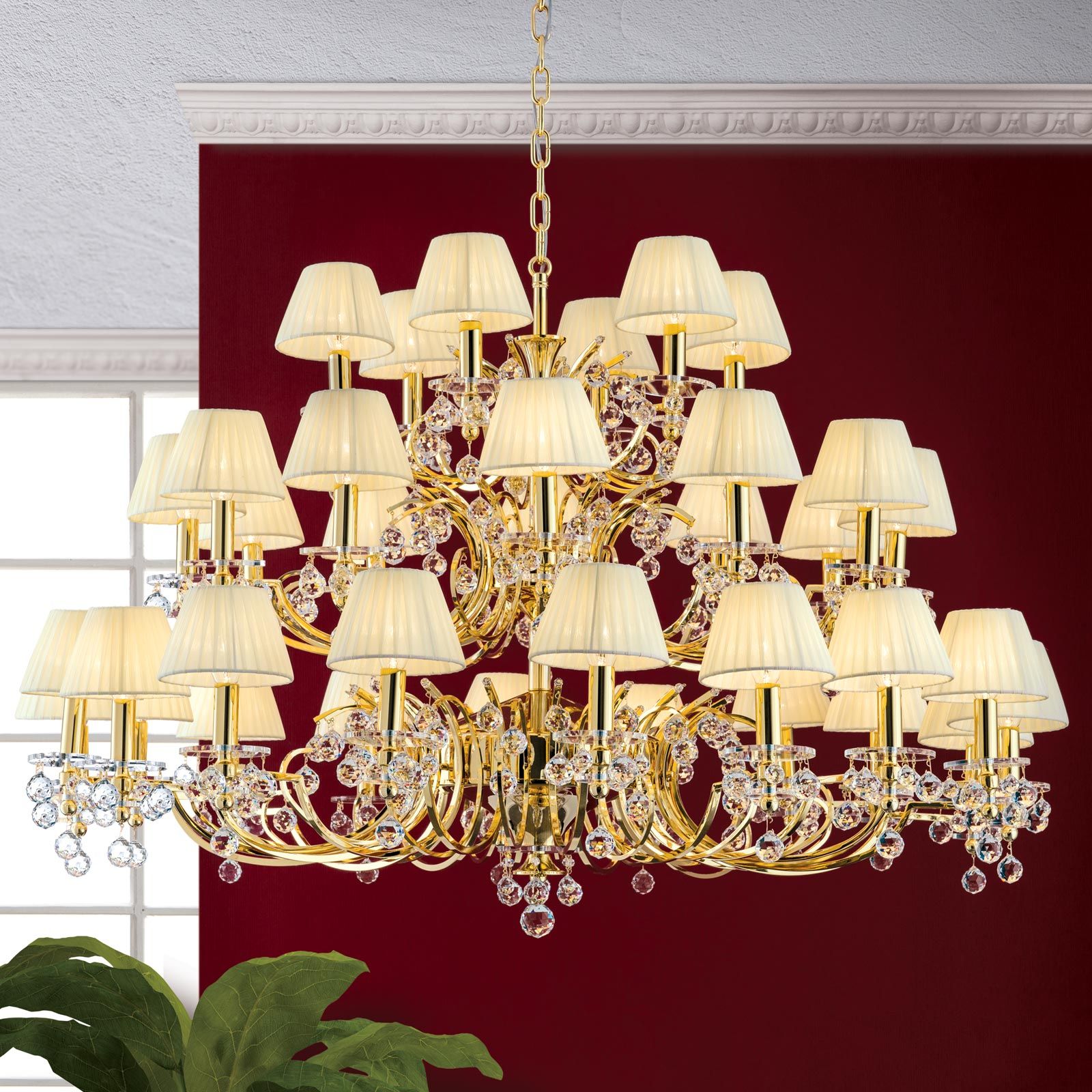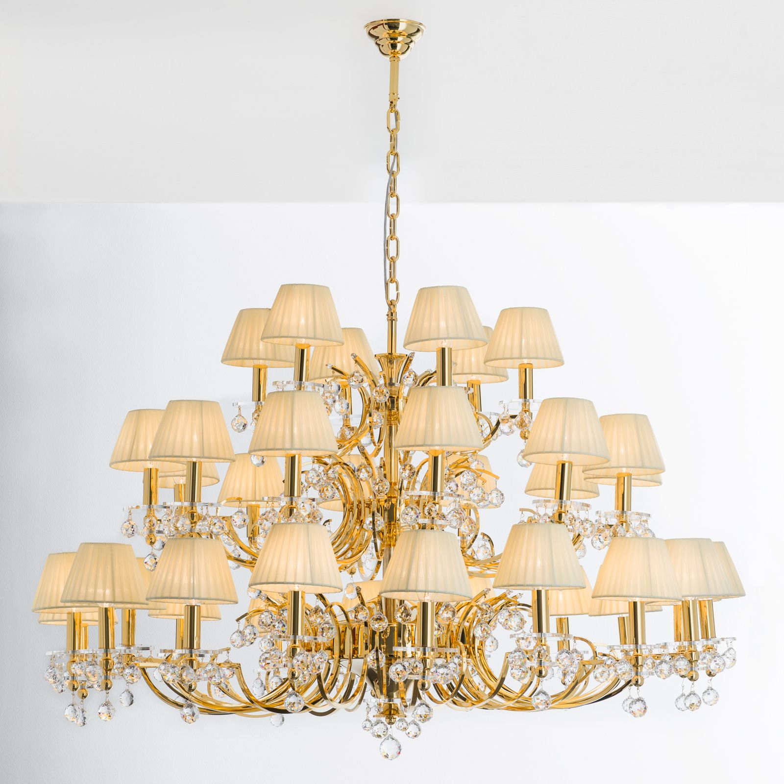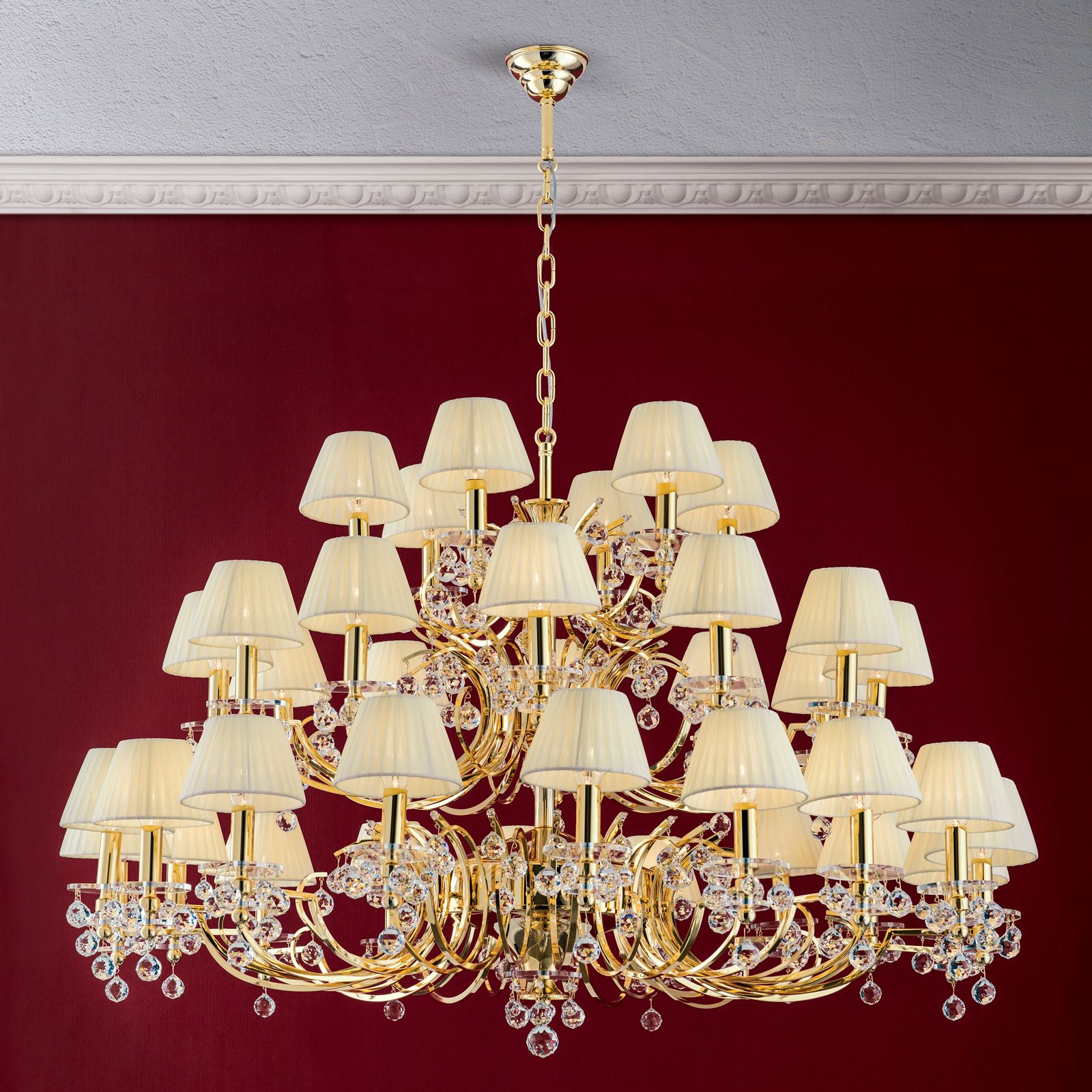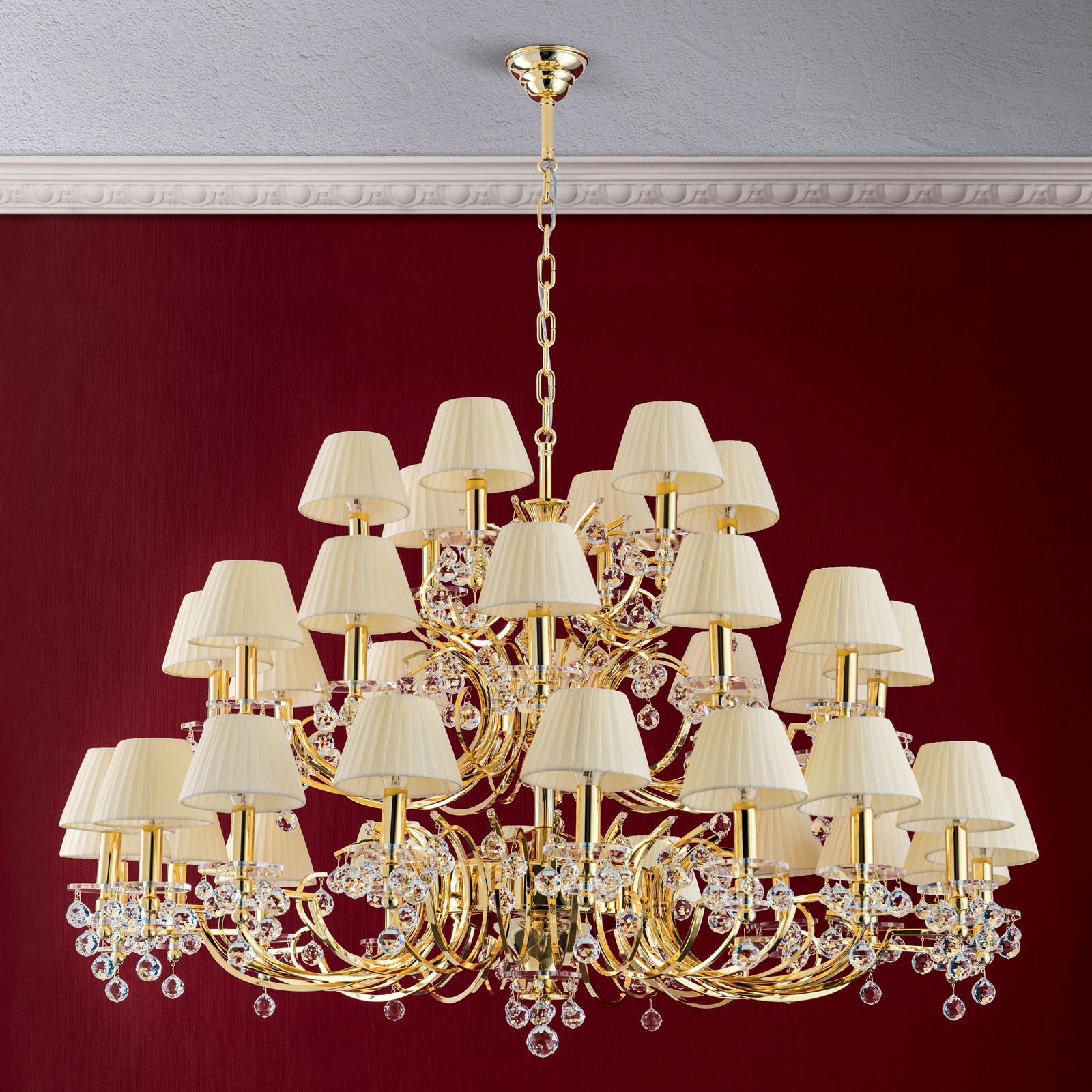 Luster KRISTALLDESIGN, 36-flammig, Gold mit champagnerfarbenen Stoffschirmen