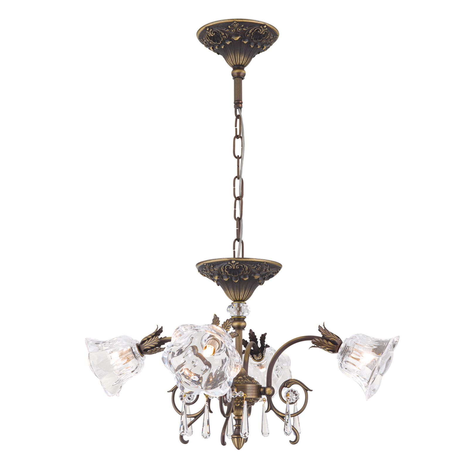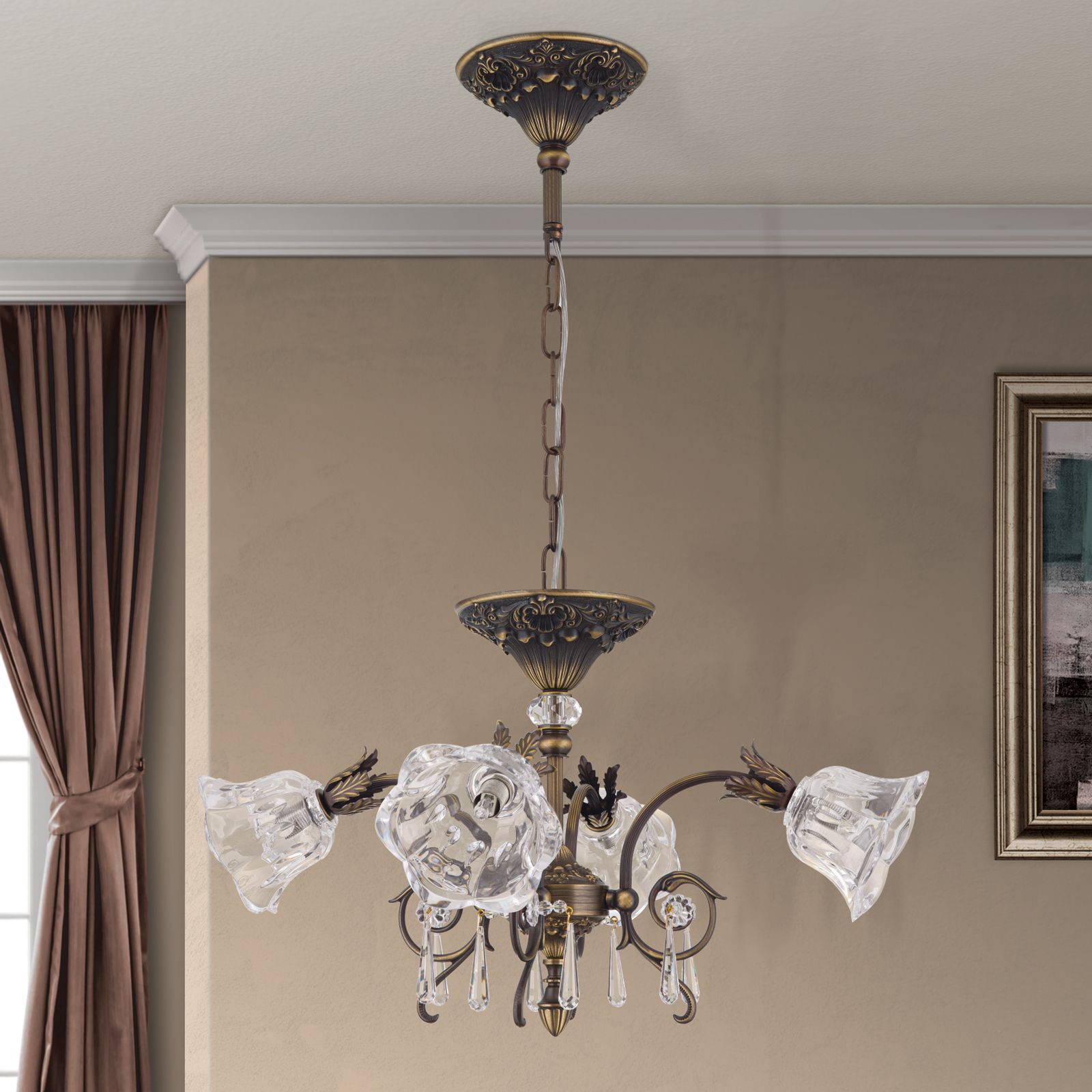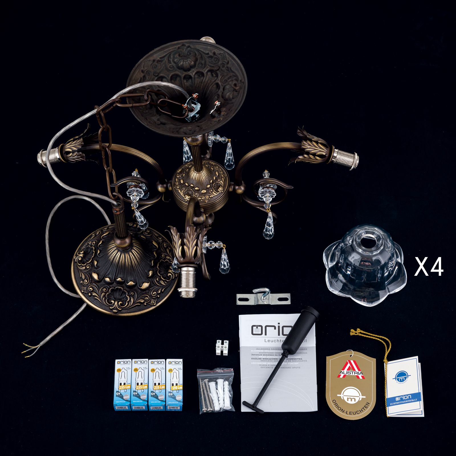 Die 4 G9-Fassungen können mit maximal 40 Watt/Lampe bestückt werden. Je nach Stimmung kann mit Hilfe eines Dimmers die Helligkeit reguliert werden. Der 4-flammige Kronleuchter ist in den Oberflächen Altpatina, Altsilber und Gold verfügbar.
