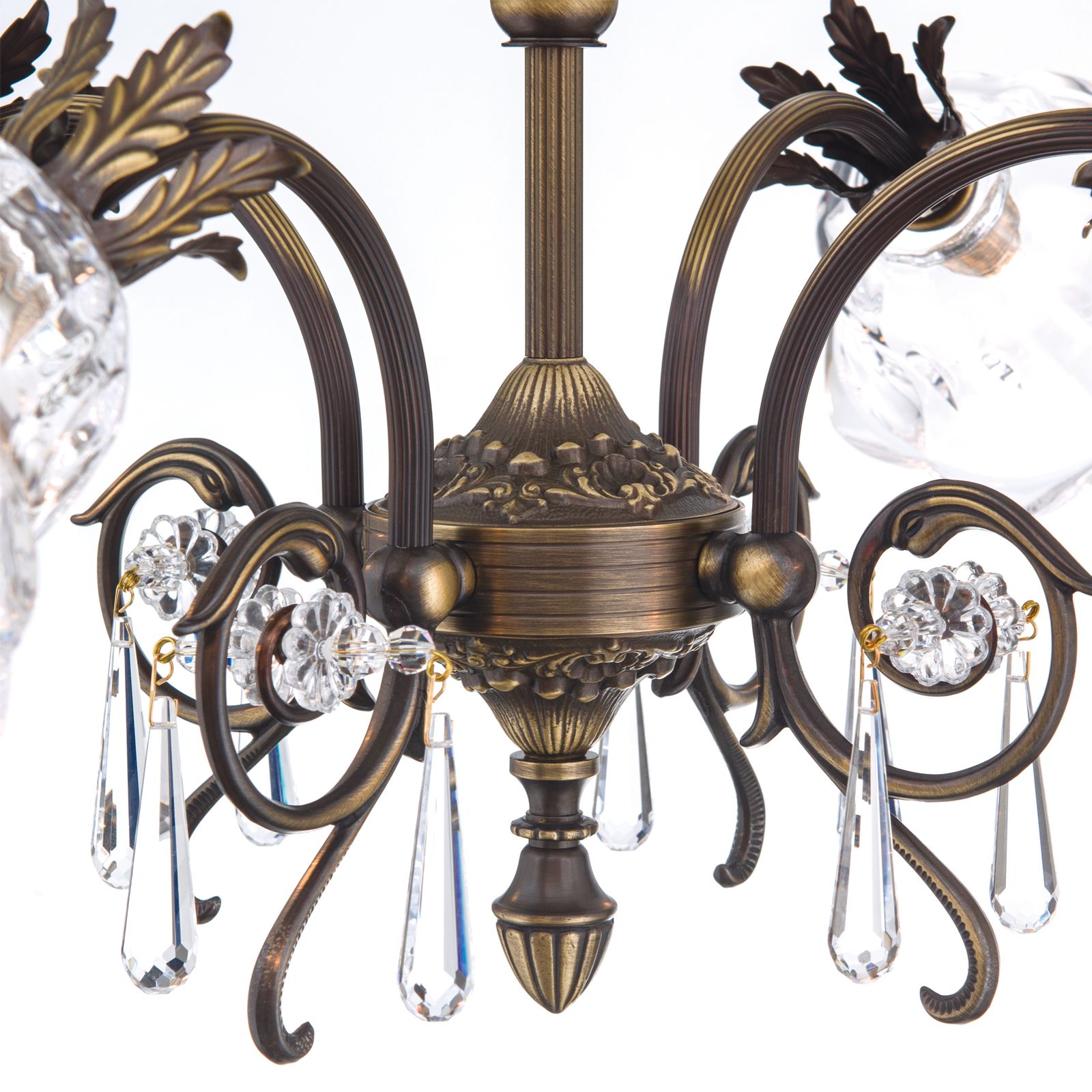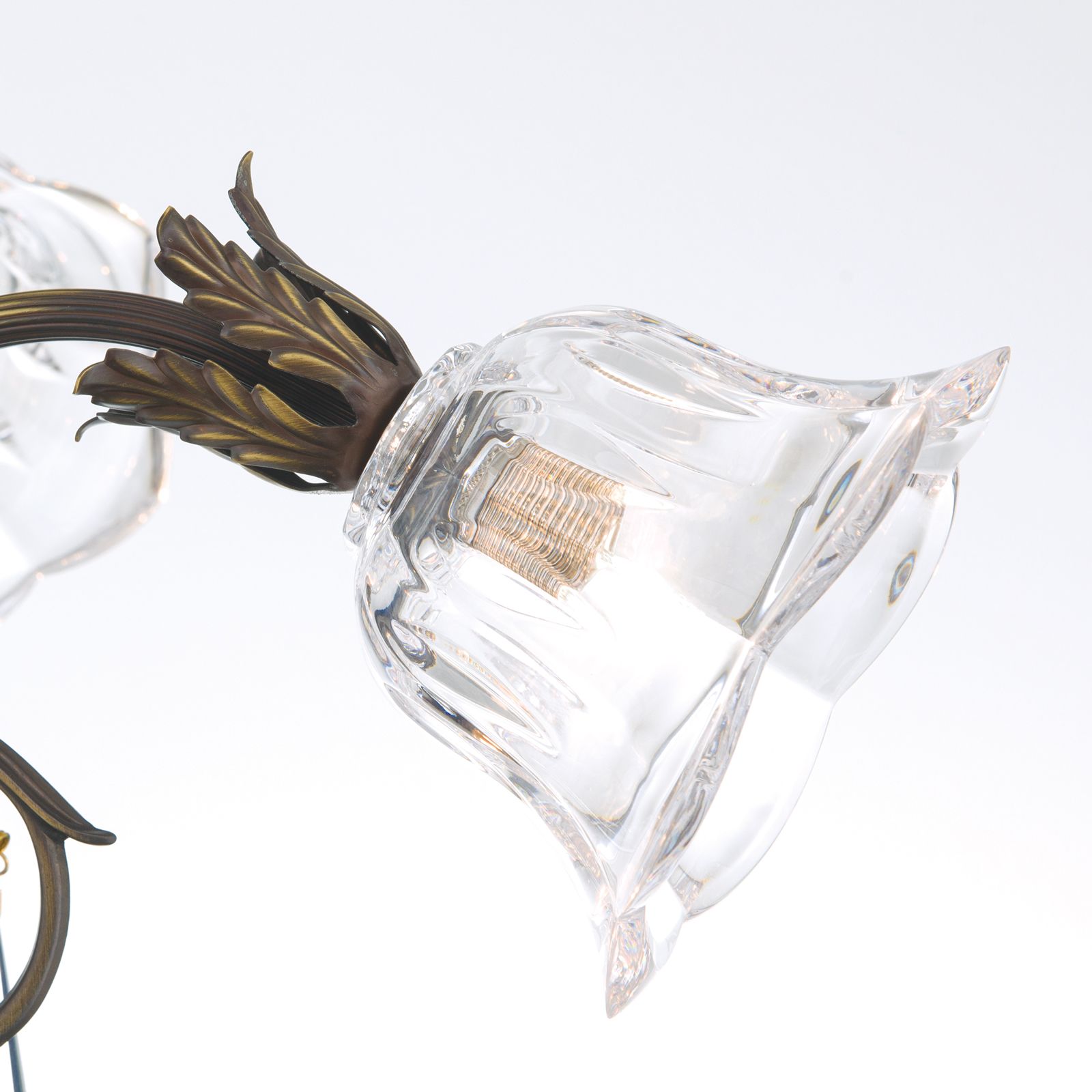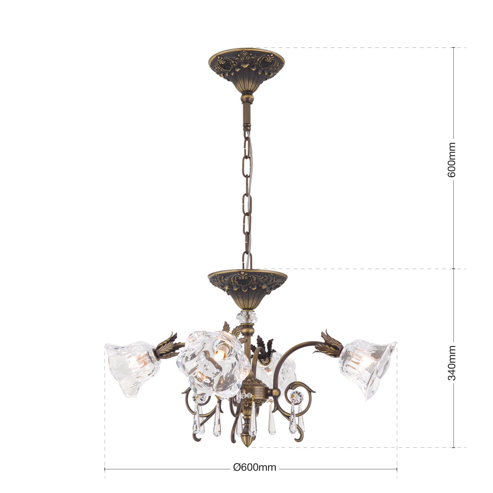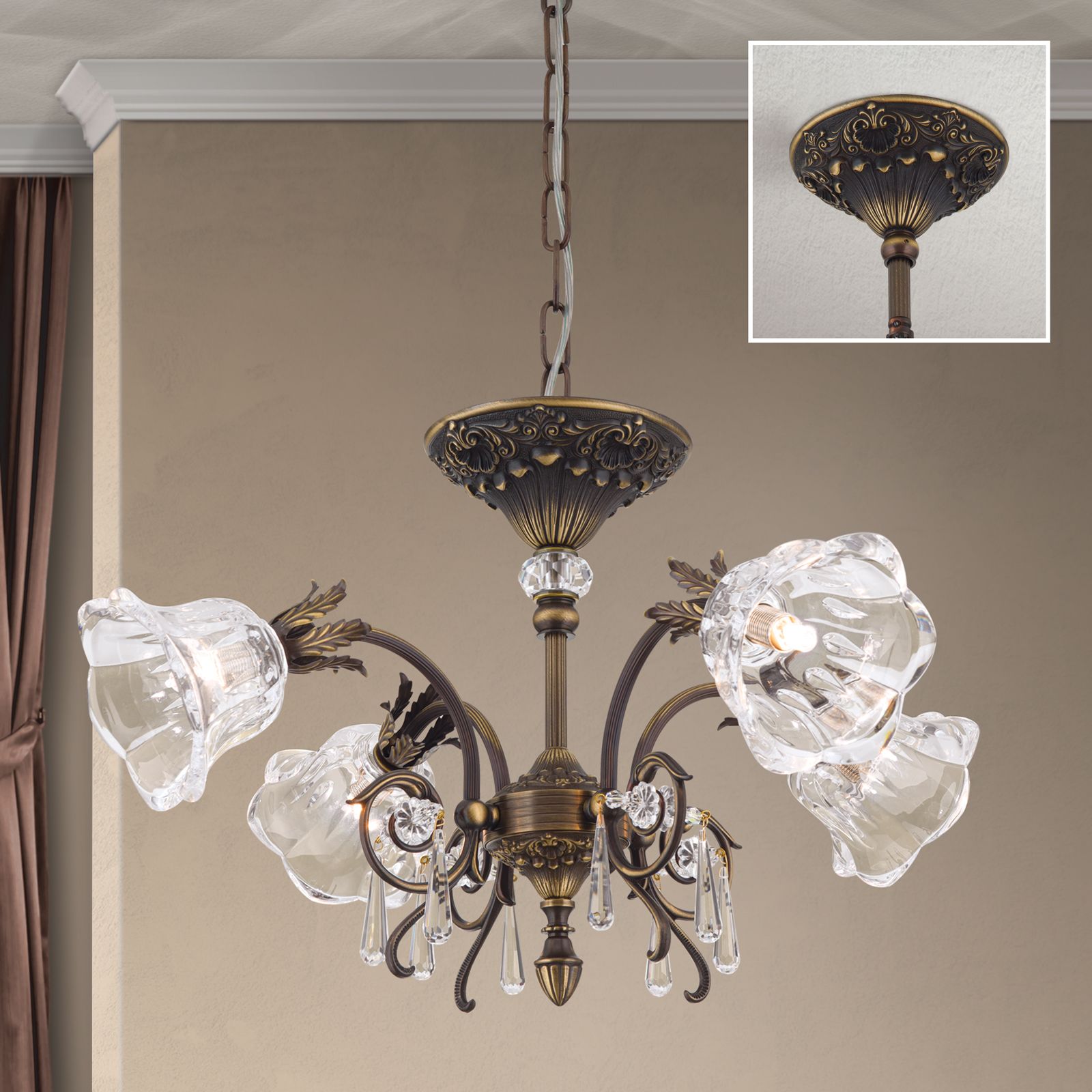 Das Gestell besteht aus Vollmessing und ist in verschiedenen Varianten erhältlich: handschattierter Altpatina, Gold oder Altsilber. Die Deckenrosette und die obere Schale beeindrucken durch ihre kunstvolle Verzierung, wobei sie durch einen großen 1A Vollschliff Kristall geschmückt wird, welcher sich unterhalb der Schale befindet. An der Säule befestigt, befinden sich fünf kannelierte Leuchtarme, die jeweils einen klaren Kristallschirm in Form einer Blüte tragen und das Licht in alle Richtungen gleichmäßig abstrahlen. Das florale Design wird durch die an den Schirmen platzierten Akanthusblätter verstärkt. Für zusätzliches Funkeln sind tropfenförmige 1A Vollschliff Kristalle verantwortlich, die unterhalb der Säule angebracht sind.