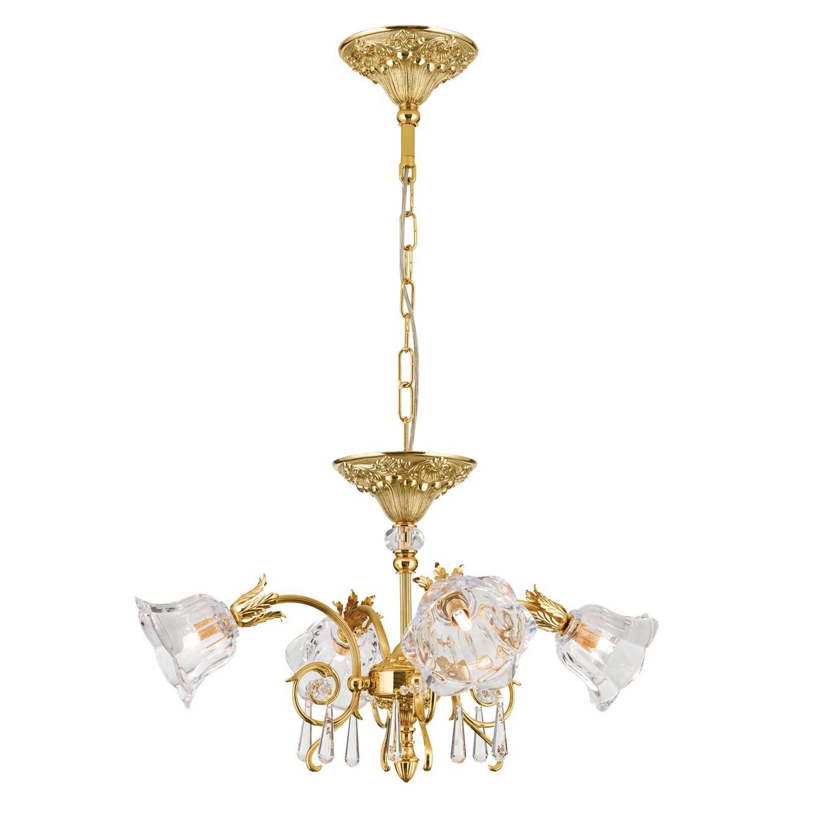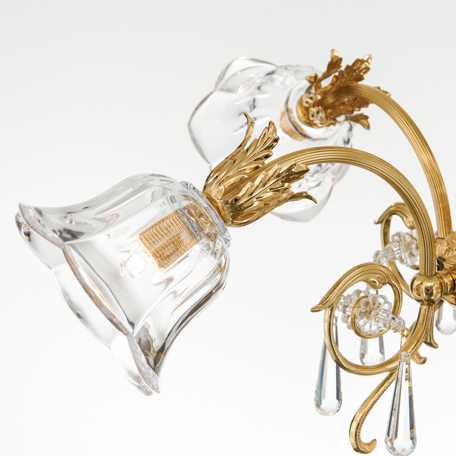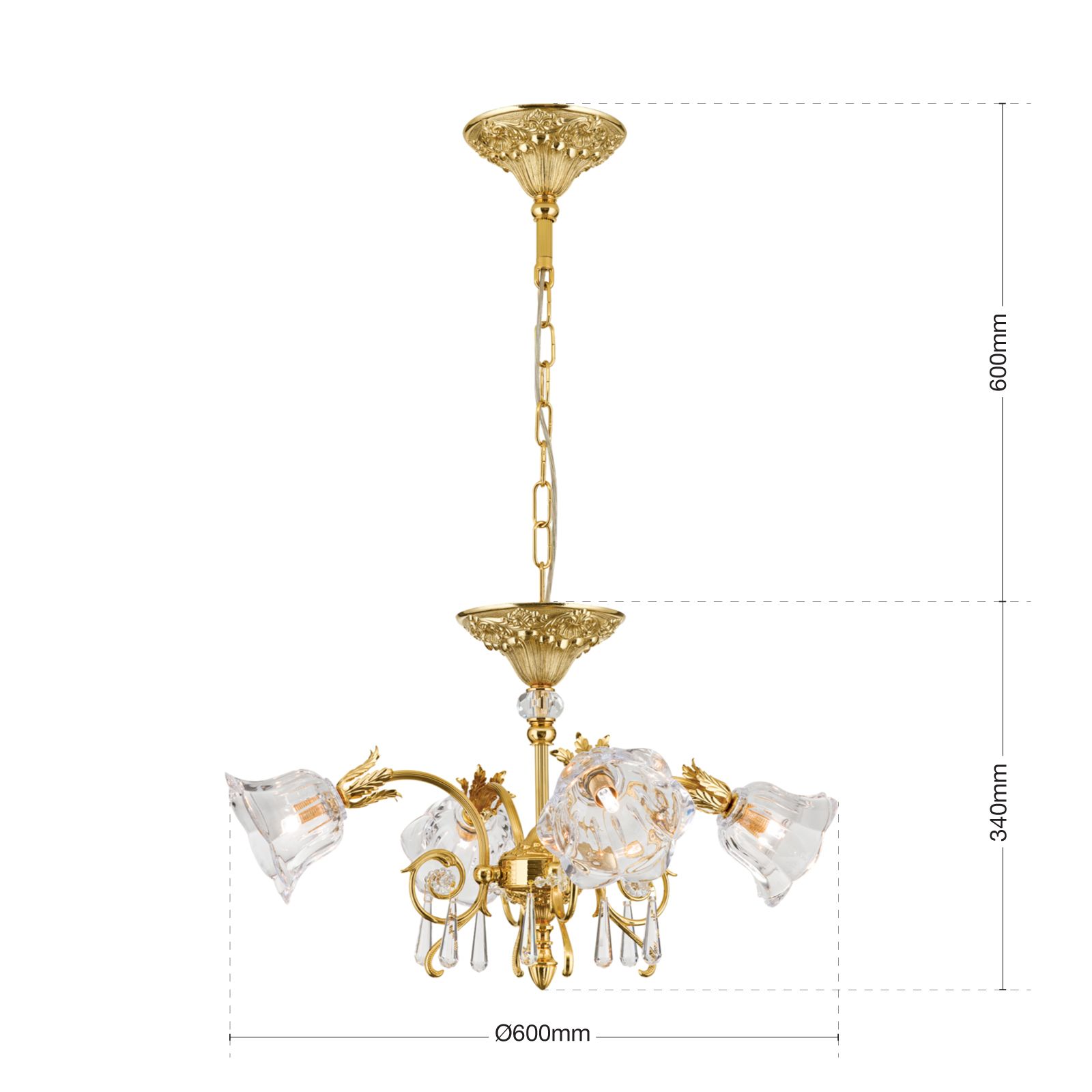 Das Gestell besteht aus Vollmessing und ist in verschiedenen Varianten erhältlich: handschattierter Altpatina, Gold oder Altsilber. Die Deckenrosette und die obere Schale beeindrucken durch ihre kunstvolle Verzierung, wobei sie durch einen großen 1A Vollschliff Kristall geschmückt wird, welcher sich unterhalb der Schale befindet. An der Säule befestigt, befinden sich fünf kannelierte Leuchtarme, die jeweils einen klaren Kristallschirm in Form einer Blüte tragen und das Licht in alle Richtungen gleichmäßig abstrahlen. Das florale Design wird durch die an den Schirmen platzierten Akanthusblätter verstärkt. Für zusätzliches Funkeln sind tropfenförmige 1A Vollschliff Kristalle verantwortlich, die unterhalb der Säule angebracht sind.