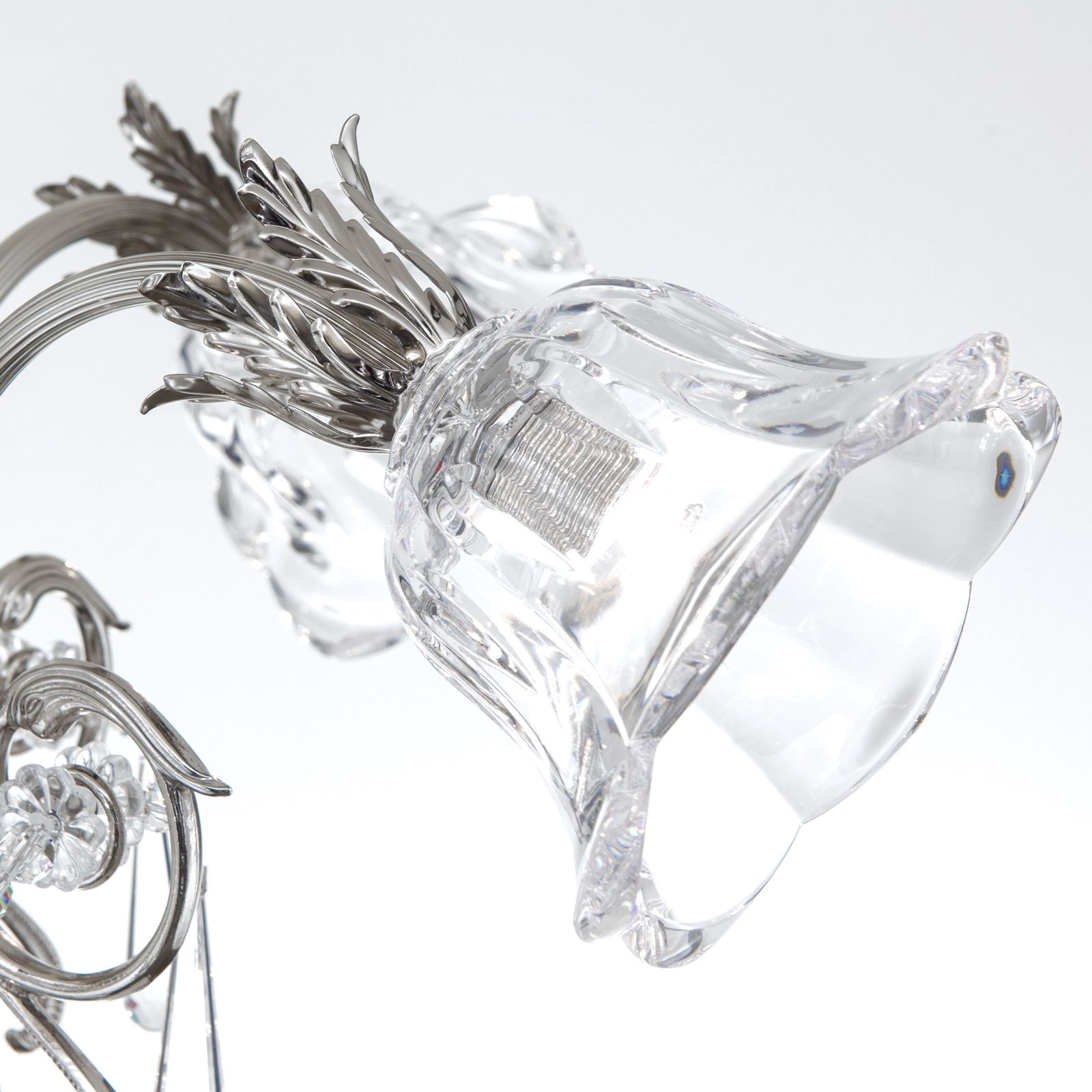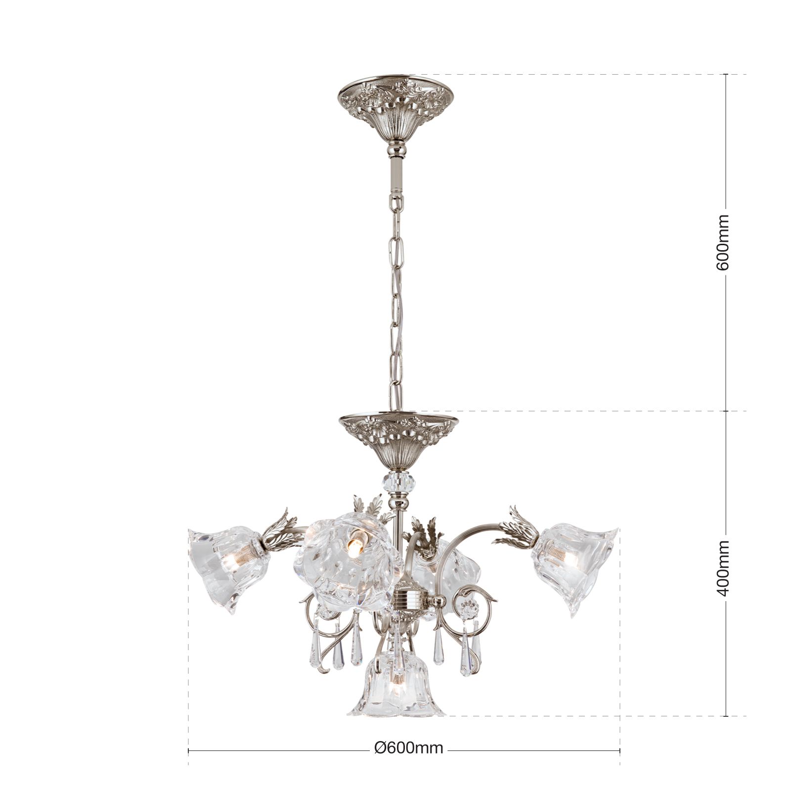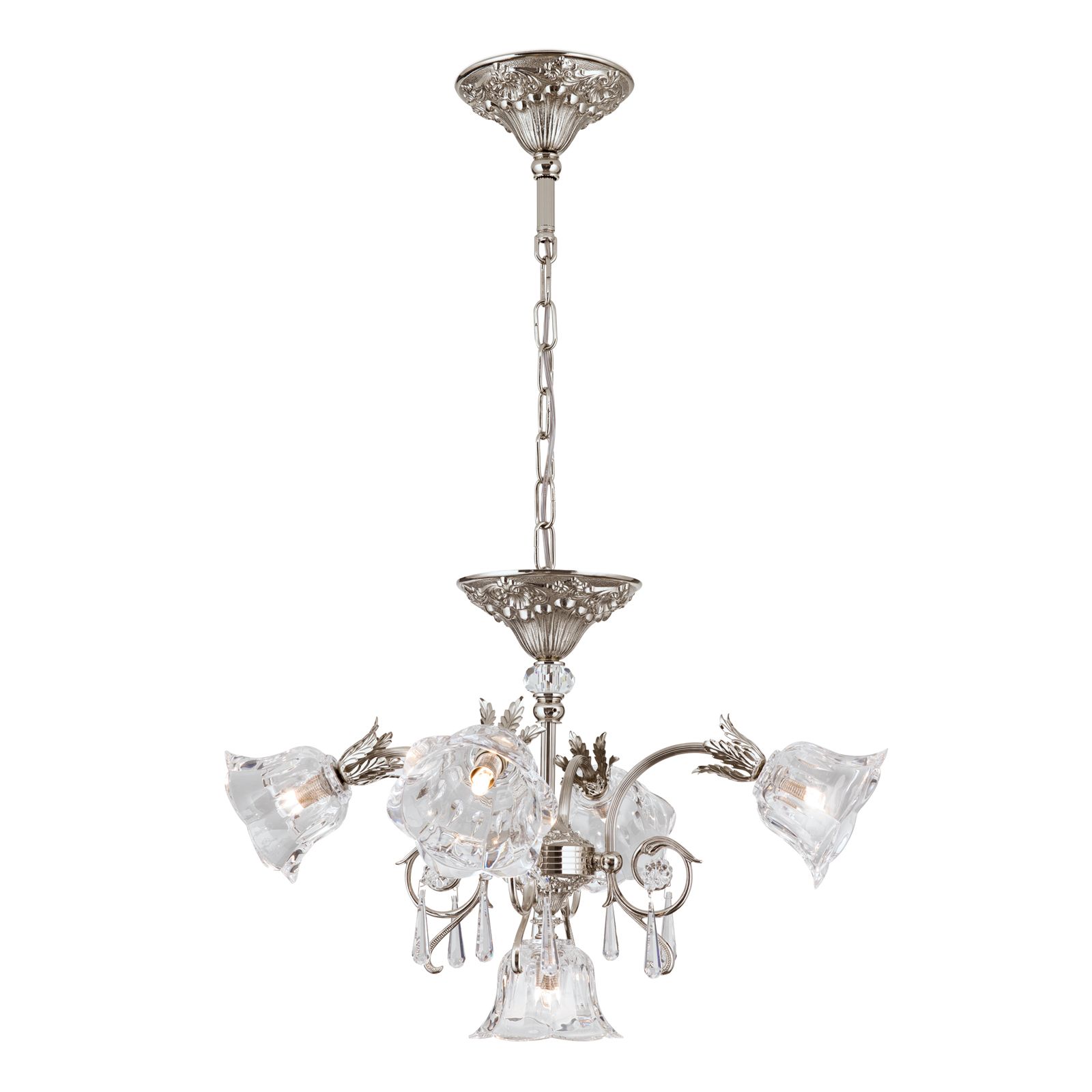 Außergewöhnlich und reich verziert zeigt sich der 5-flammige Kronleuchter aus der Serie LA BOHEME. Er fügt sich besonders gut in klassisch eingerichtete Wohnräume ein und sorgt dort alleine, aber auch in Gruppen angeordnet für eine höchst dekorative Beleuchtung.
