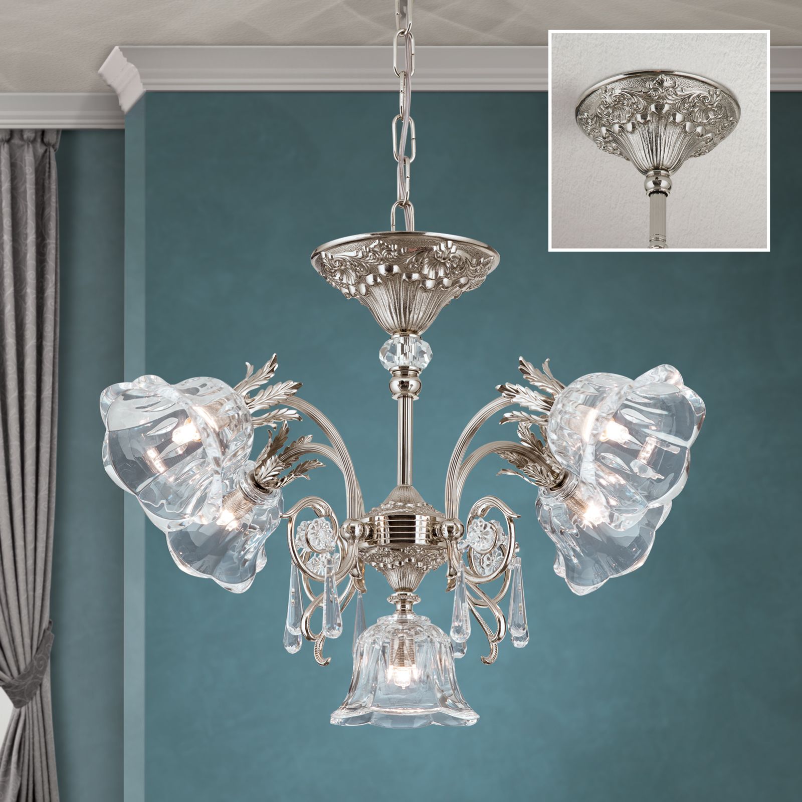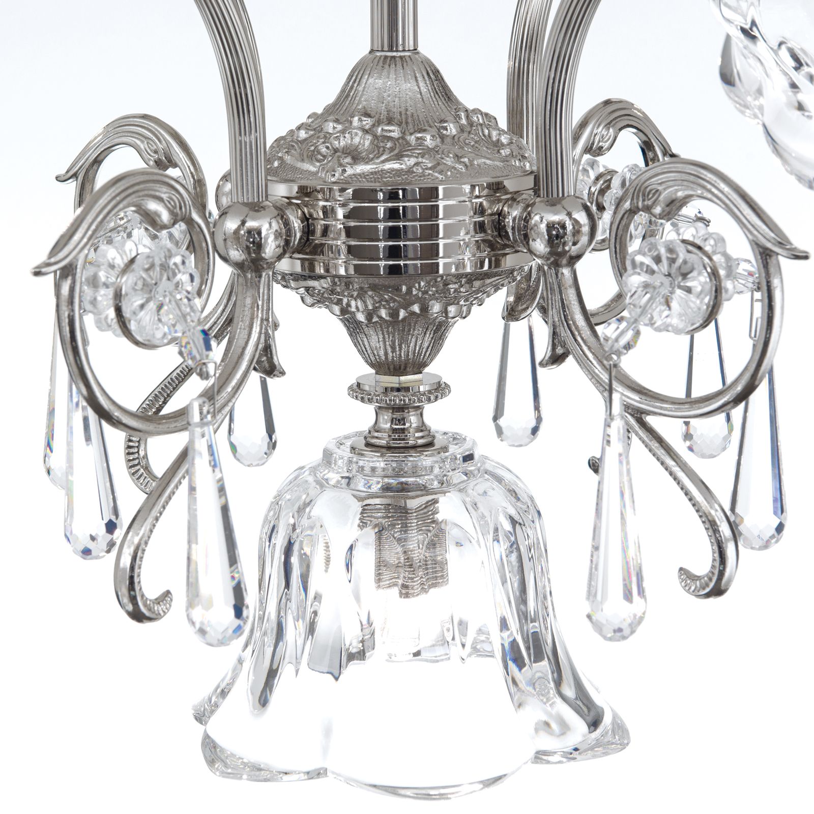 Aus Vollmessing ist er mit einer kunstvoll verzierten Deckenrosette versehen. Eine Säule trägt die 4 geschwungenen kannelierten Arme mit zahlreichen tropfenförmigen Kristallen. Die aufwendig geschliffenen Blütengläser aus Bleikristall sehen nicht nur hübsch aus, sondern geben das Licht in alle Richtungen ab. So kann der Kronleuchter zur Grundbeleuchtung eingesetzt werden.