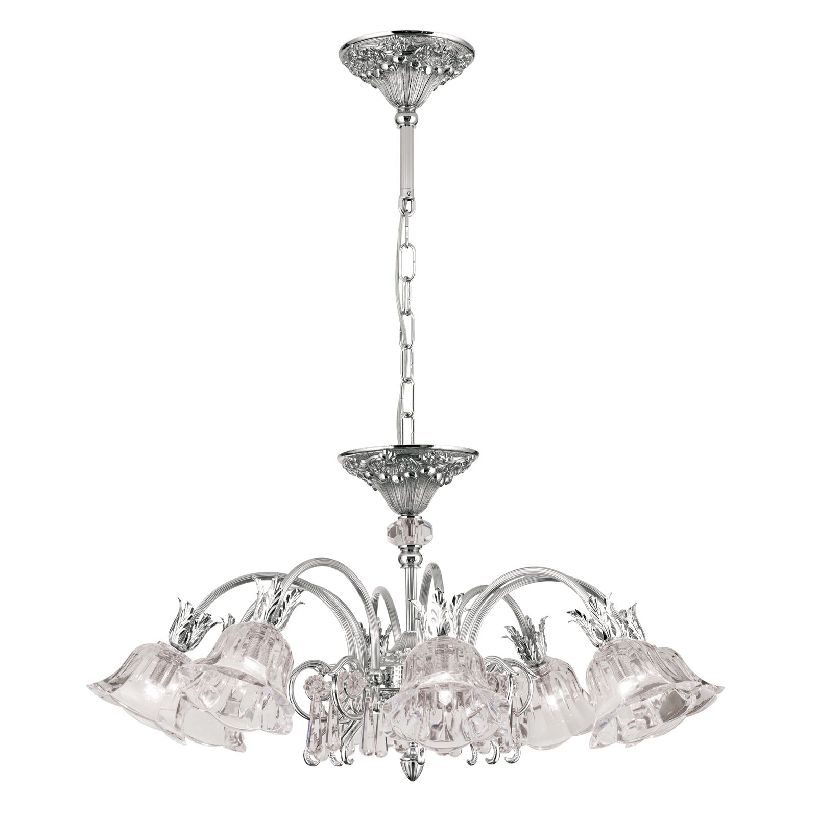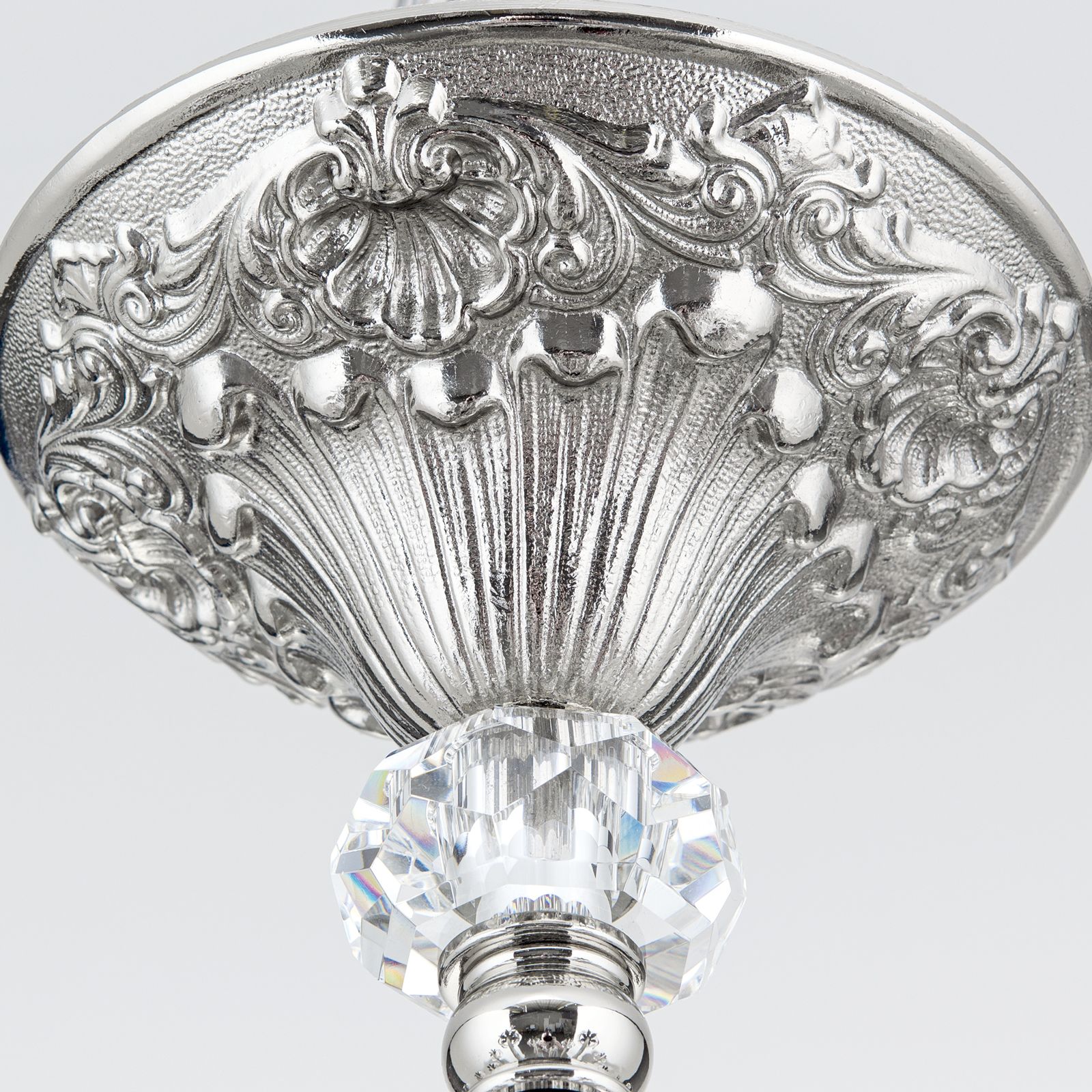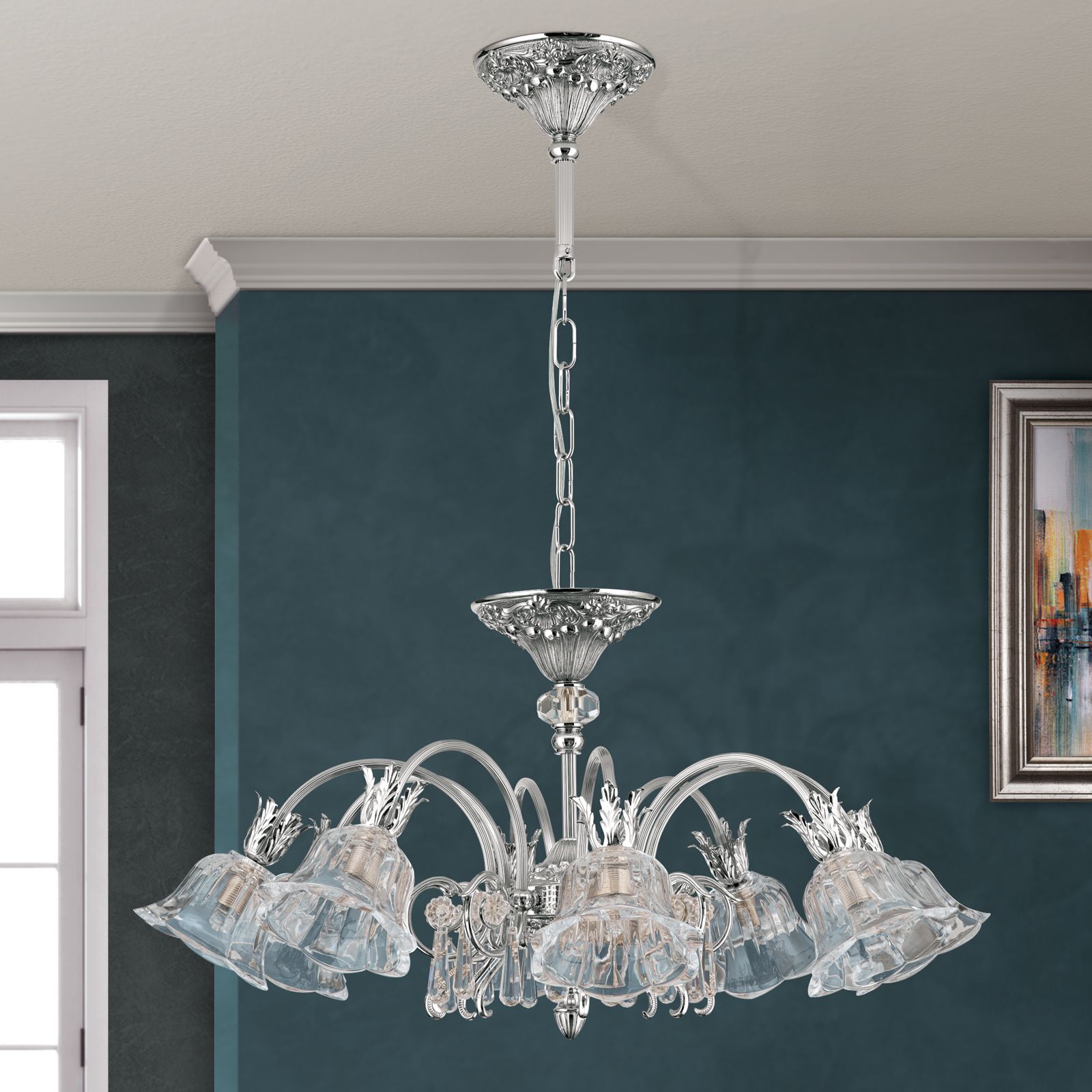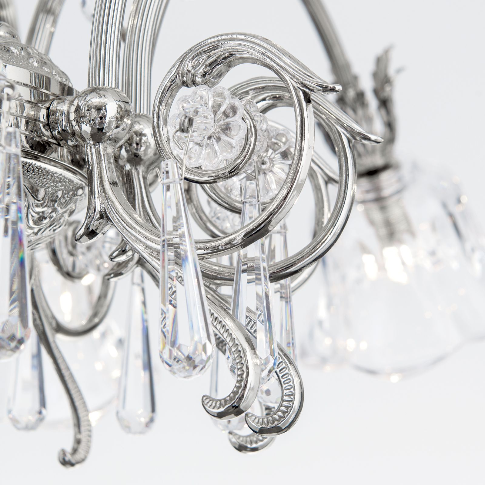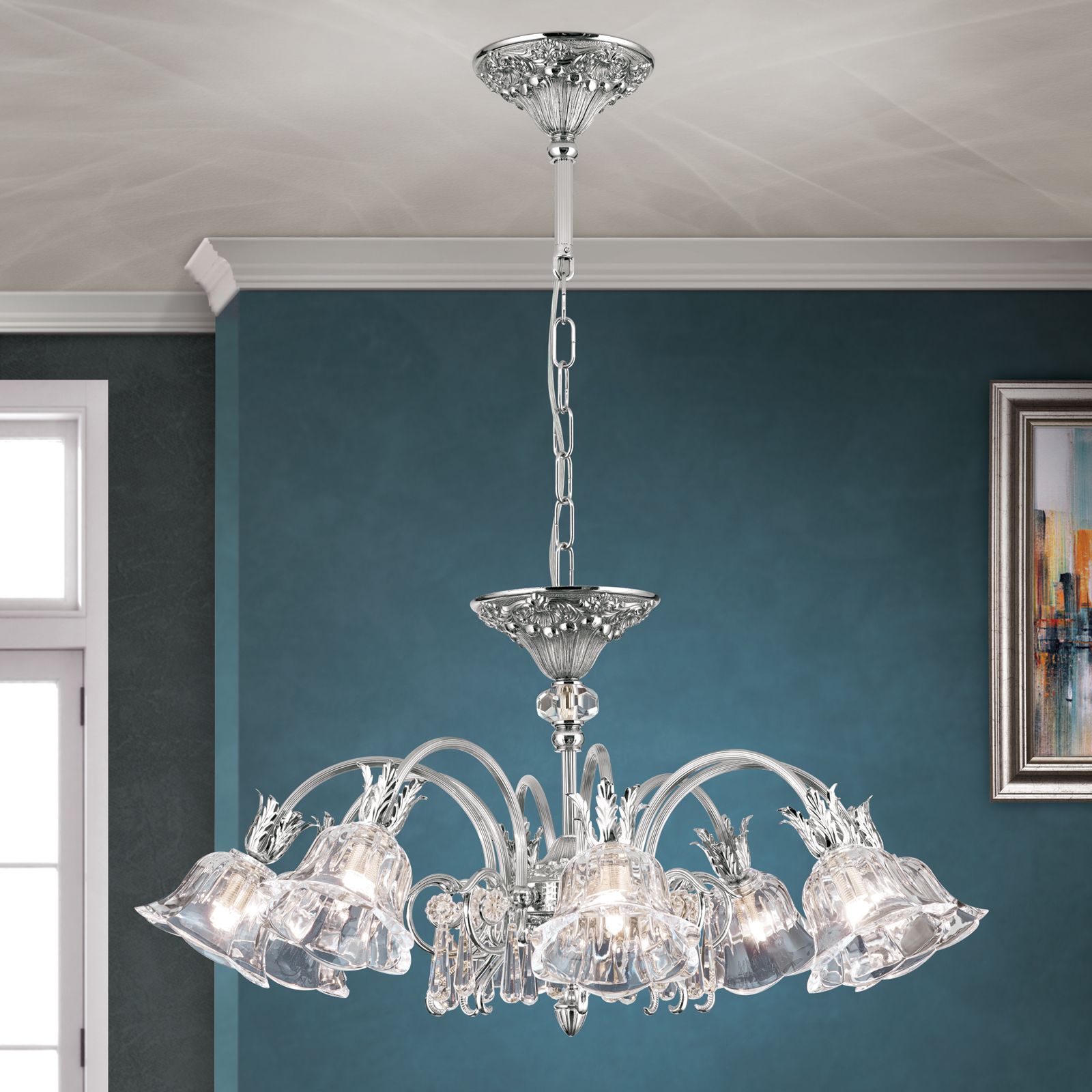An einer kunstvollen Deckenrosette hängt an einer Kette der üppig floral verzierte Kronleuchter herab. Das Gestell des Kronleuchters besteht aus Vollmessing. Die schwungvollen kannelierten Arme sind schräg nach unten gerichtet, was den Lichtradius erweitert. Besonders auffallend sind die stilisierten Akanthusblätter, die jeweils am Ende eines Armes angebracht sind. An ihnen sind klare Kristallschirme befestigt, die aufgrund ihrer gewellten Form stark an Blüten erinnern und perfekt mit dem Rest des Designs harmonieren. Der Kristallbehang aus 1A Vollschliff Kristallglas lässt ihn noch prachtvoller wirken und erzeugt schöne Lichtspiele.