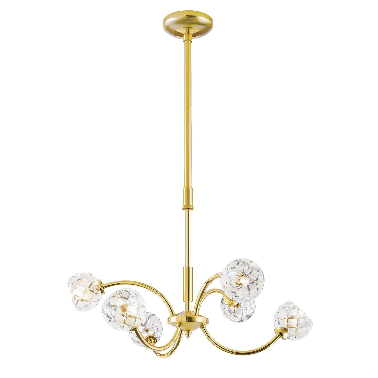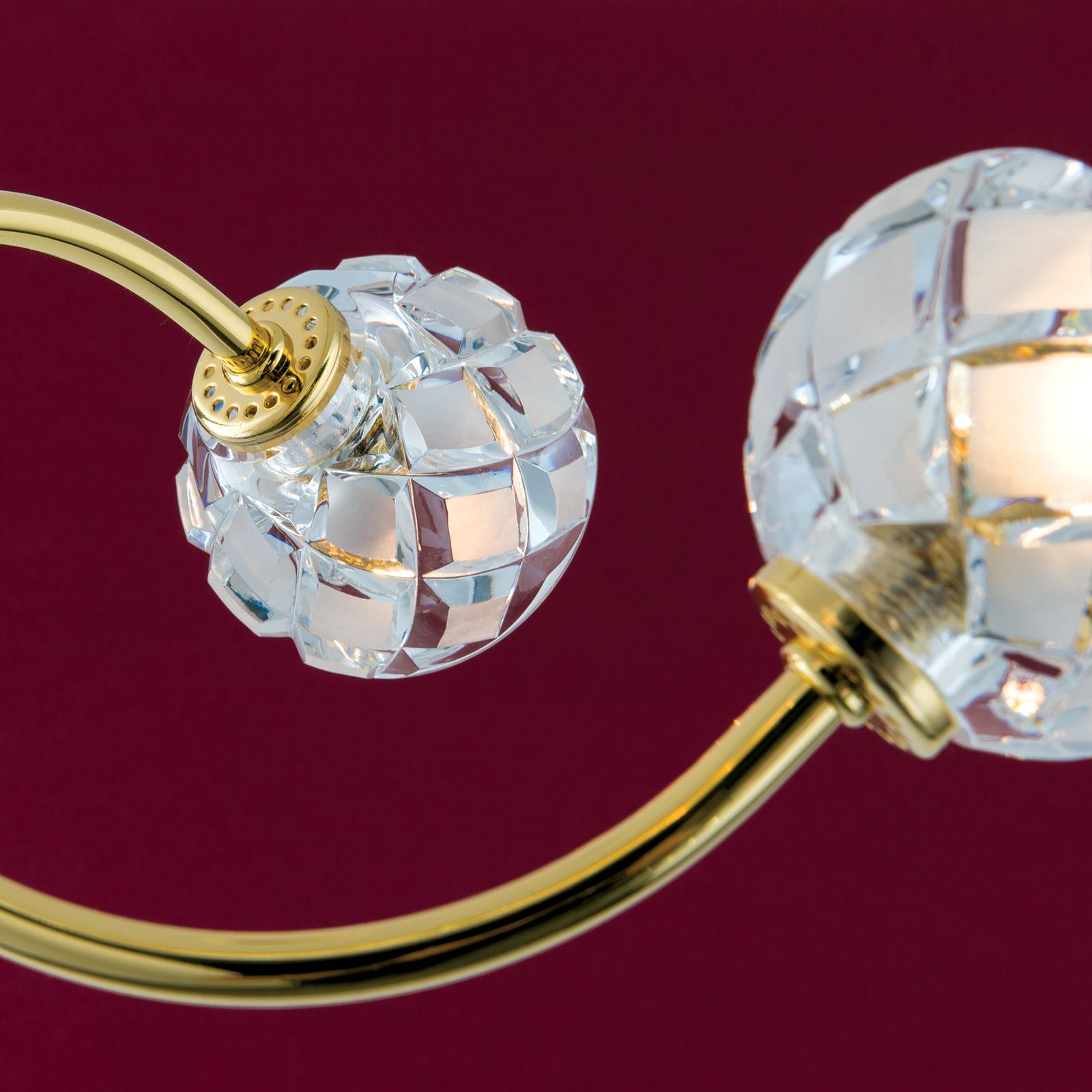 Ein Gestänge aus Vollmessing, ein Oberflächenfinish aus 24-karätigem Gold und Gläser aus Bleikristall und mit Rautenmuster, das mithilfe des Diamantschliff-Verfahrens erzeugt wurde, beschreiben den exklusiven Kronleuchter MADERNO.
