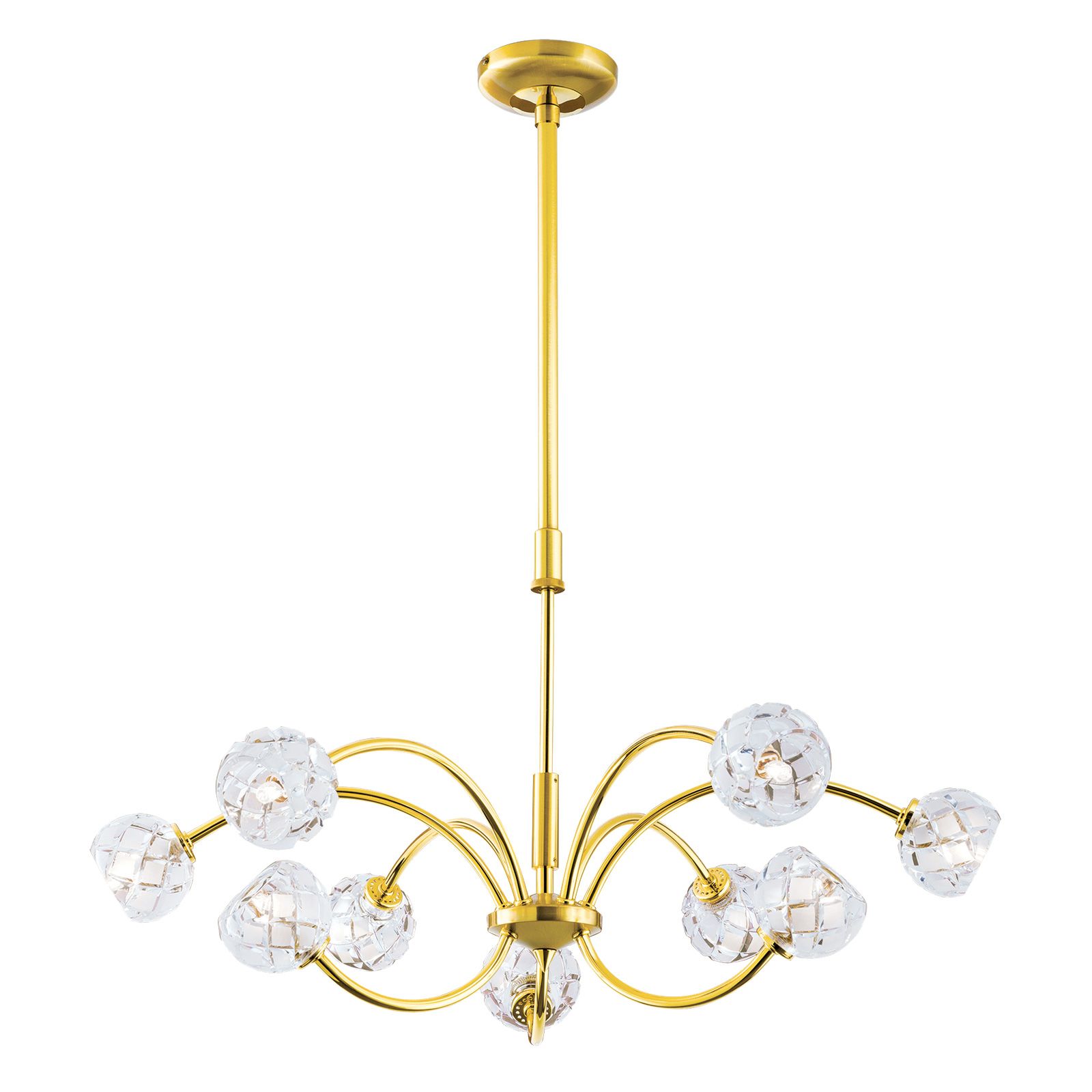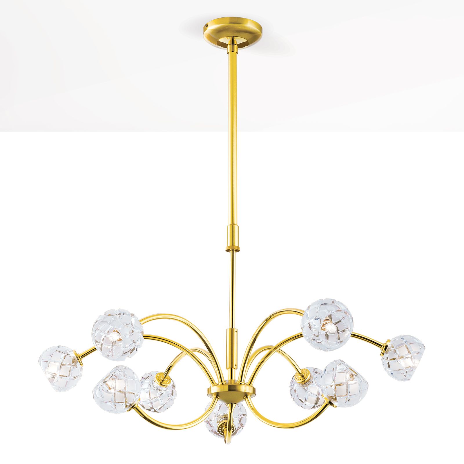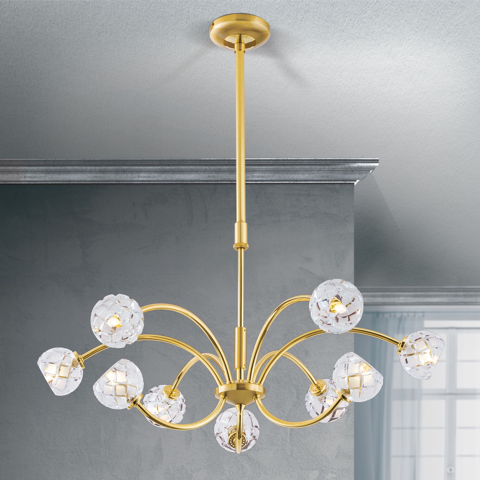 Seine 9 G9-Fassungen können mit maximal 40 Watt je Fassung ausgestattet werden und erhellen auch große Räume.