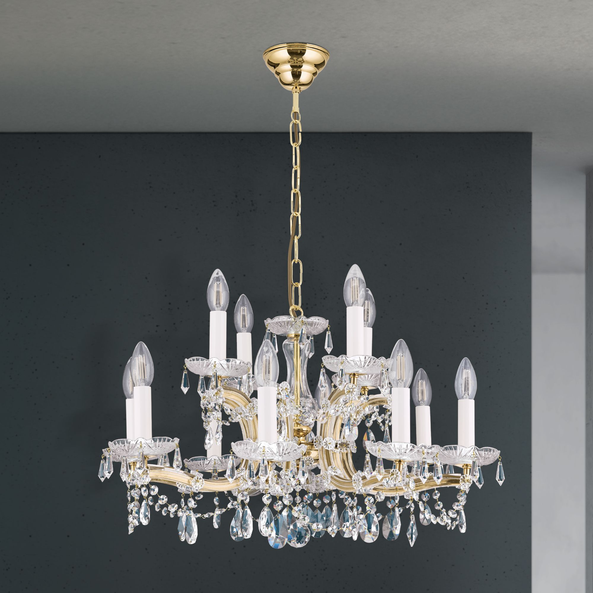 Die Serie MARIA THERESIA erweist der kaiserlichen Kronleuchtertradition die Ehre, die ihr gebührt. Stellvertretend für diesen Typus mit weit auskragenden, vergoldeten Armen steht der 12-flammige Luster. Die untere Etage mit acht Flammen bildet einen Lichtreif um den vasenförmigen Mittelschaft. Sie sorgt für eine kraftvolle und gleichmäßige Grundausleuchtung des Raumes. Die obere Etage aus vier enger stehenden Flammen strahlt zur Decke, um eine besondere Höhenwirkung des Raumes zu erzielen. Der großzügige Kristallbehang erzeugt ein funkelndes Lichtermeer. Ein großes Wohnzimmer, ein Esszimmer mit festlicher Tafel oder ein herrschaftliches Entree finden in diesem Luster einen würdigen Einrichtungsmittelpunkt. Zwölf E14-Fassungen sorgen für je maximal 40 Watt.