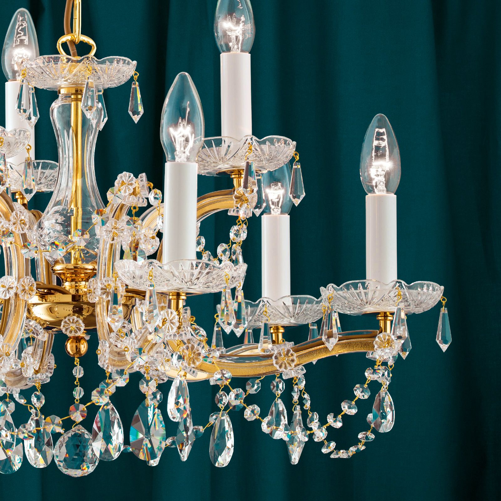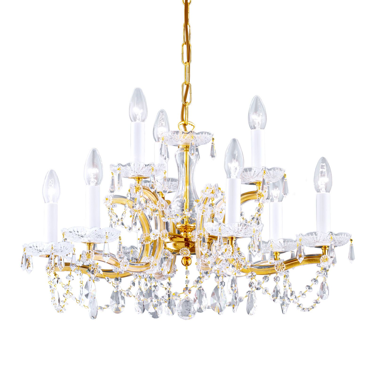 Der 9-flammige Luster aus der Reihe MARIA THERESIA entfaltet seine schillernde Eleganz in Verbindung mit Stilmöbeln und neuerdings auch als Crossover mit modernen, klarlinigen Einrichtungsstilen. Der selbstbewusste Überschwang an Glanz, Gleißen und Glitzern wird durch ein Triumvirat aus Gold, Kristall und Glas geschaffen. Das Licht fängt sich in diesem Netz des Strahlens und Widerspiegelns, um in alle Farben des Spektrums aufgeteilt wieder in den Raum zurückgeworfen zu werden. Die 2-stöckige Anordnung der Flammen sorgt für eine besonders kräftige, dichte Ausleuchtung eines großzügig bemessenen Wohnzimmers, Empfangsbereichs oder Besprechungsraumes. Der Luster verfügt über neun E14-Fassungen für jeweils bis zu 40 Watt.