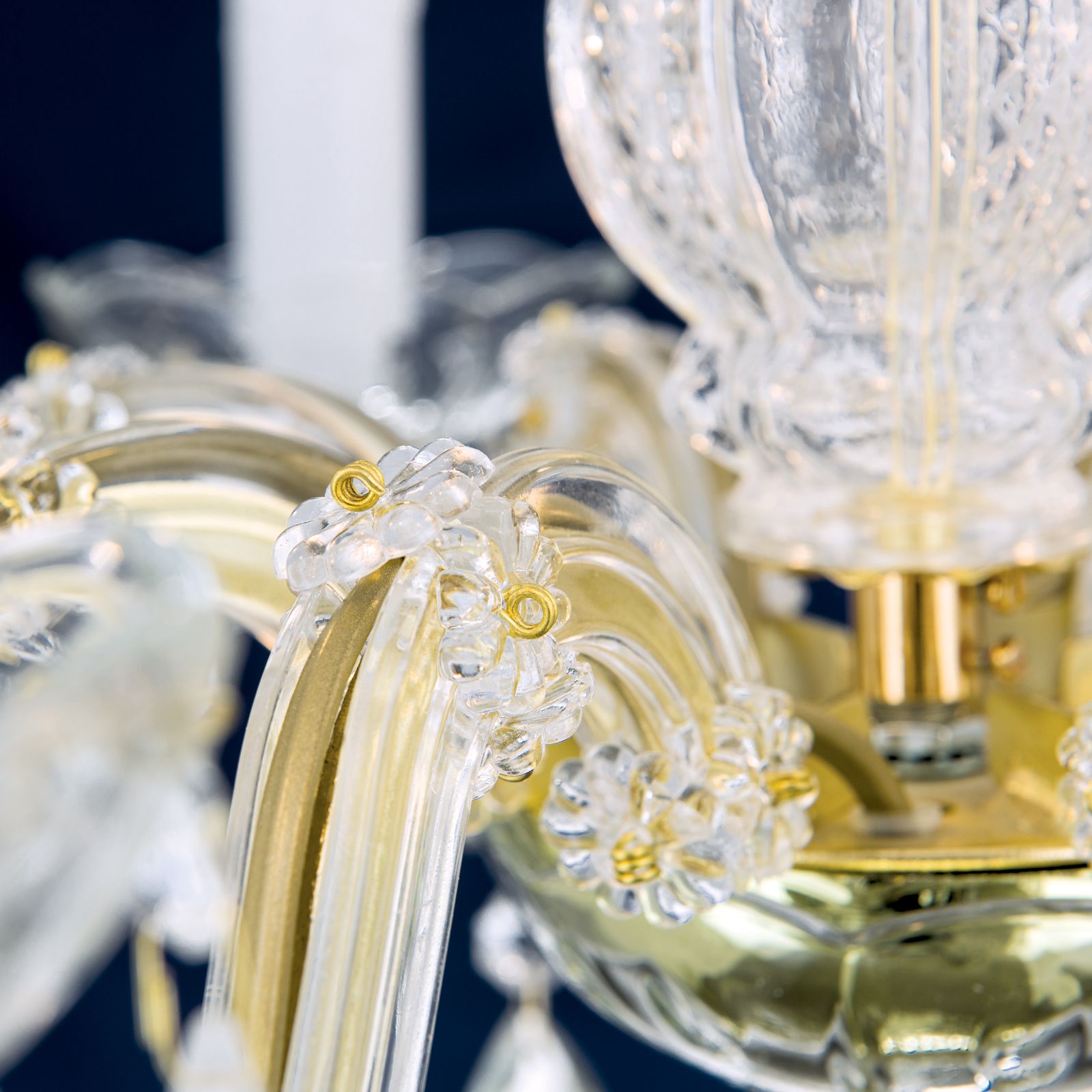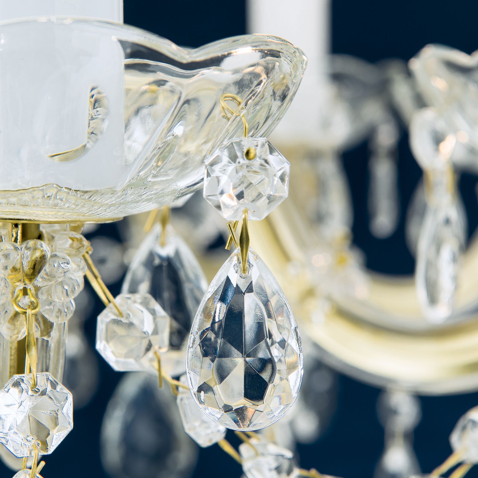 Der 8-flammige Luster aus der Reihe MARIE CLAIRE hat seinen Ursprung in der handwerklichen Tradition böhmischer Glasbläser. Die klassische Form des Kristalllusters beruht auf deren Geschick und Gestaltungskraft. Man befindet sich in einem Panoptikum des Lichtes: in Glasprismen gebrochenes und vielfarbig an die Wand geworfenes Licht, goldener glanzvoller Dekor, dazu das warme Strahlen der Kerzen (oder heutzutage der Windstoßkerzenlampen). Ein Salon mit antiker Einrichtung, Holz und Draperien wird würdig erhellt. Die acht E14-Fassungen der Leuchte liefern je bis zu 40 Watt.